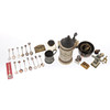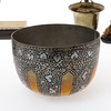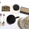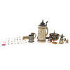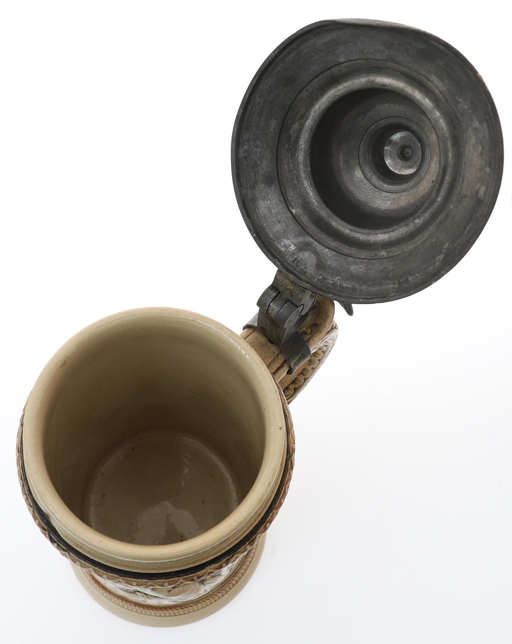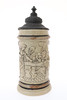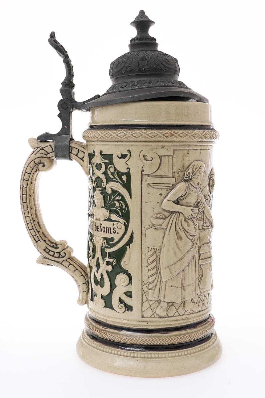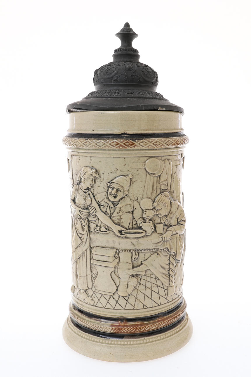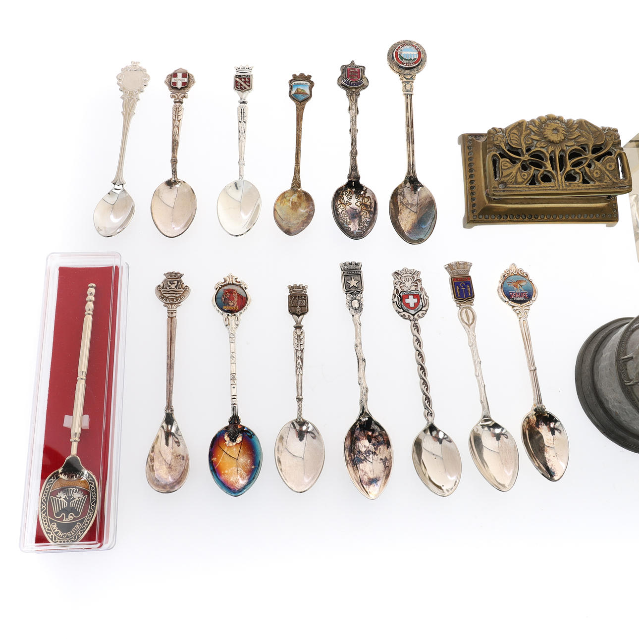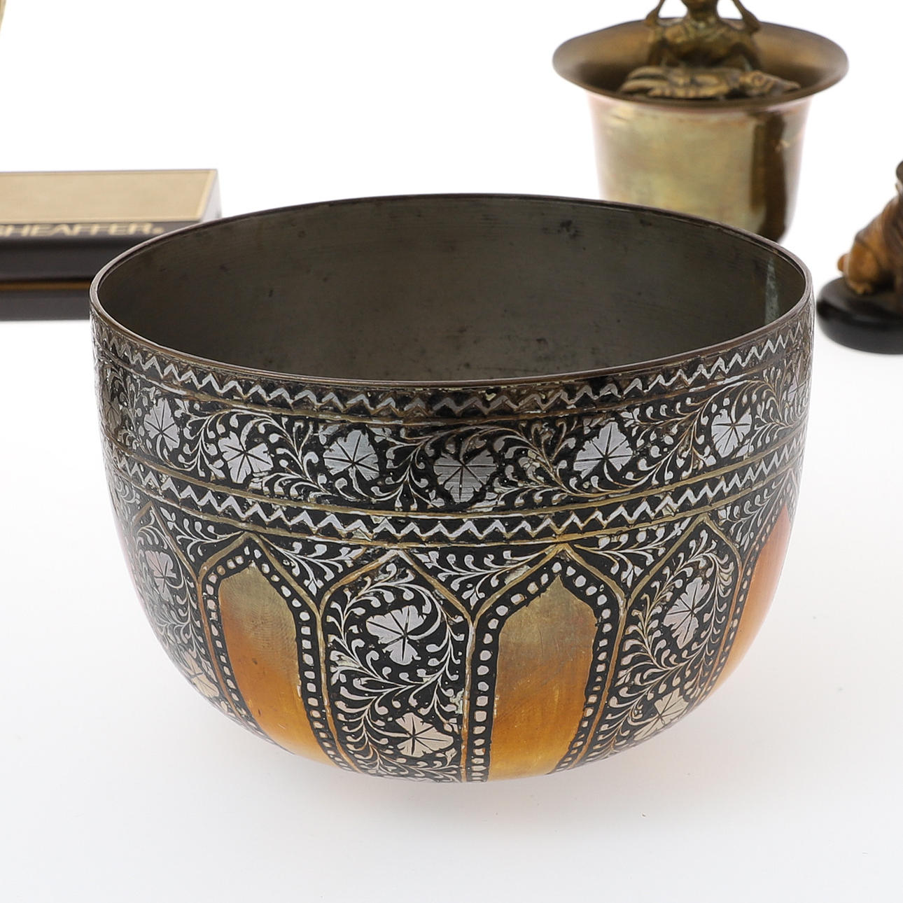 med ett kontinuerligt band av djur, träd och figur, 8,5 cm hög, en blandad metall niello foliate dekorerad skål, 11.5cm diameter x 7.5cm hög, Edwardian block glas inkwell, med svart opalin glas infälld gångjärn lock, 7cm kvadrat, gjuten mässing stämpel box, 8cm bred, asiatisk gjuten mässing menorah, 14,5 cm bred, asiatisk gjuten mässing siffra stödja en annan i sina armar, 13cm hög, snidad hornfigur av en hund, 6cm hög, tretton miniatyrförgyllda metallknivar, gafflar och skedar, i ett bestickbricka, slutet av 1800-talet, Sheaffer borstat stål reservoarpenna, hölje, Parker reservoarpenna, Colibri och Ronson tändare, samling souvenirskedar, tysk keramisk sten och rester av tätningsvaxuppsättning (antal)