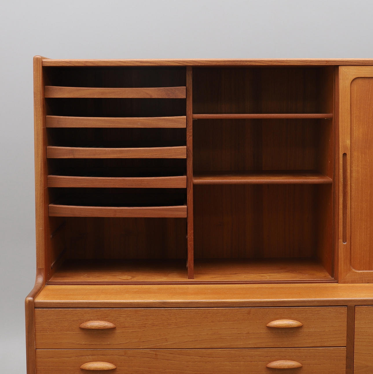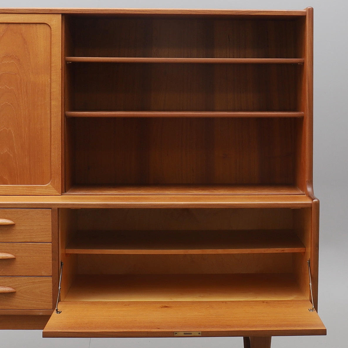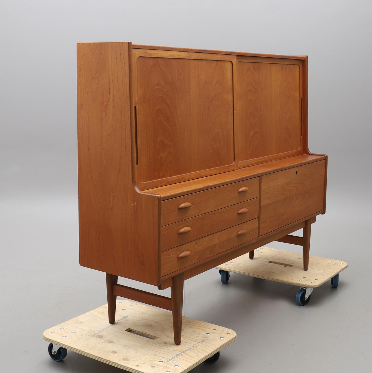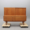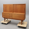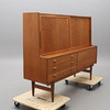 Skjutdörrar med bakomliggande hyllplan, 3 draglådor samt en utfällbar skiva. Höjd 139, djup ca 49, längd 174 cm.