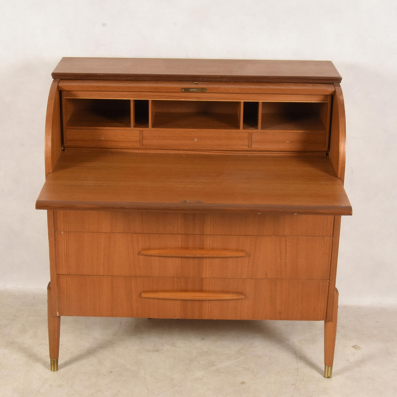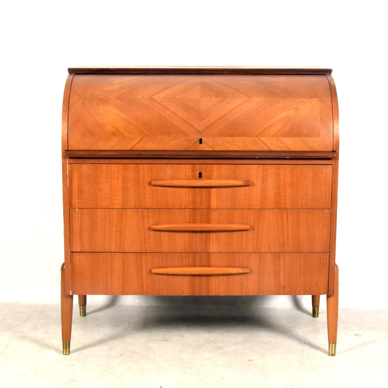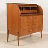 Inre lådor saknar knoppar, Fanérskador och slitage förekommer.