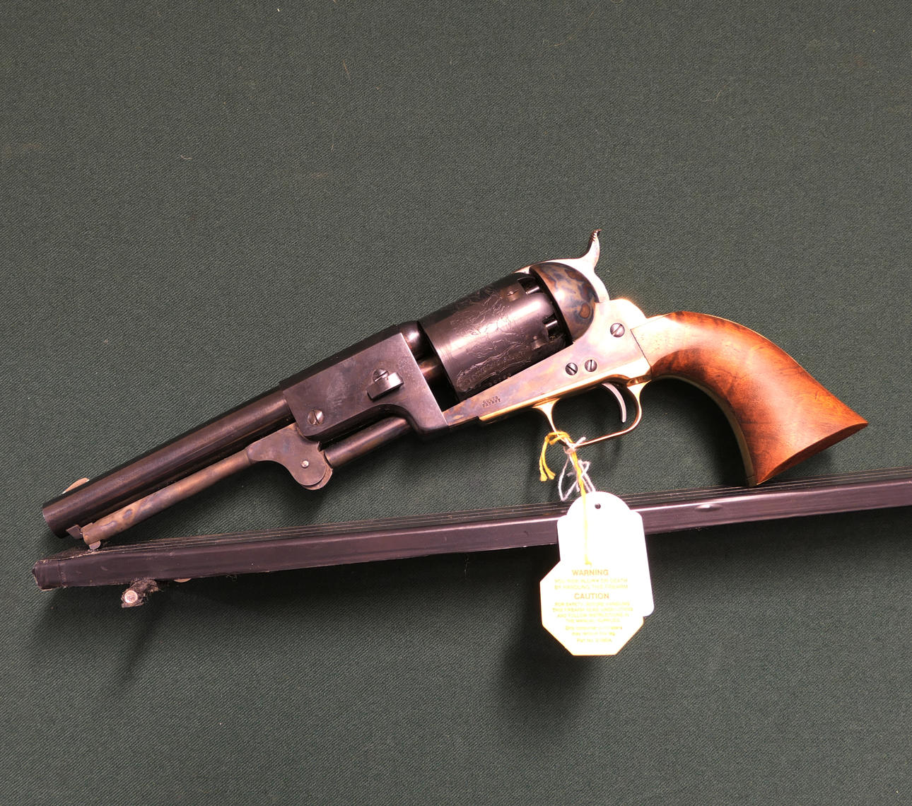 Revolver Amerikansk Fabrikat. Colt Model 3rd model Dragon. Kaliber 44 Slaglås. Tillv.nr.30723. Piplängd 19cm. Fast sikte. Flamhärdad stomme. Graverad trumma. Kolvsidor av trä. Original kartong medföljer.