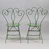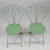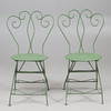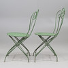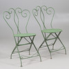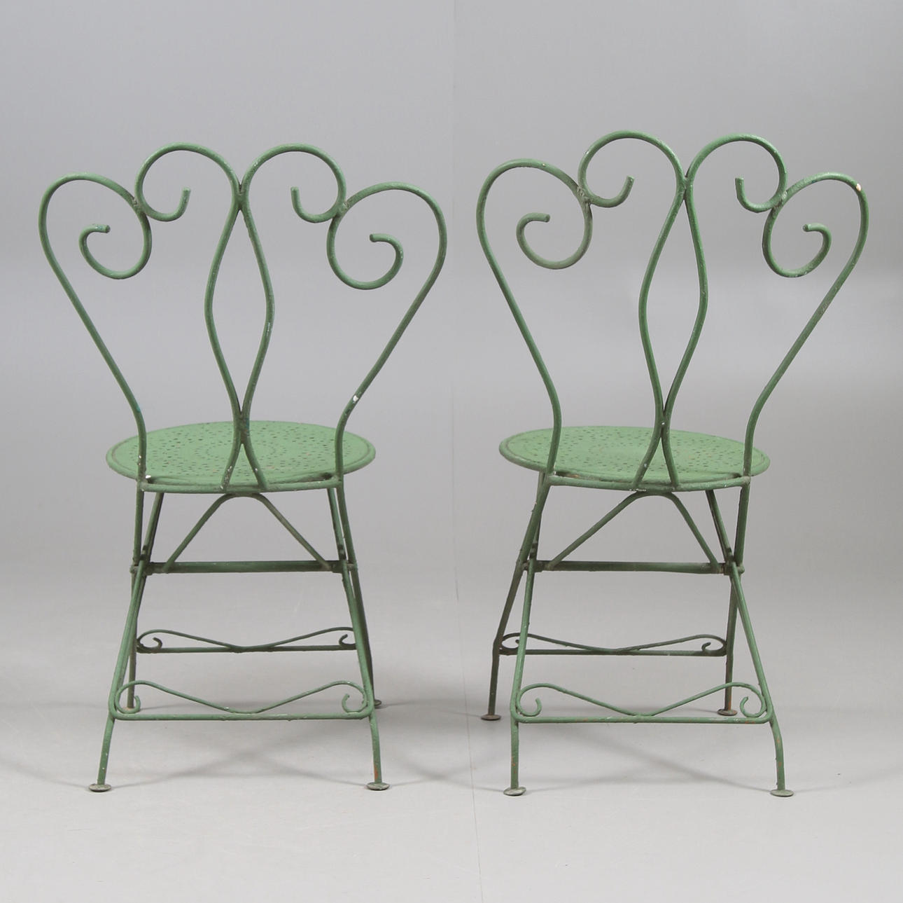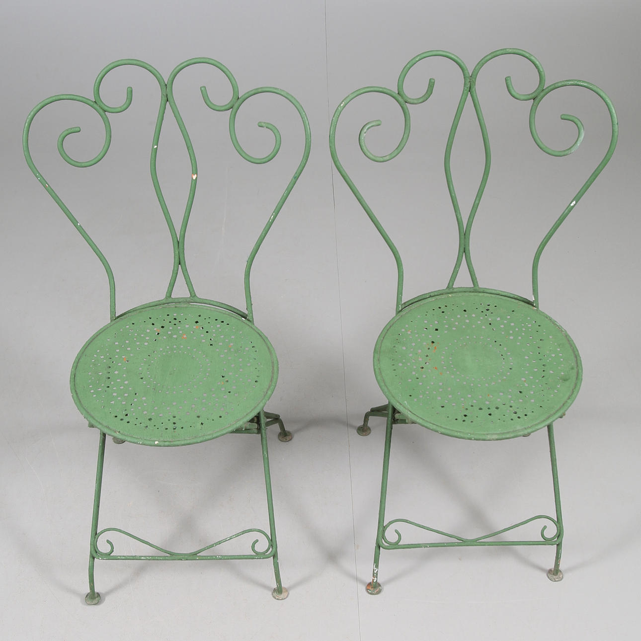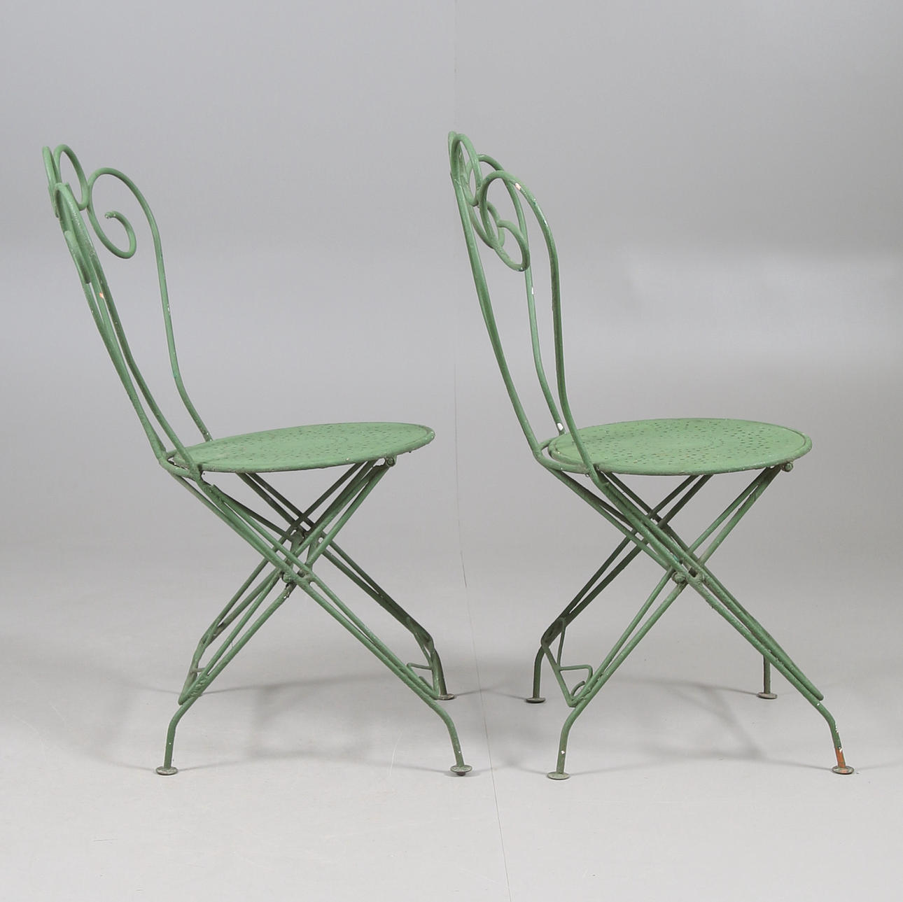 Stomme av smide, sits av perforerad plåt. Ihopfällbara. Rygghöjd 92, sitthöjd 32 cm.