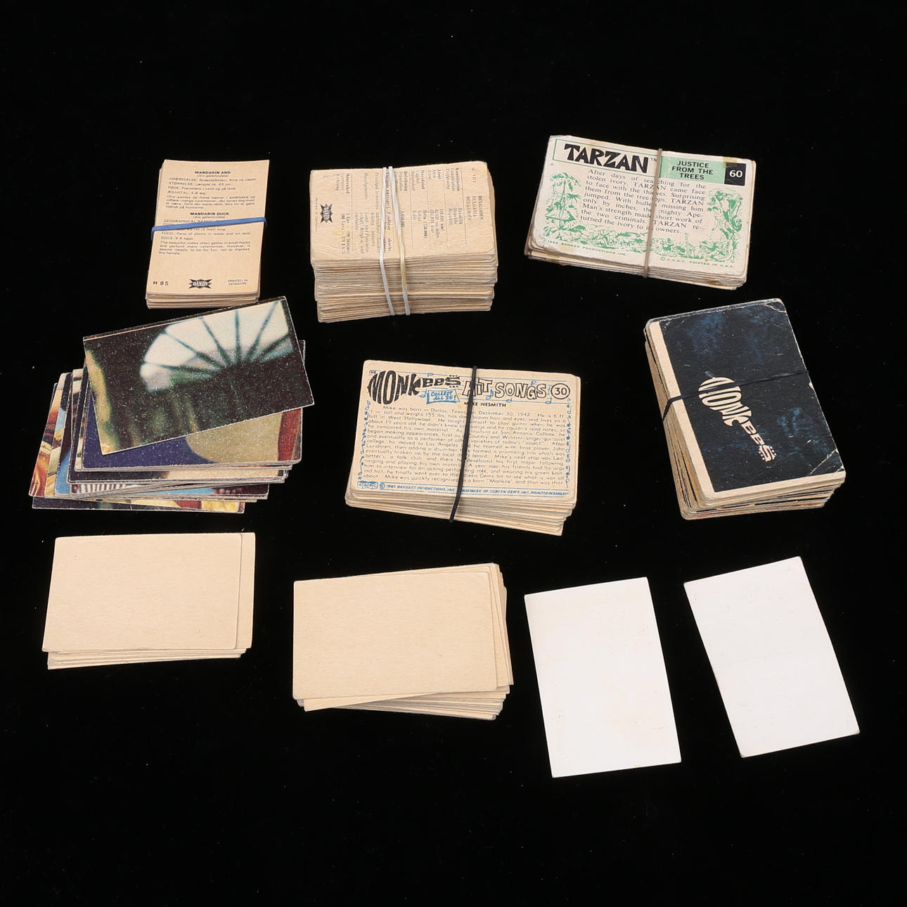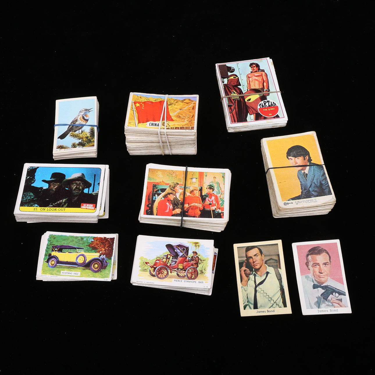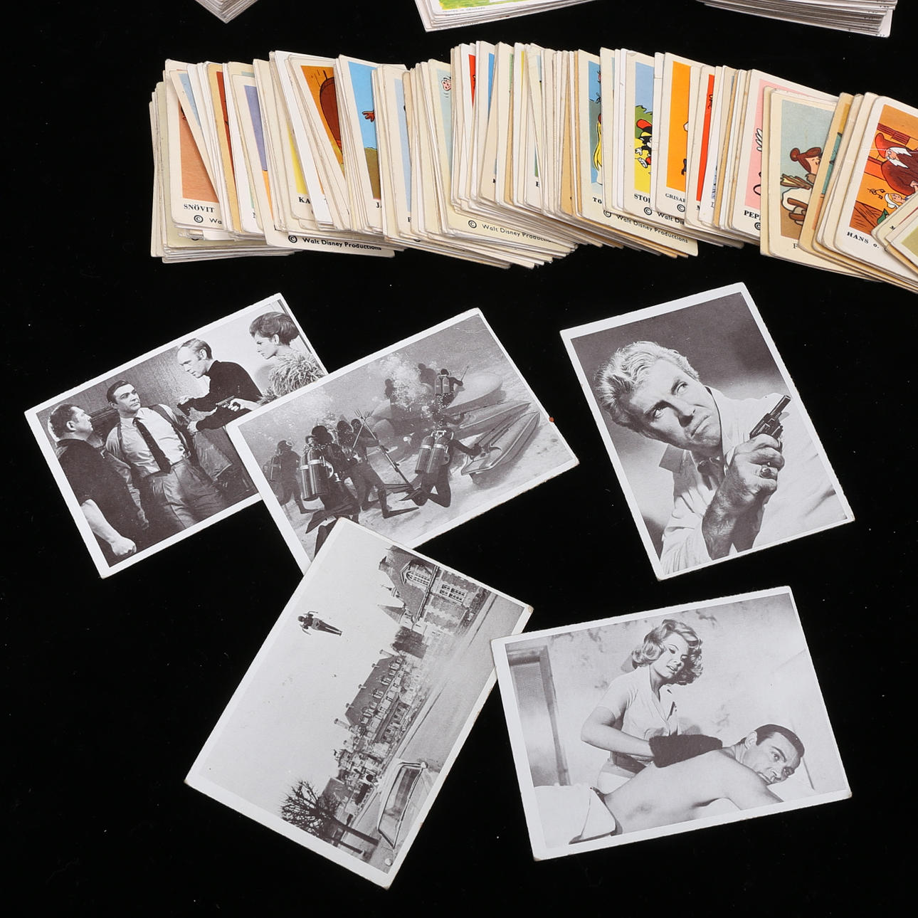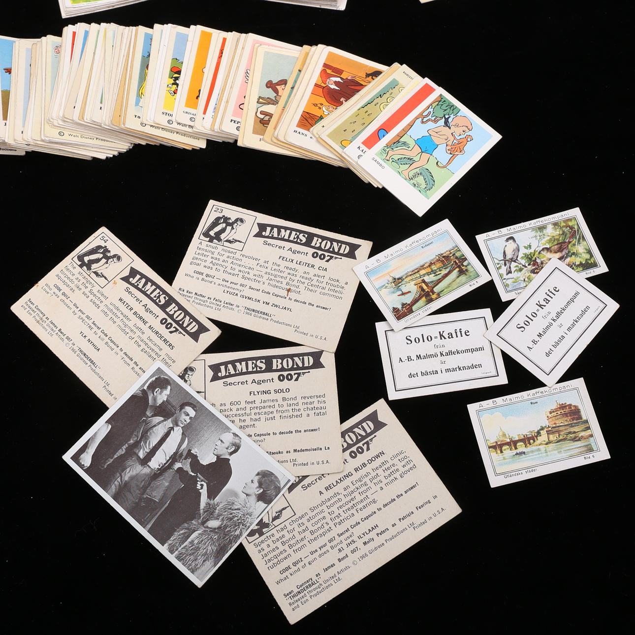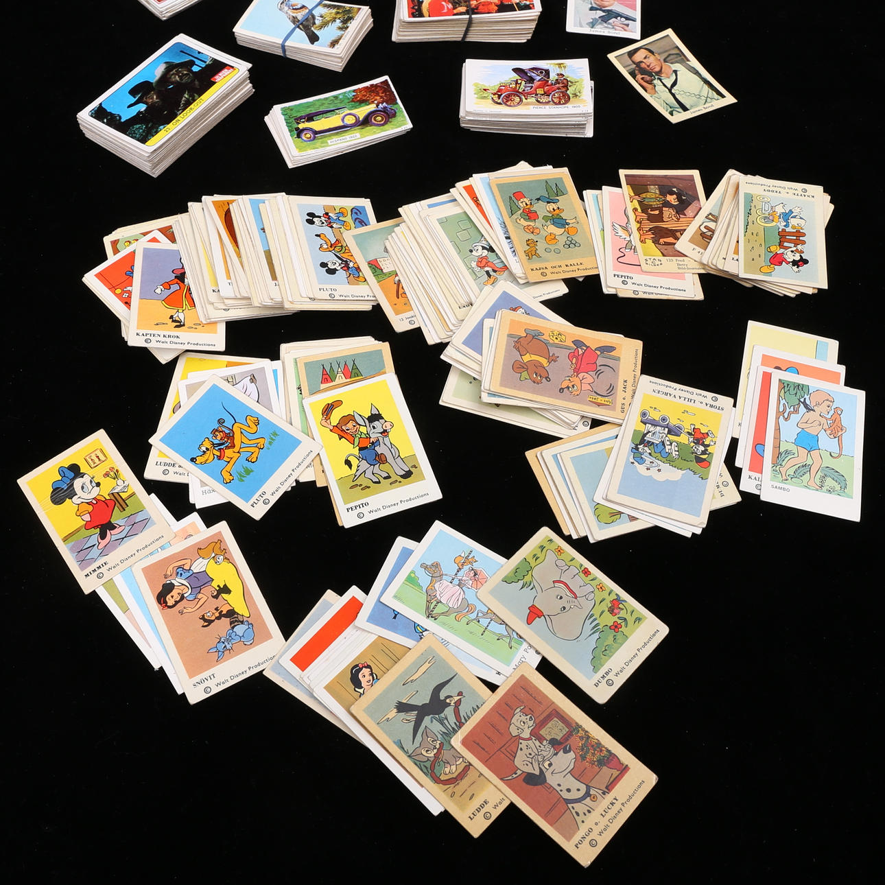 Ca 300 st, bla James Bond, bilmotiv, Disney, Familjen Flinta, Monkees, Dandy.