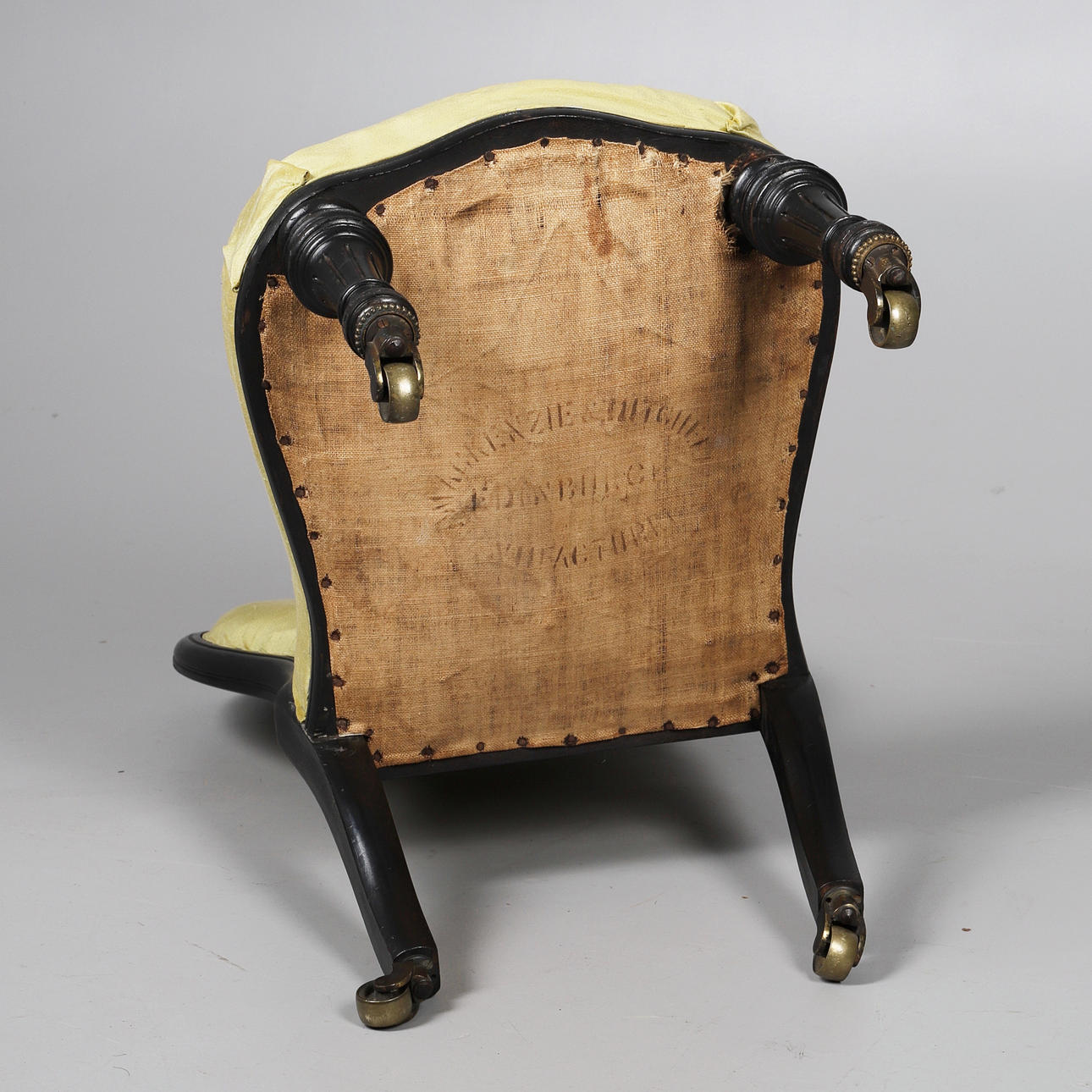 Rundad ram med snidade rullande acanthus ovanför en formad stoppad sits, upphöjd på snidade och räfflade framben samt hjul i mässing. Undersidan stämplad ”MACKENZIE & MITCHELL, EDINBURGH. MANUFACTURES”.