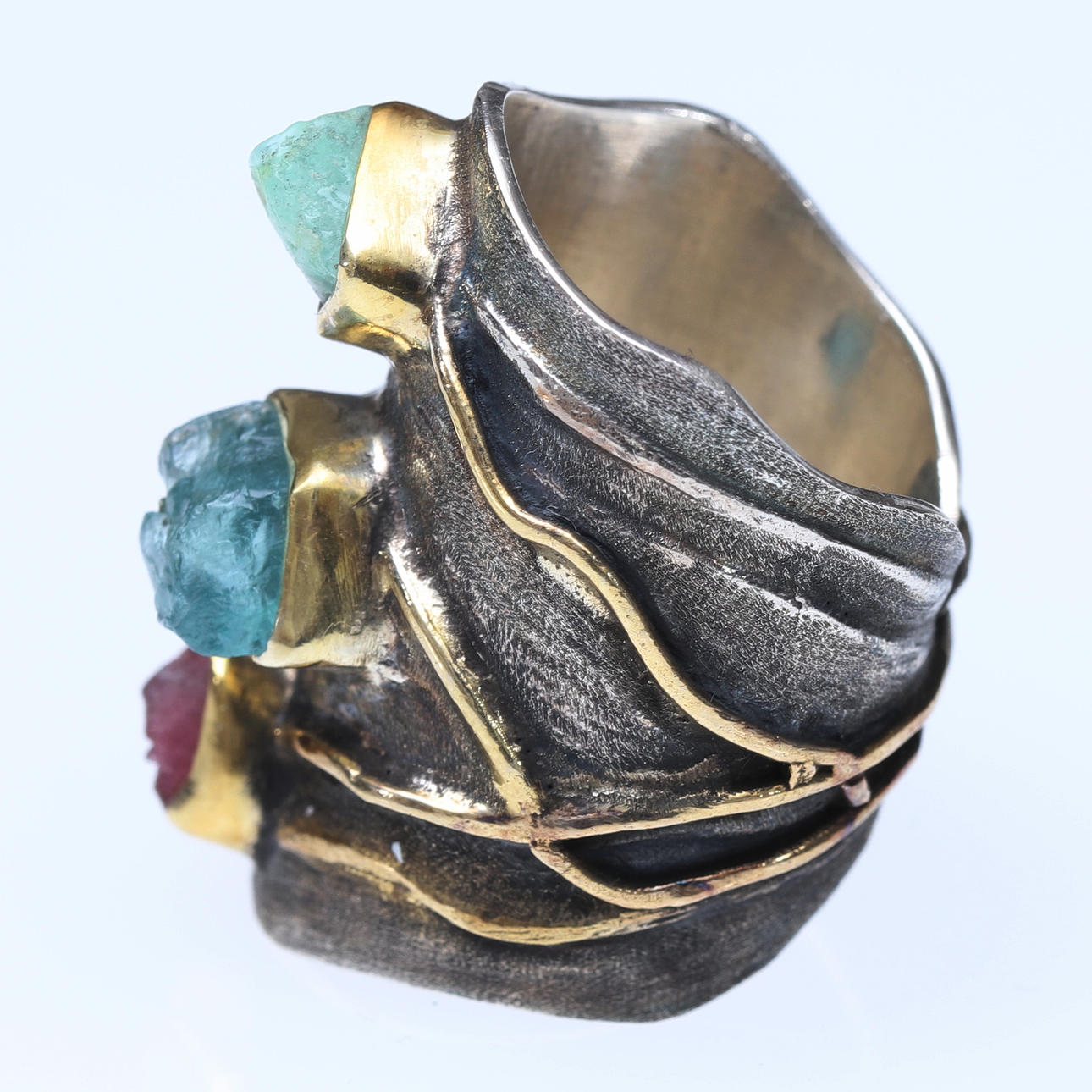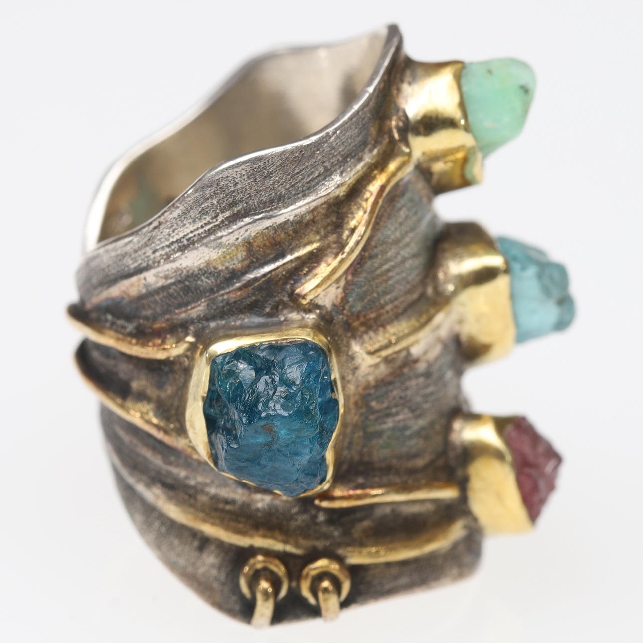 Borstad och förgylld 925 silver med fyra olika råa ädelstenar; rubin, turmalin, akvamarin och smaragd.