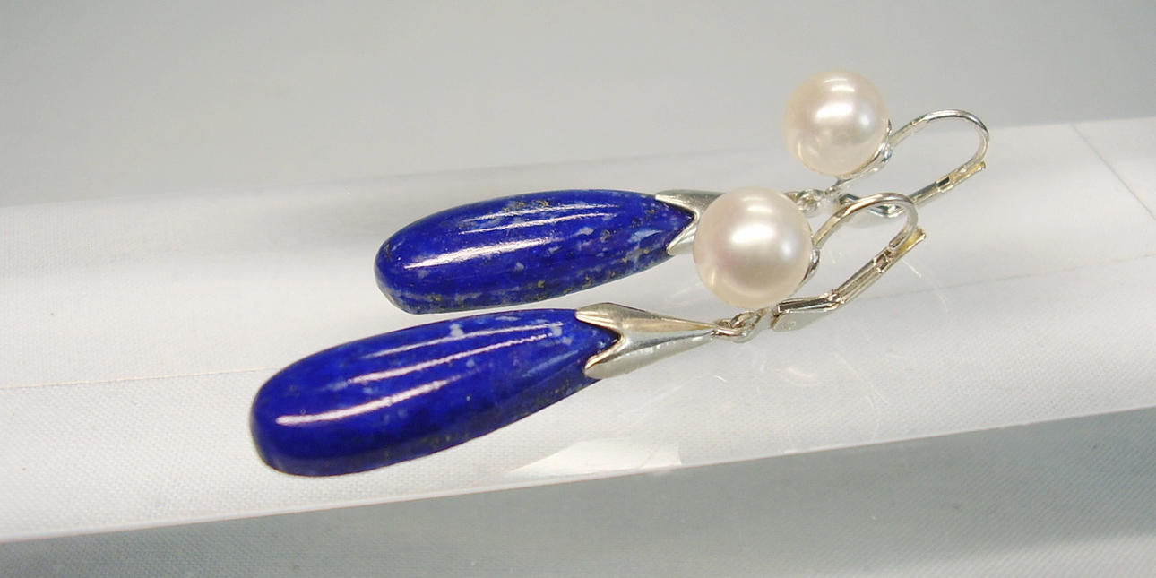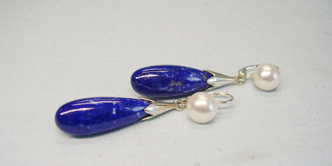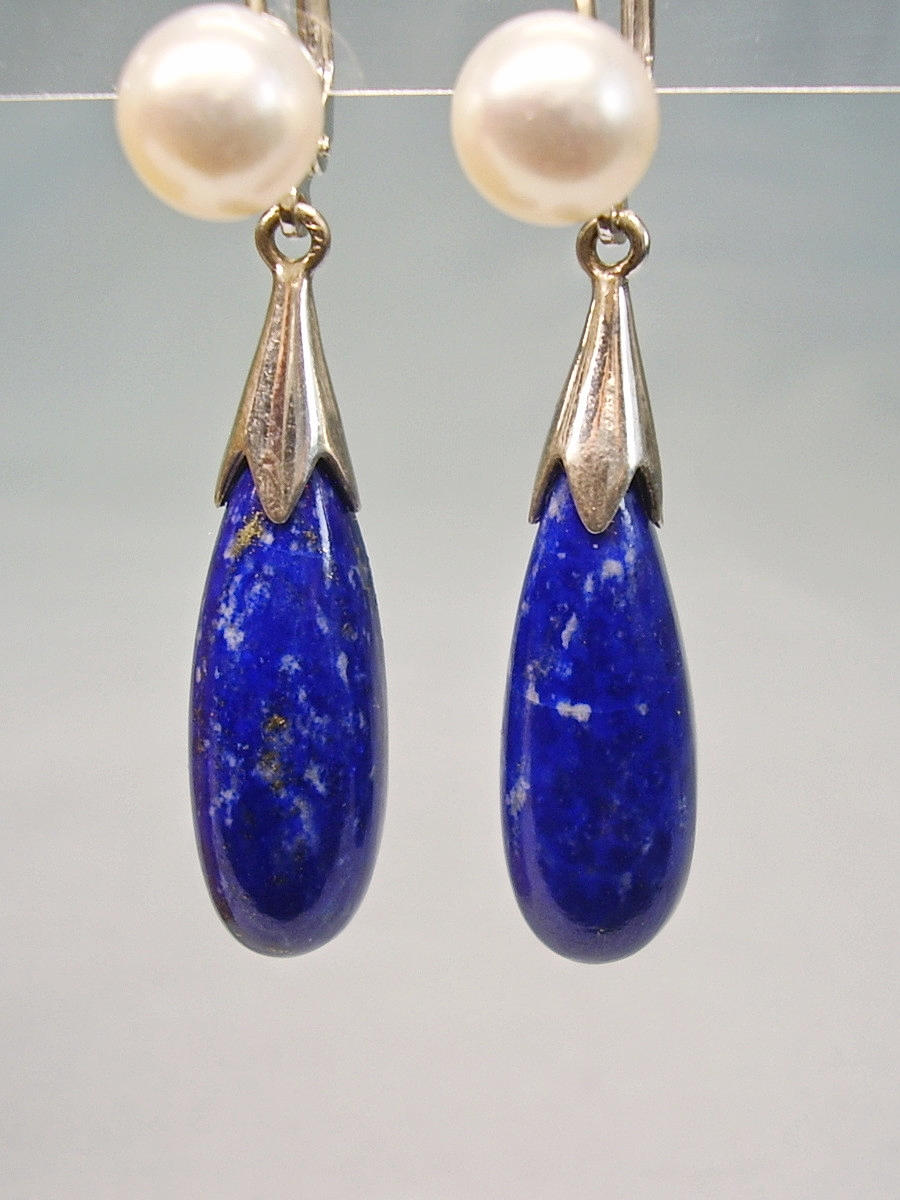 Öronkrokarna är dekorerade med riktiga vita odlade pärlor, och polerade lapis lazuli-droppar är rörligt upphängda från dem.