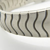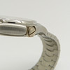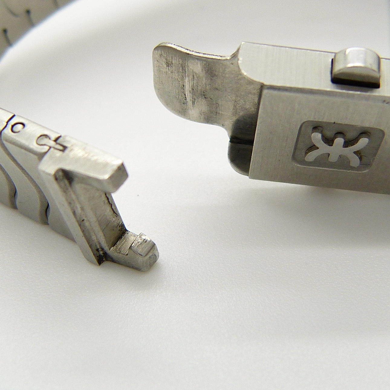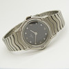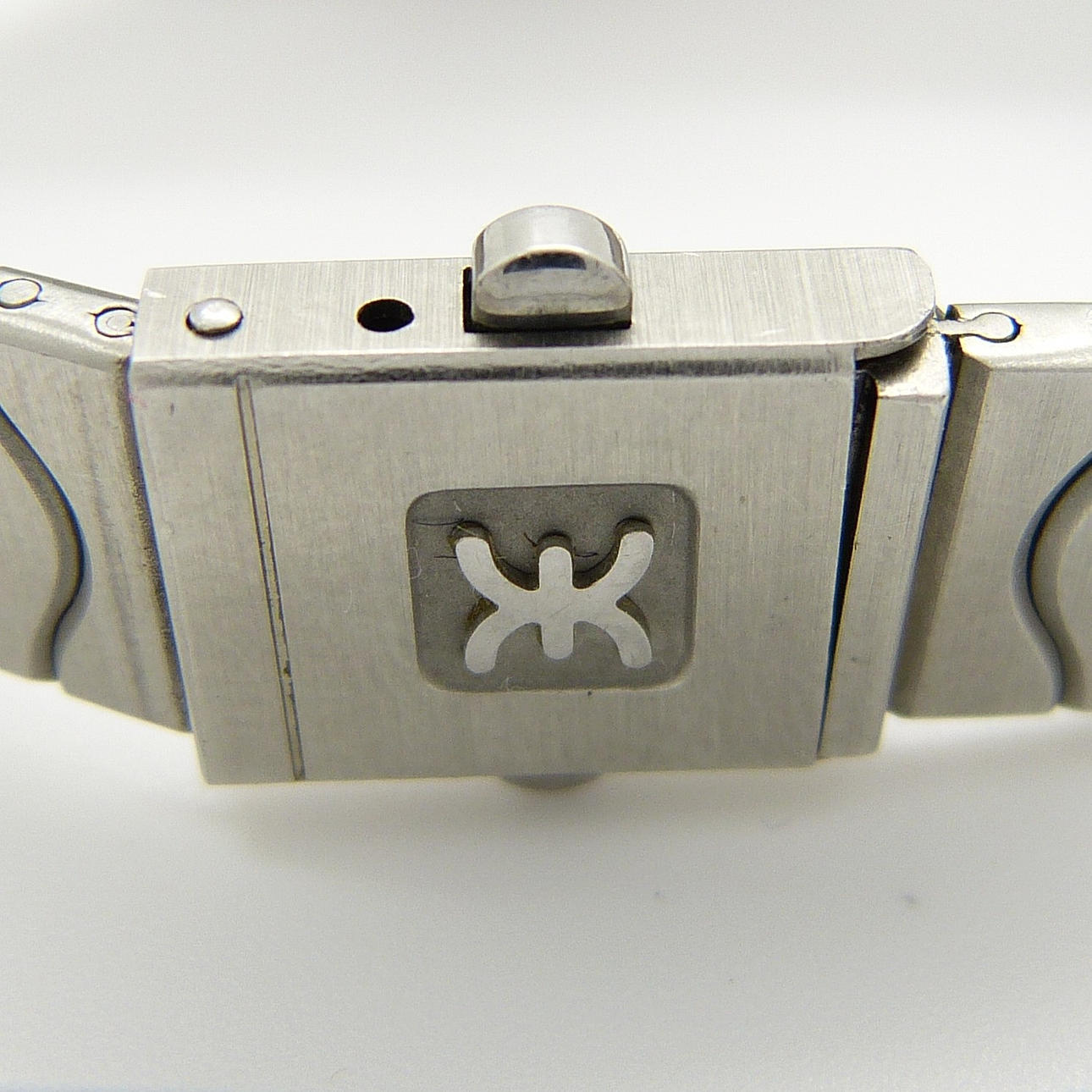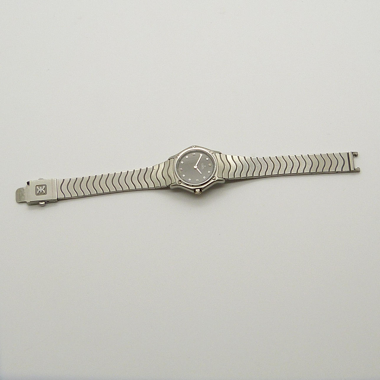 Klockarmbandet är rostfritt stål i en ”wave style”, med ett tryckknappsöppningslås.