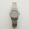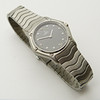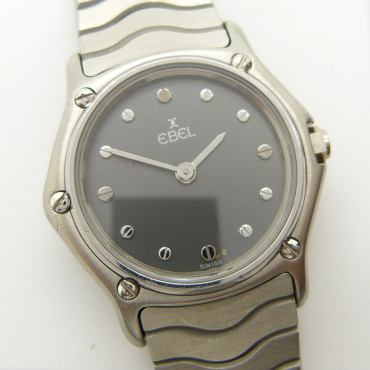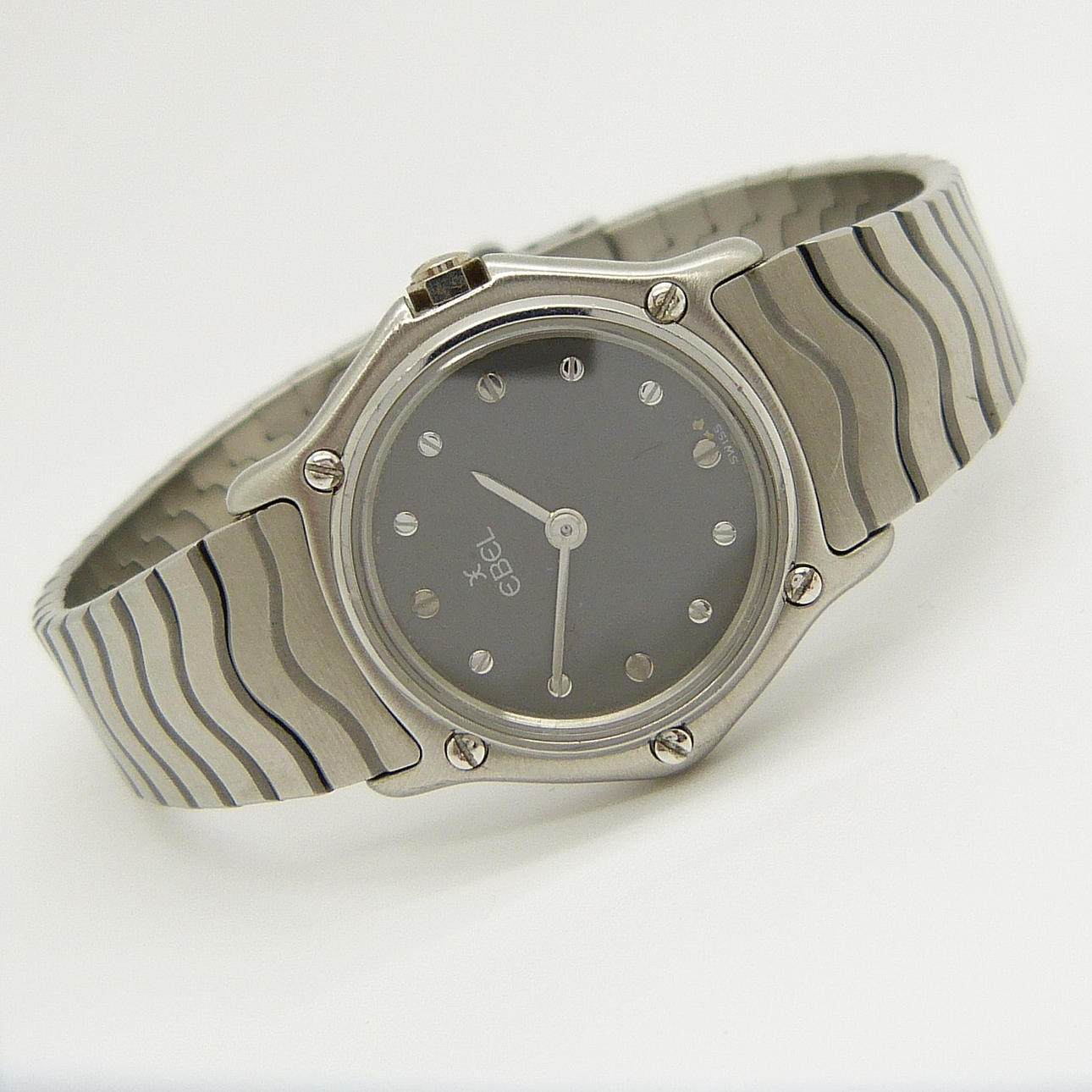 Ett schweiziskt gjort damkvarts Ebel rostfritt stål armbandsur med svart urtavla, skruvmarkörer och tryckknapplås.