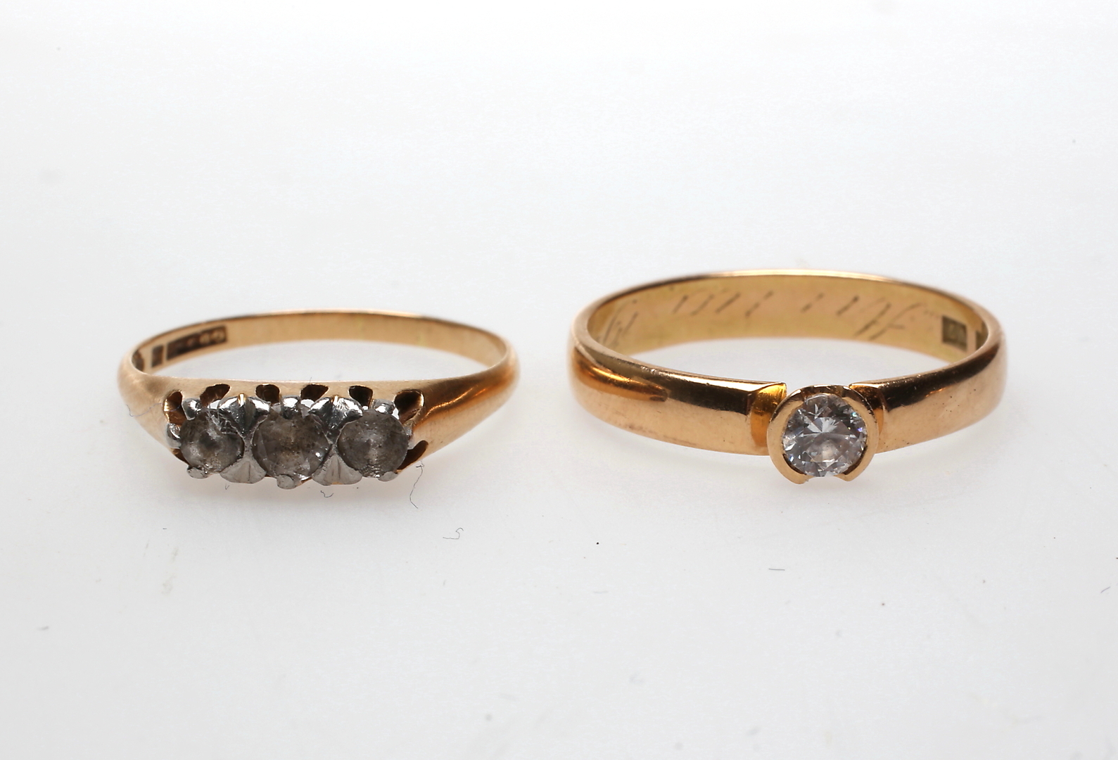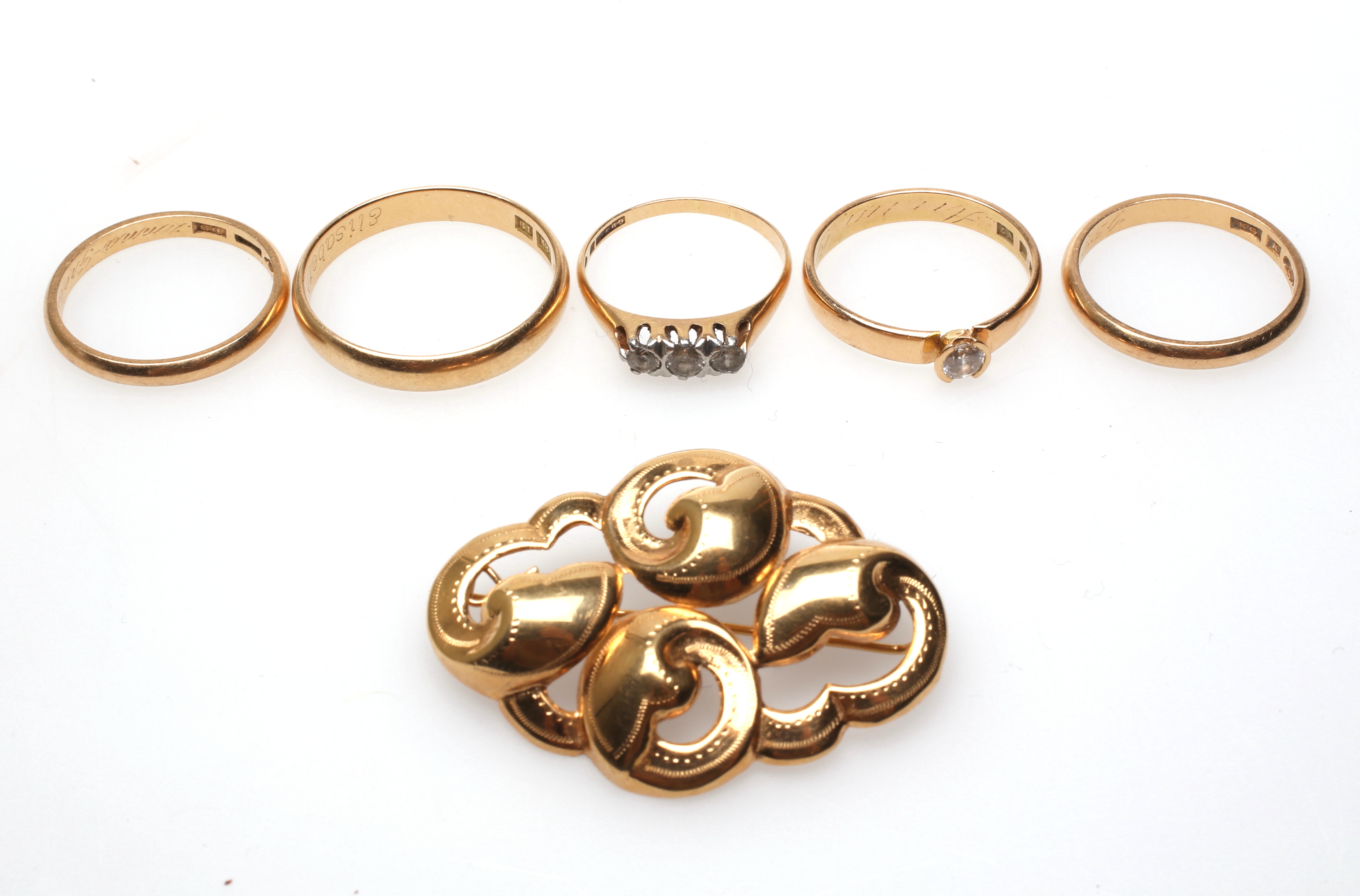 167949. GULDFÖREMÅL, Ringar samt brosch, 18 k.