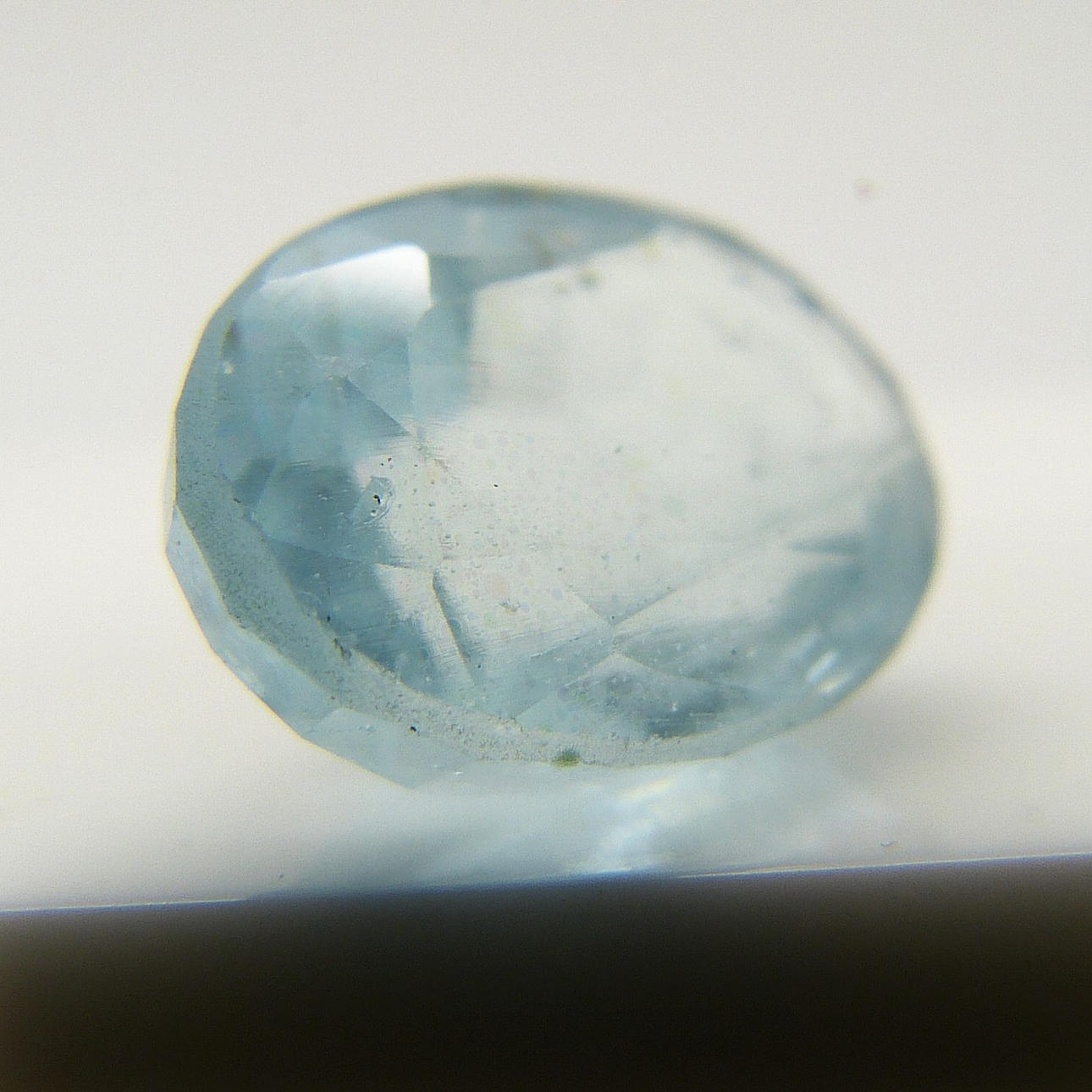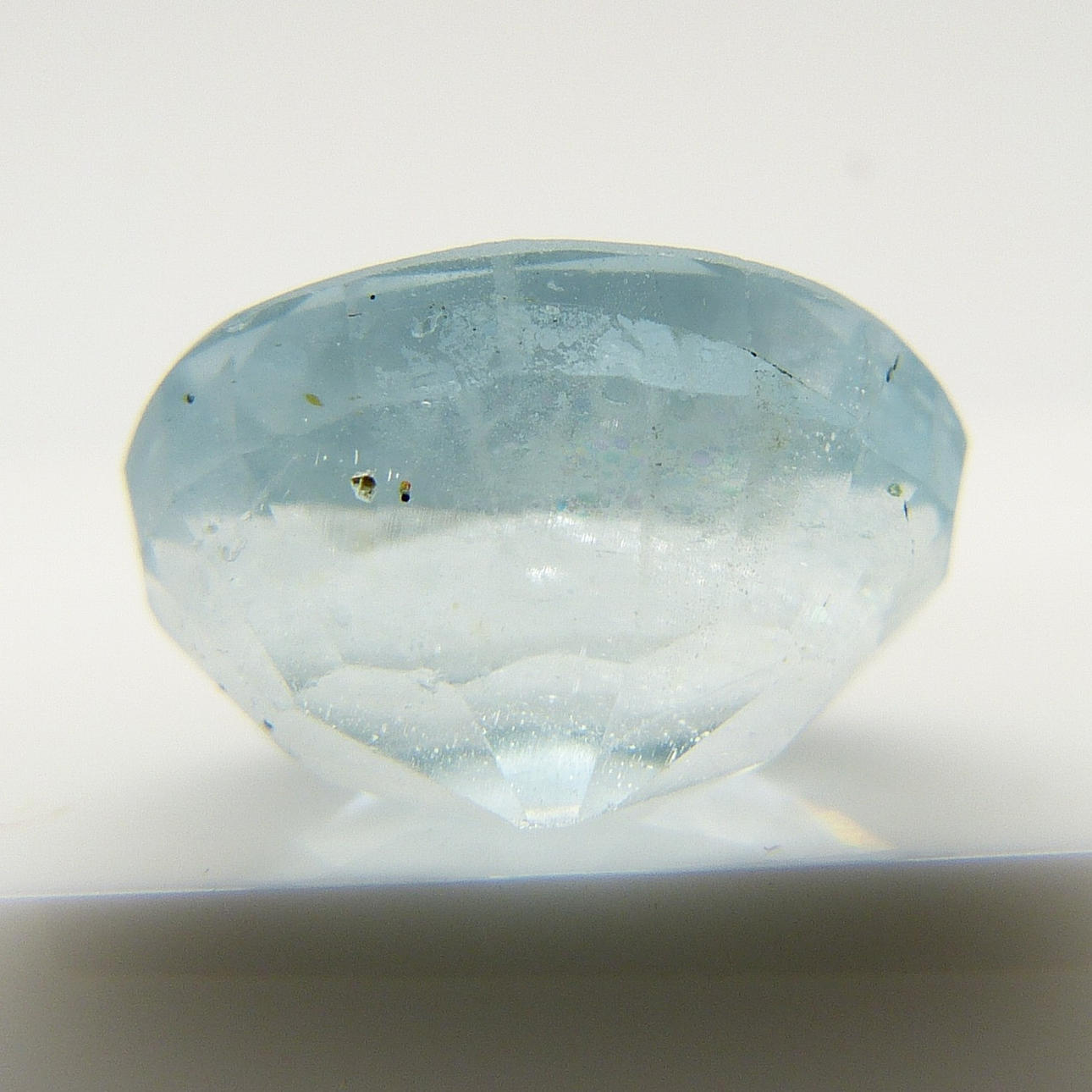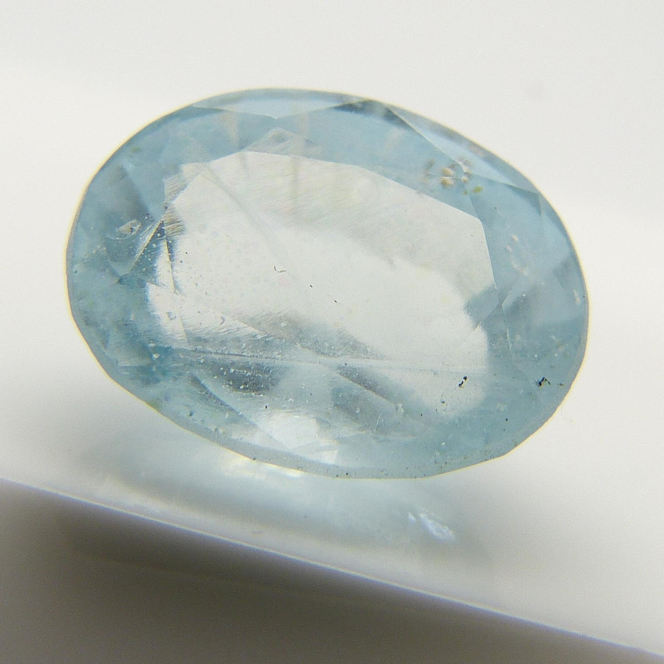 Denna akvamarin är naturligt bristfällig, med en ljusblå färg och något ogenomskinlig reflektion.