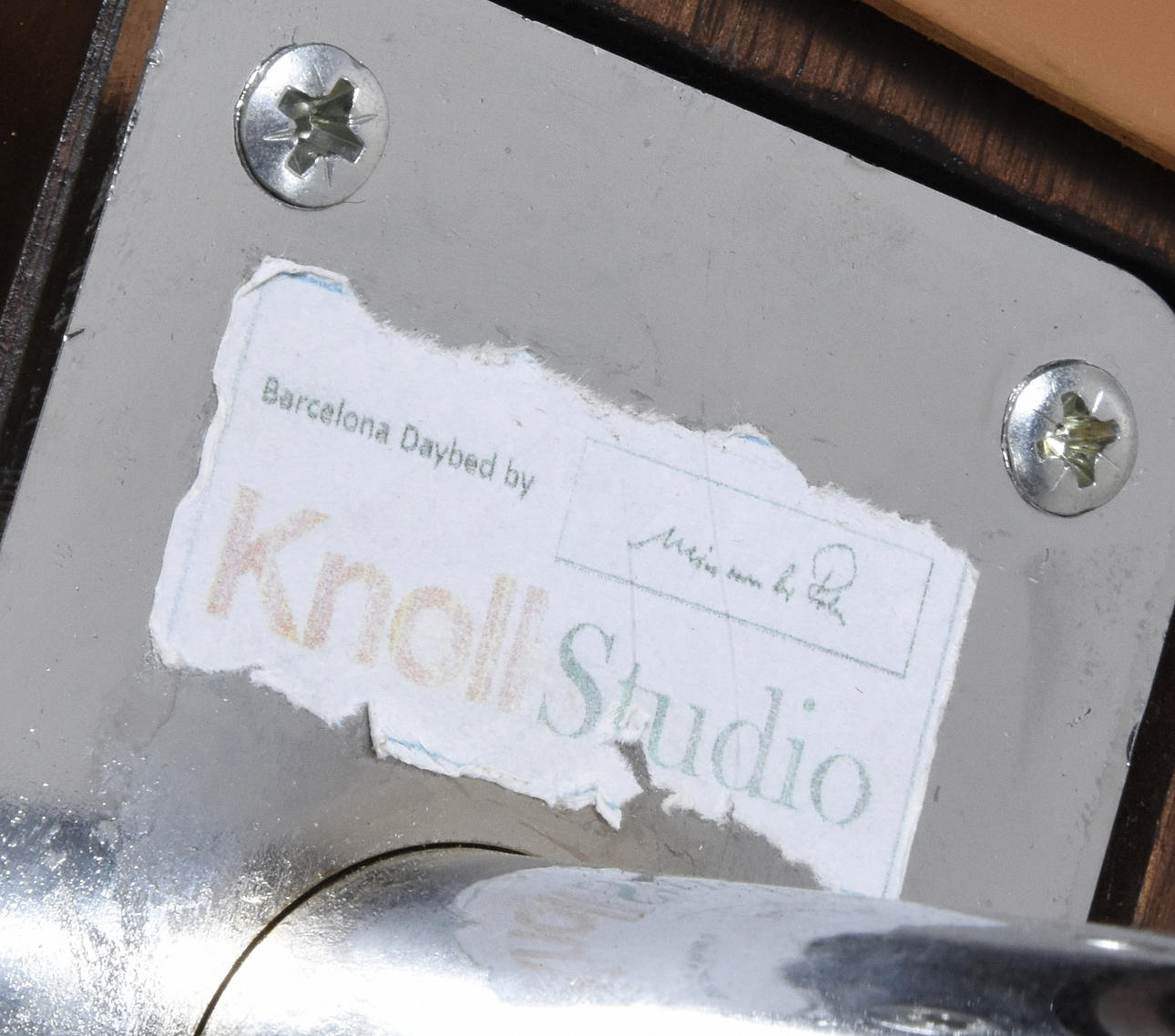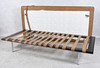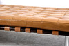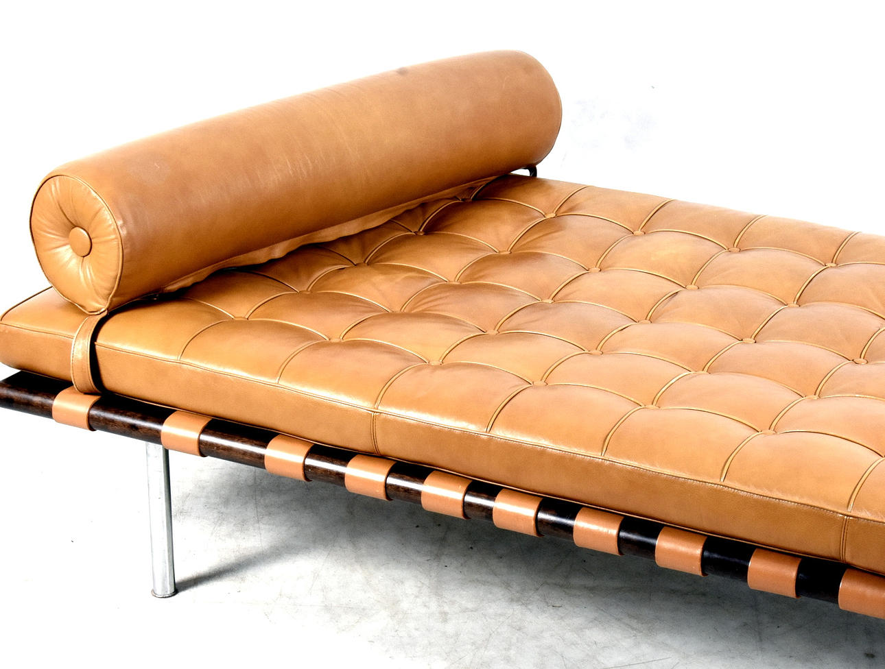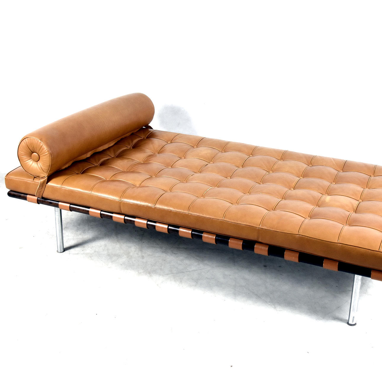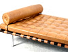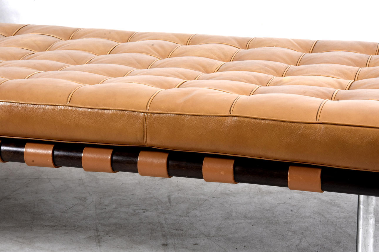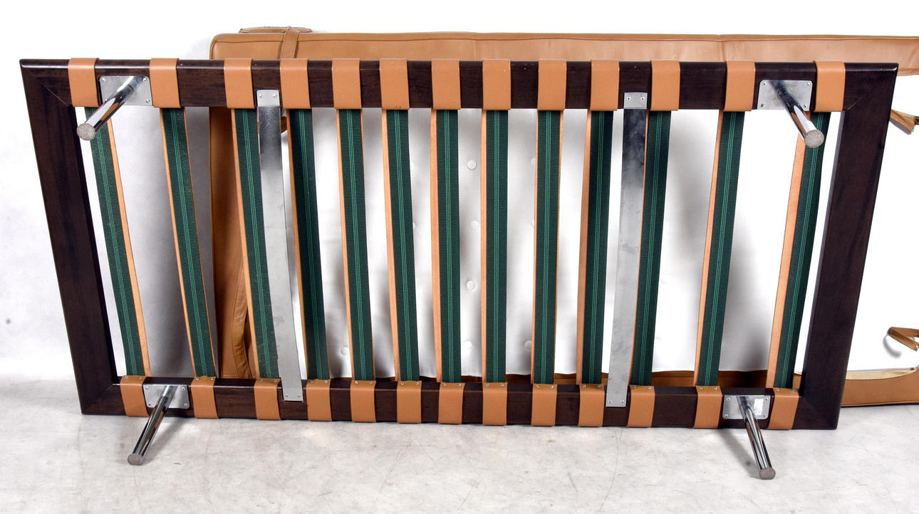 Längd 195 cm, bredd 100 cm, höjd utan kudde 40 cm Dagbädd av stål, klädd i läder, bärremmar av kärnläder Etikettmärkt Barcelona Studio Knoll.