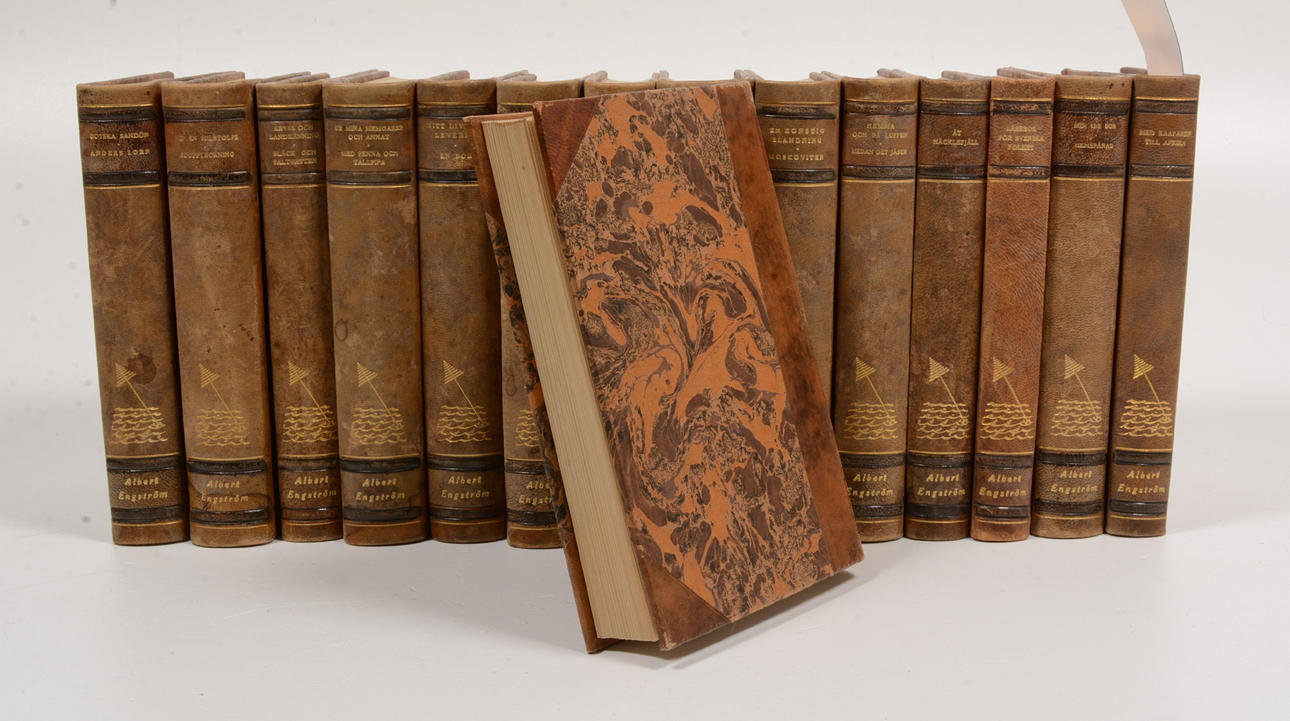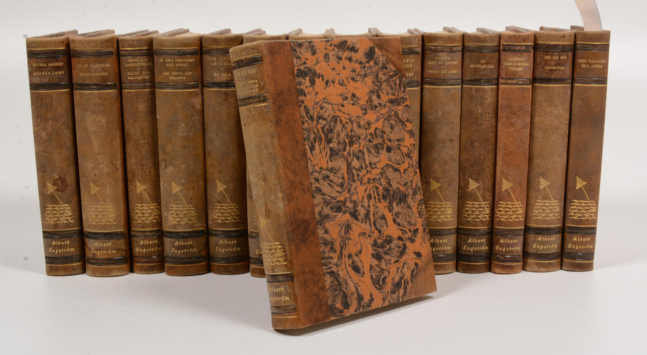 Bonniers 1939-1941. Totalt ca 6000 s. Illustrerad med teckningar av författaren. Förlagets halvfranska band med övre guldsnitt samt sjömärke på ryggen.