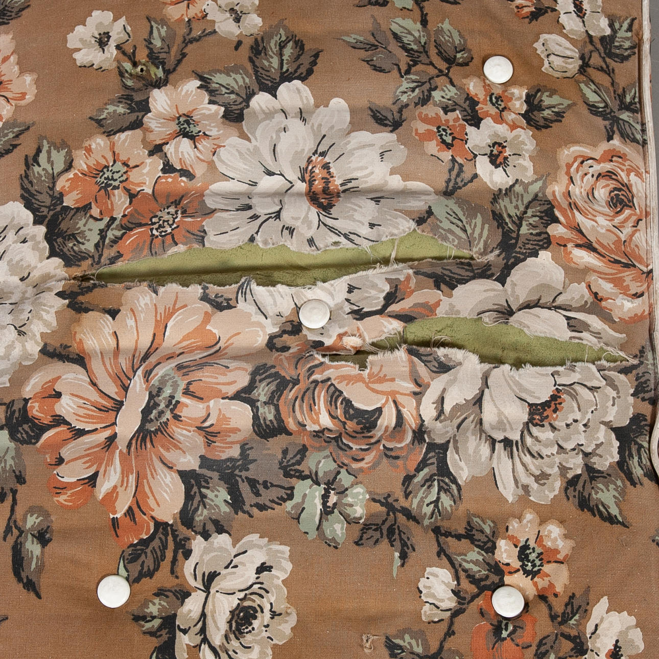 Plymåer med slitage doft, revor och knappar borta, hål. märken och fläckar en ribba lös på en av fåtöljerna.
