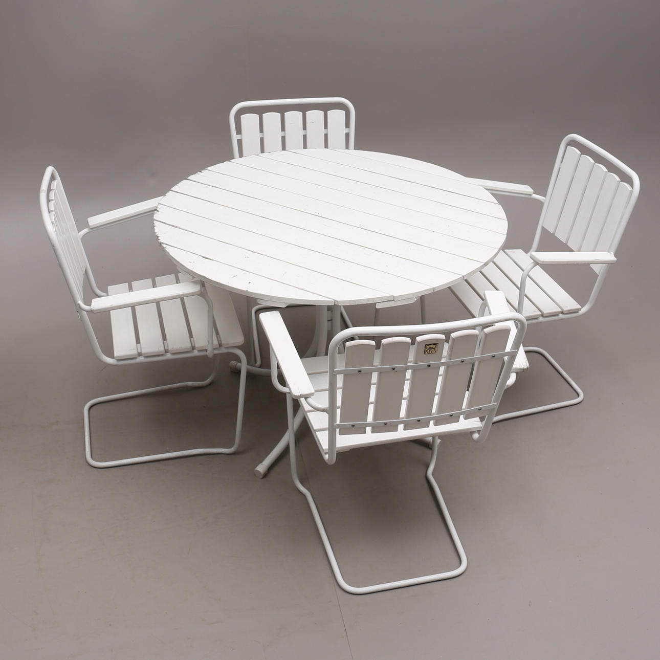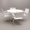 Bord höjd 72, diameter 103 cm. 4 stolar höjd 84, sitthöjd 44, bredd 64 cm.