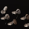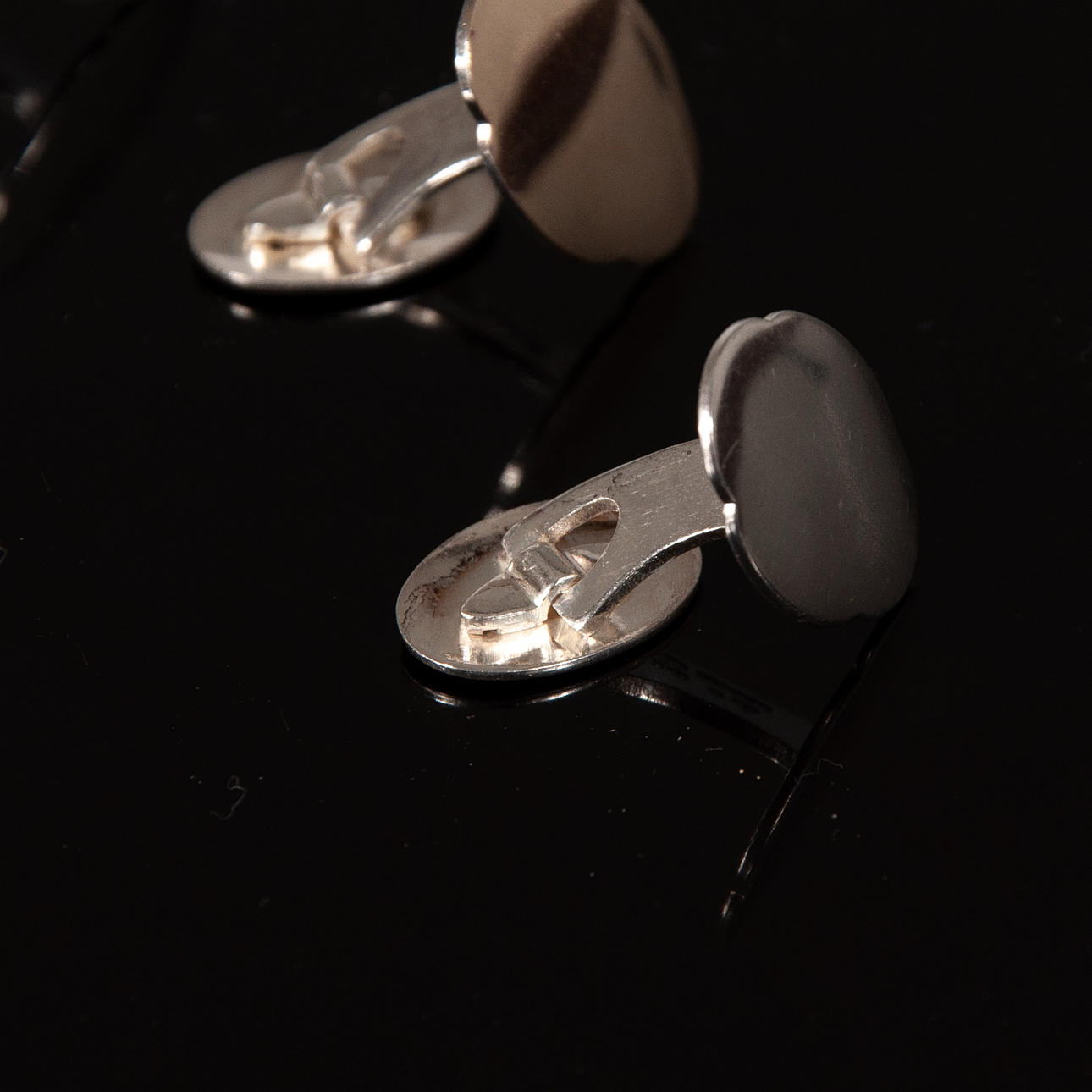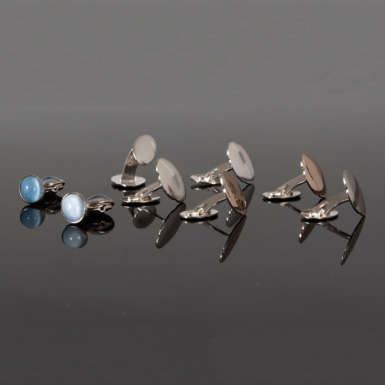 3 par manschettknappar, släta, stämplade med kattfot 1 par manschettknappar för dam med ljusblåa stenar, stämplad med kattfot Totalvikt 24,69 g.