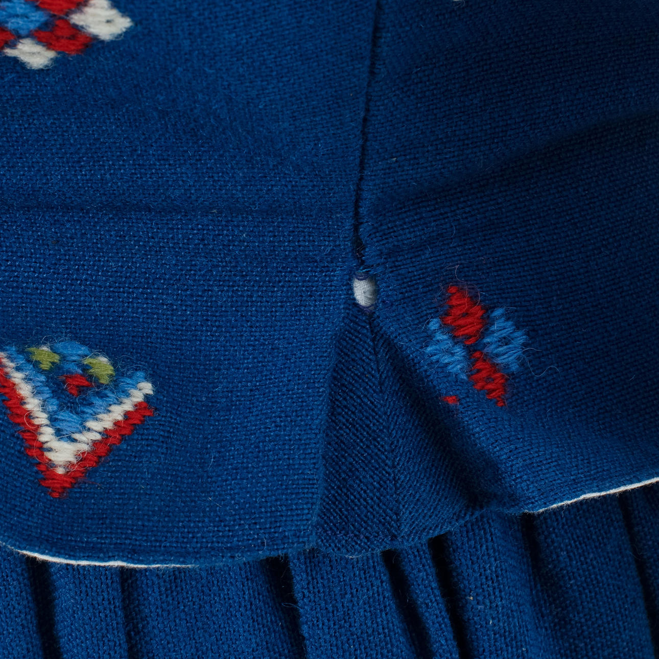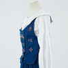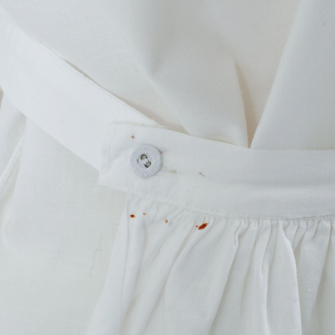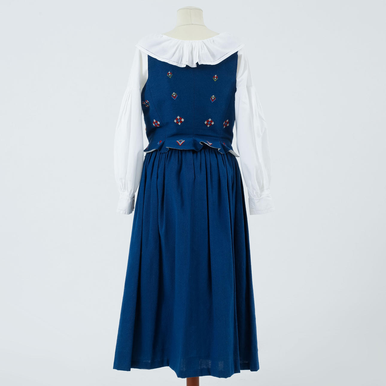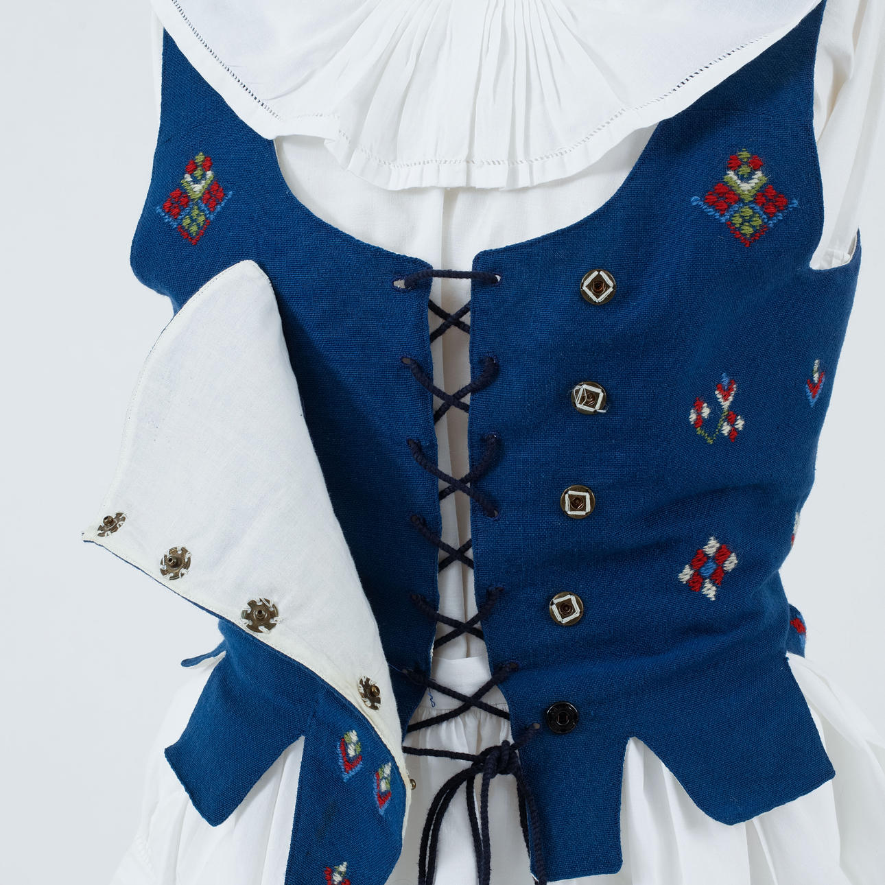 Bruksslitage, ställvisa fläckar/missfärgningar. En hätta med delvis öppnad söm. Smärre hål i livstyckets foder.