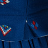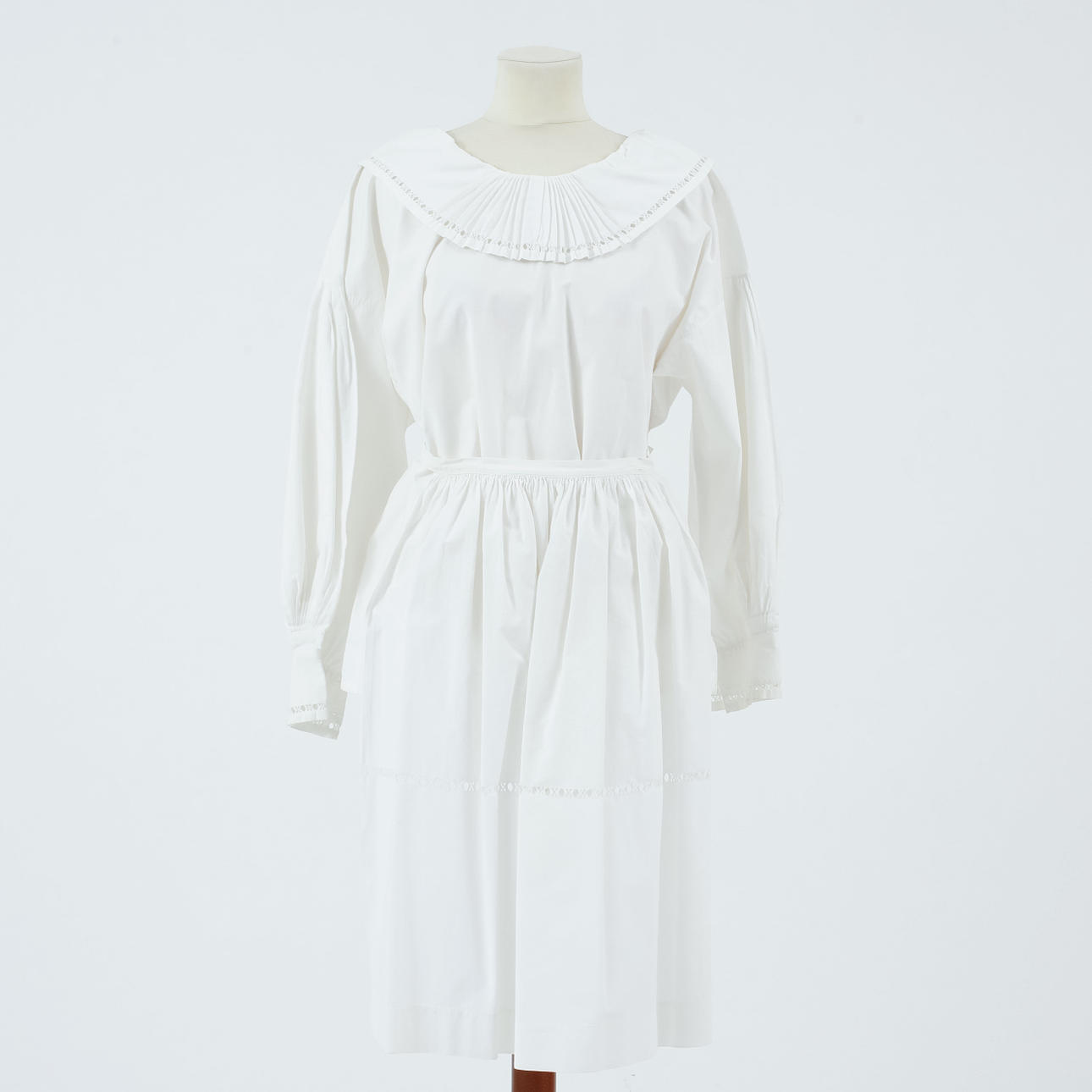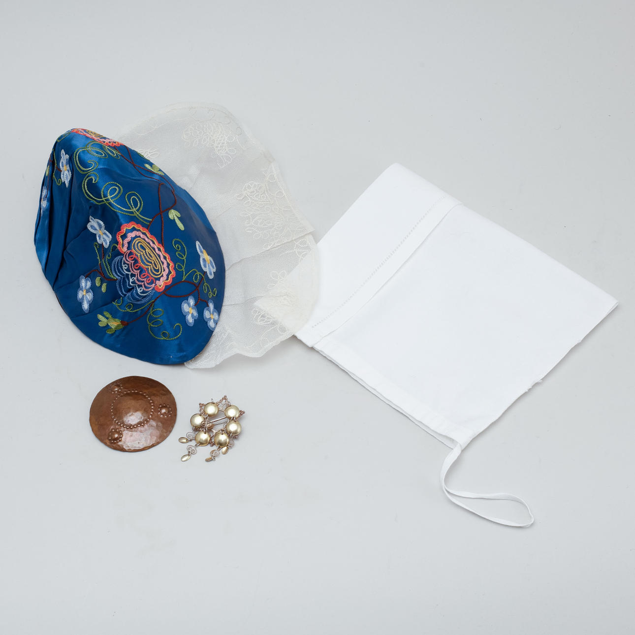 Två blusar, kjol med två hyskor i midja, livstycke med snörning och knäppning, två förkläden samt två hättor och dräktsmycken i silver respektive koppar. Kjolens midjemått ca 60 och 76 cm, längd ca 86 cm. Livstyckets bystvidd ca 90 cm.