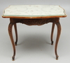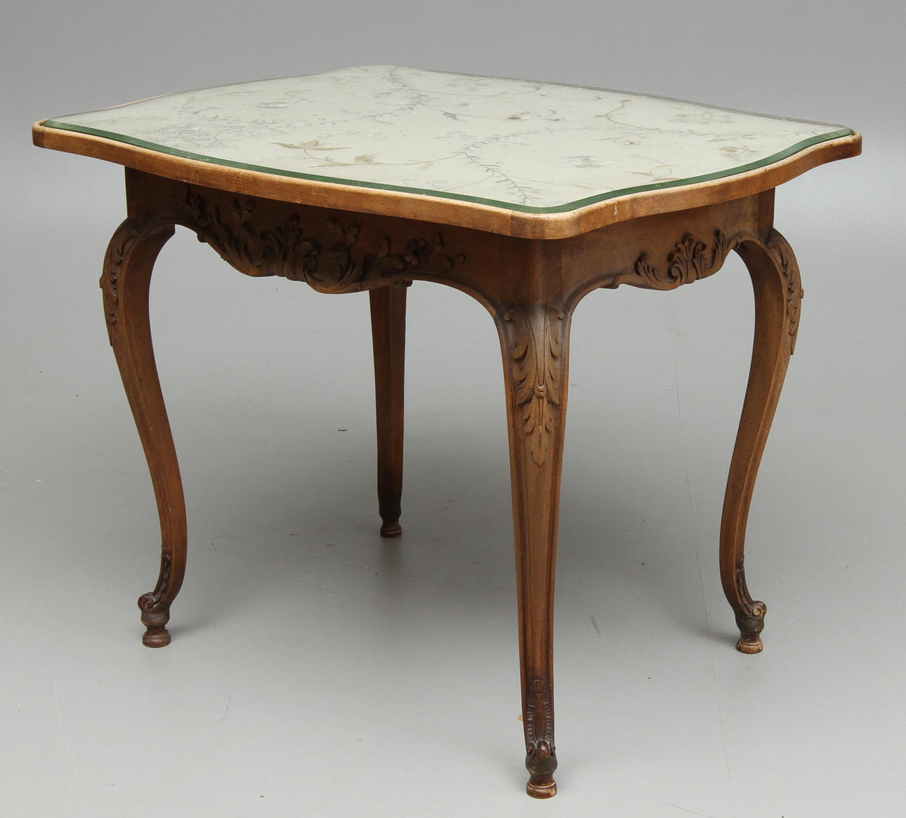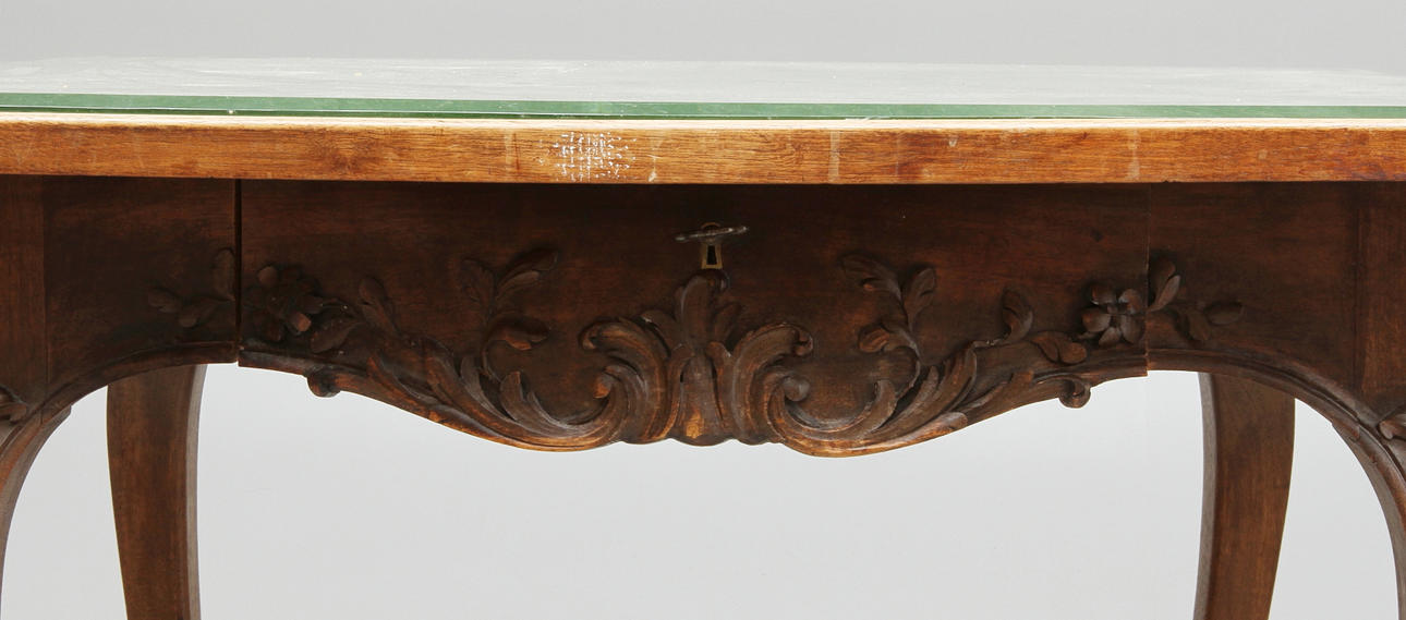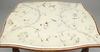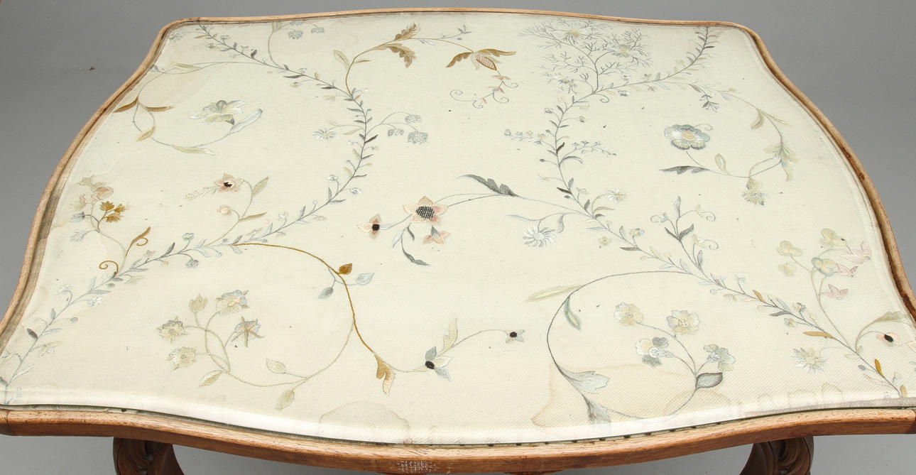 Låda i sarg. Brodyr under glasskiva. Nyckel finns. Längd 93, bredd 73, höjd 73 cm.