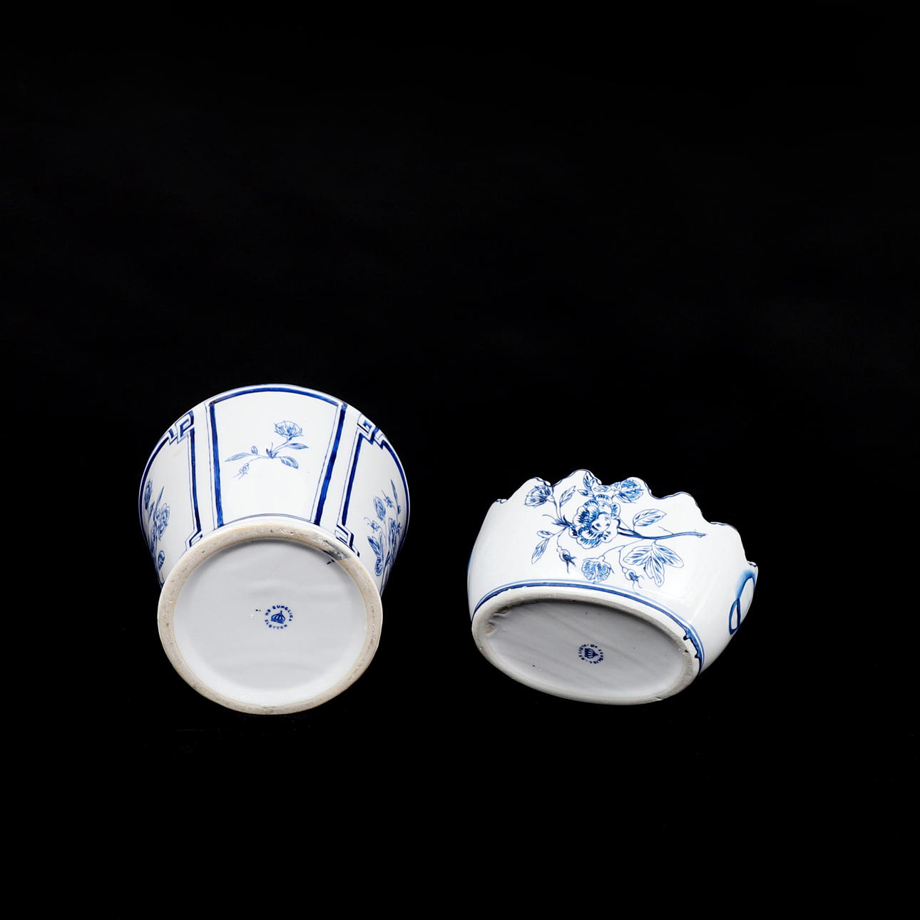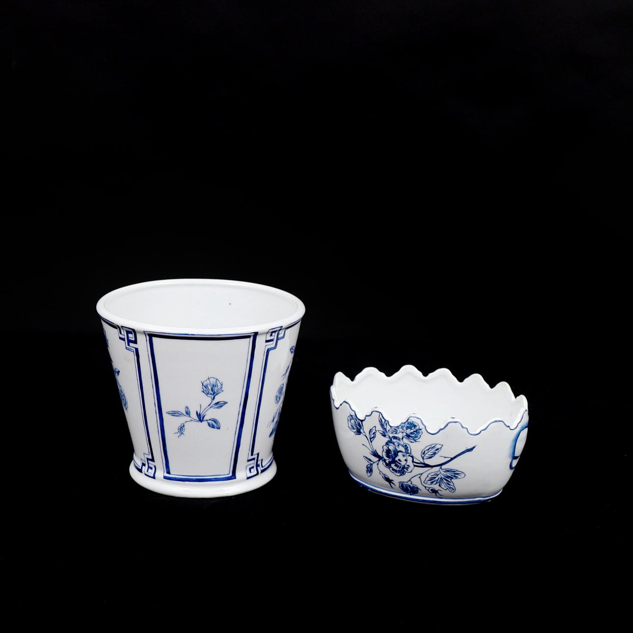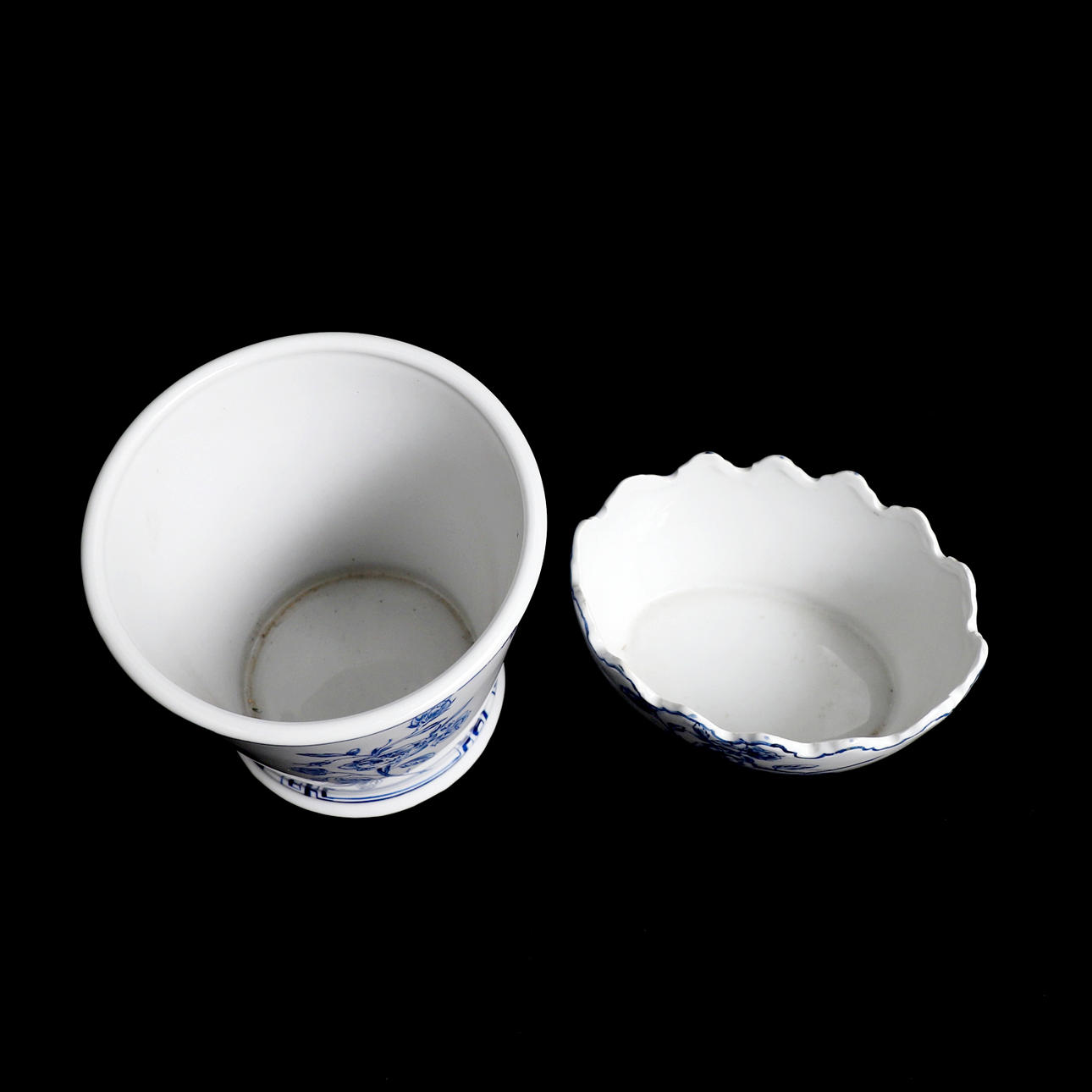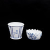 Blå/vit dekor i antik stil, samtida tillverkning, höjd: 9-16 cm, diameter ca 17-18 cm.