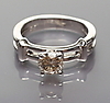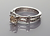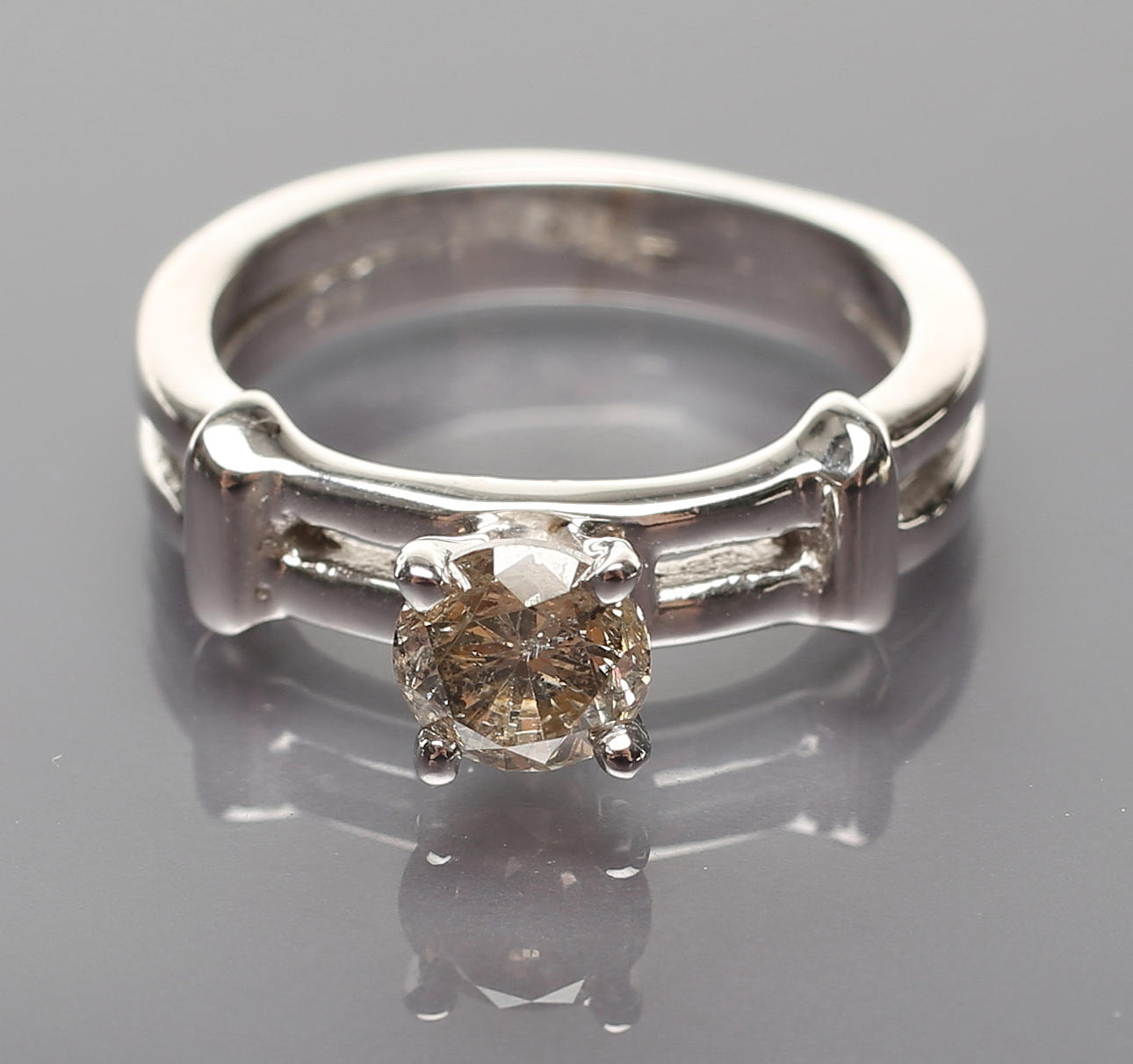 585/000 WG, 6,2 g brutto. Forked ringhuvud, set med briljant, 0.8 ct., ljus fancy brun/pi. RW 54,5.