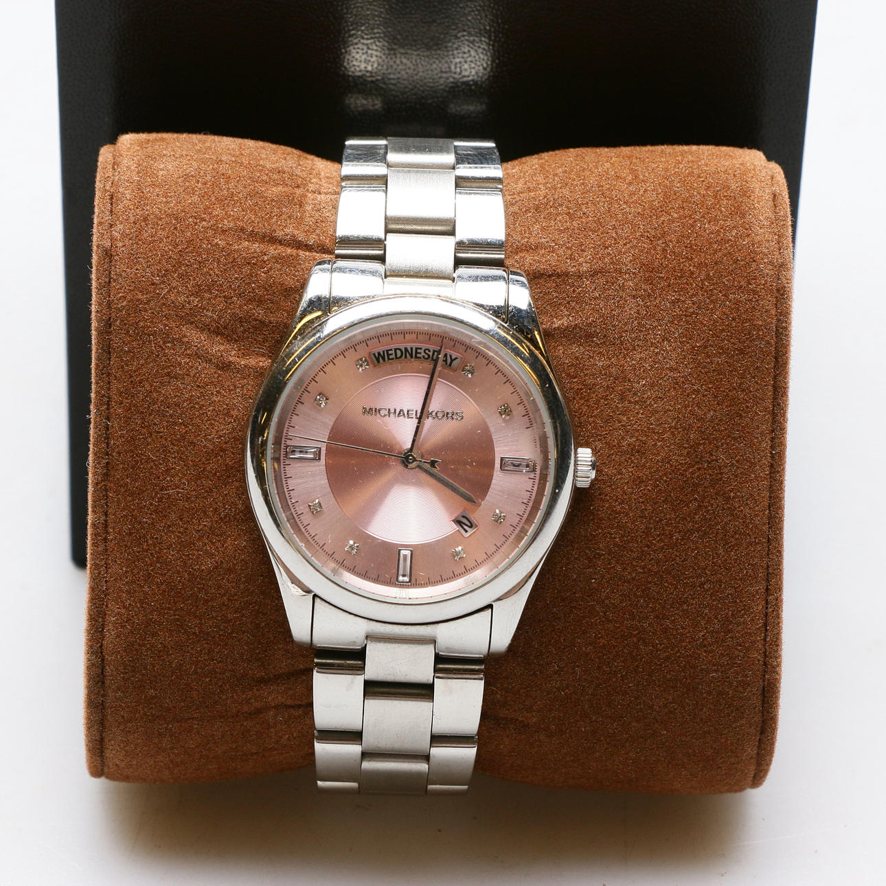 Quartz. Diameter : 30 mm Med originallåda. Rosa urtavla. Stål.