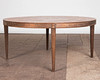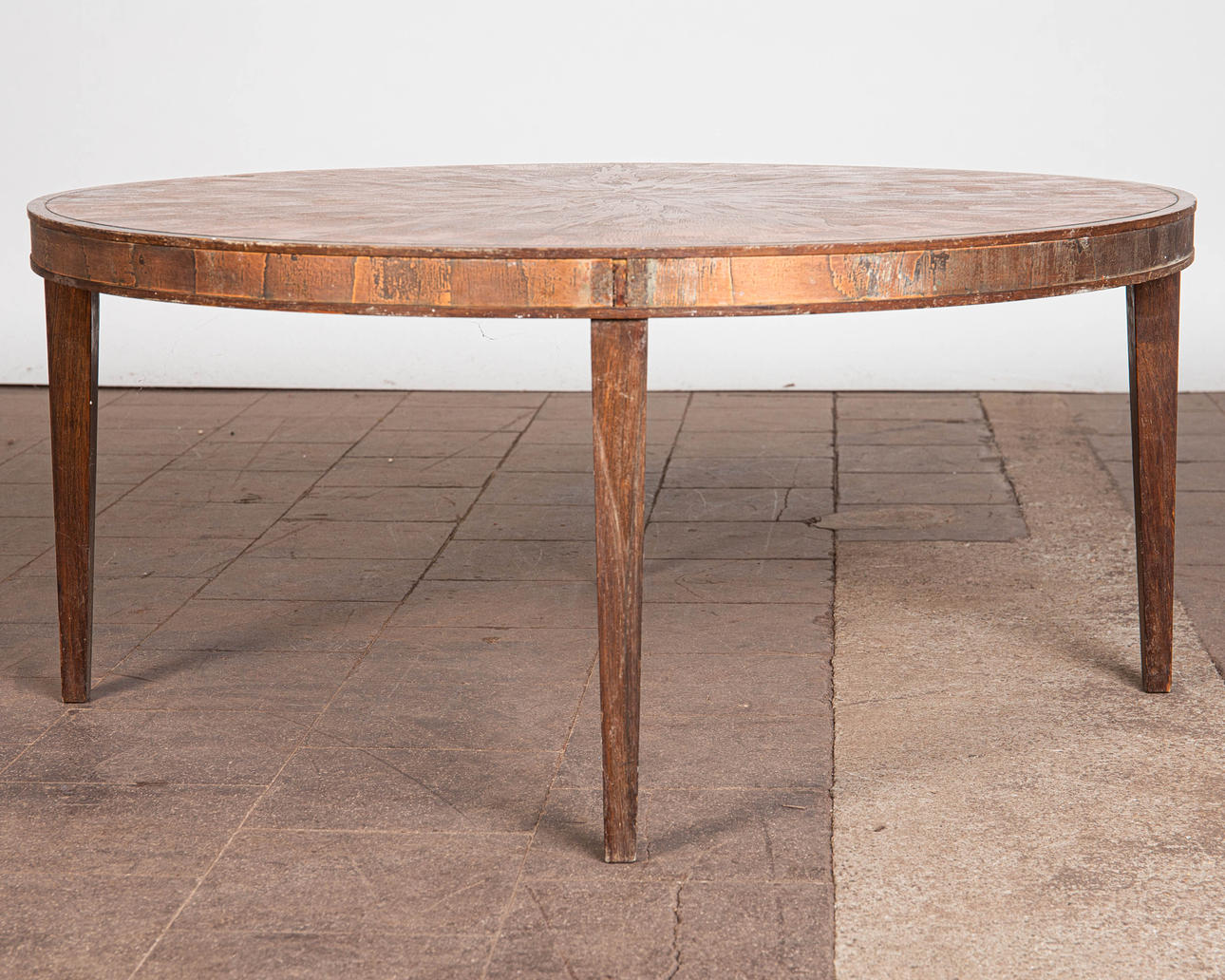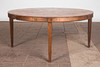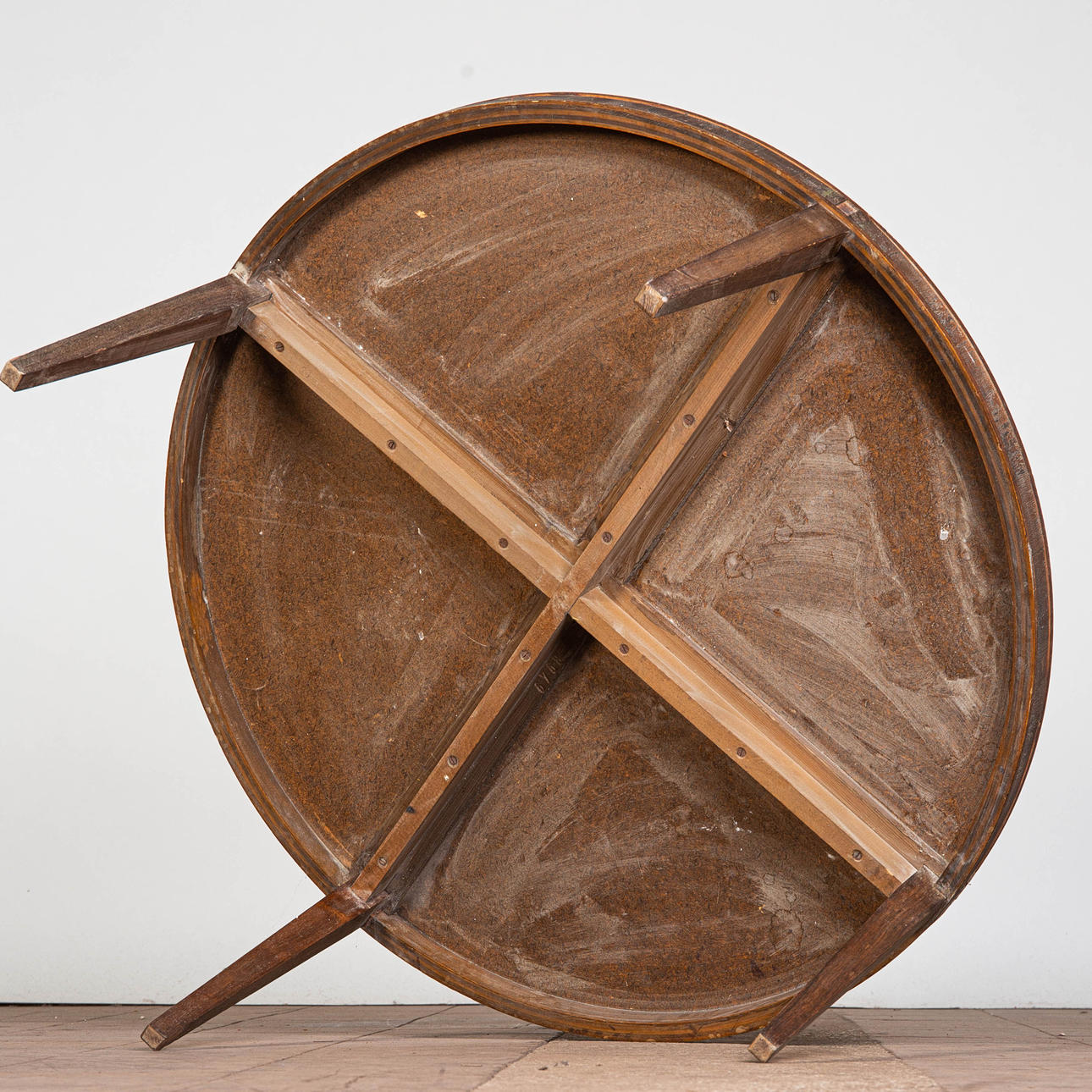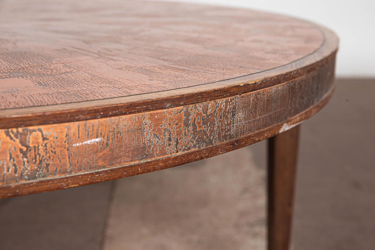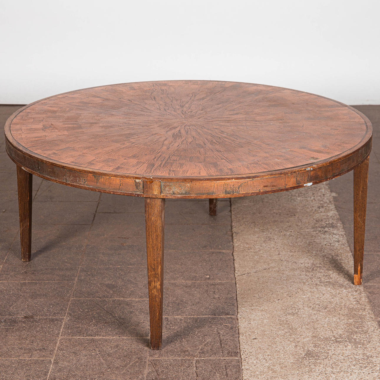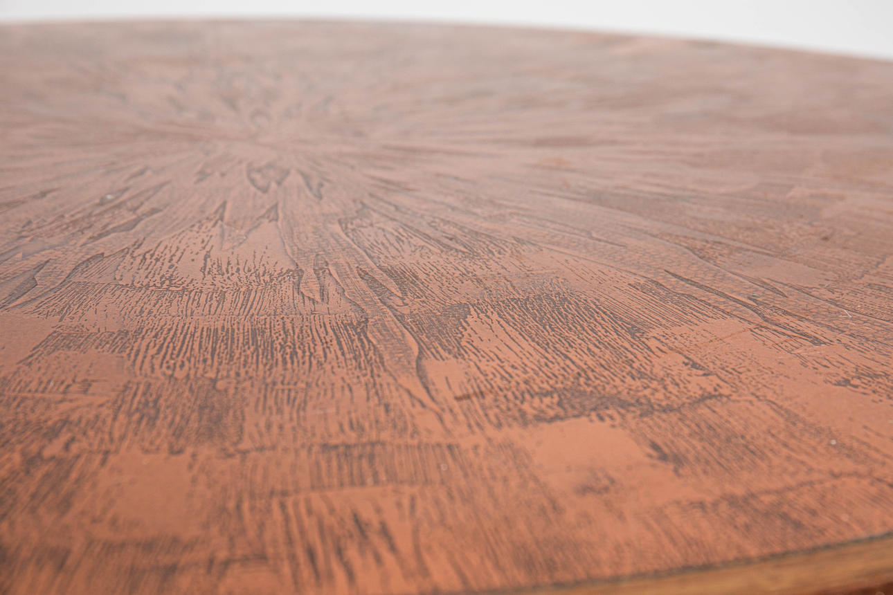Soffbord/bord, trä, koppar, 1970-tal. Soffbord i trä med rund bordsskiva och etsad kopparkant, höjd 50 cm, diameter 110 cm.