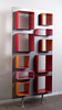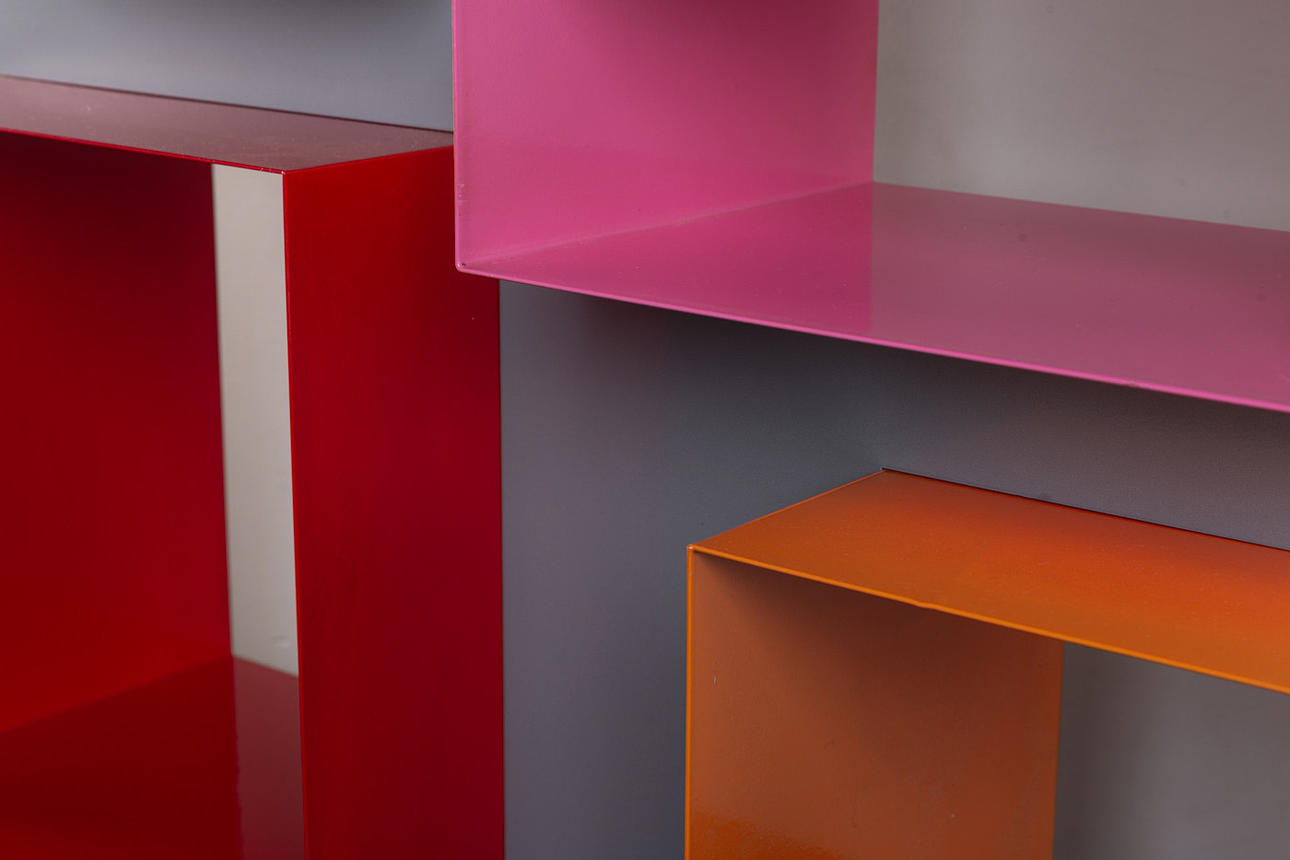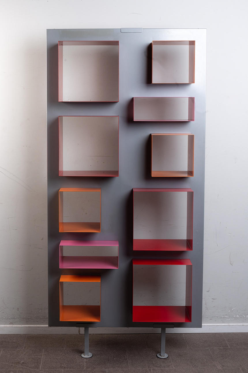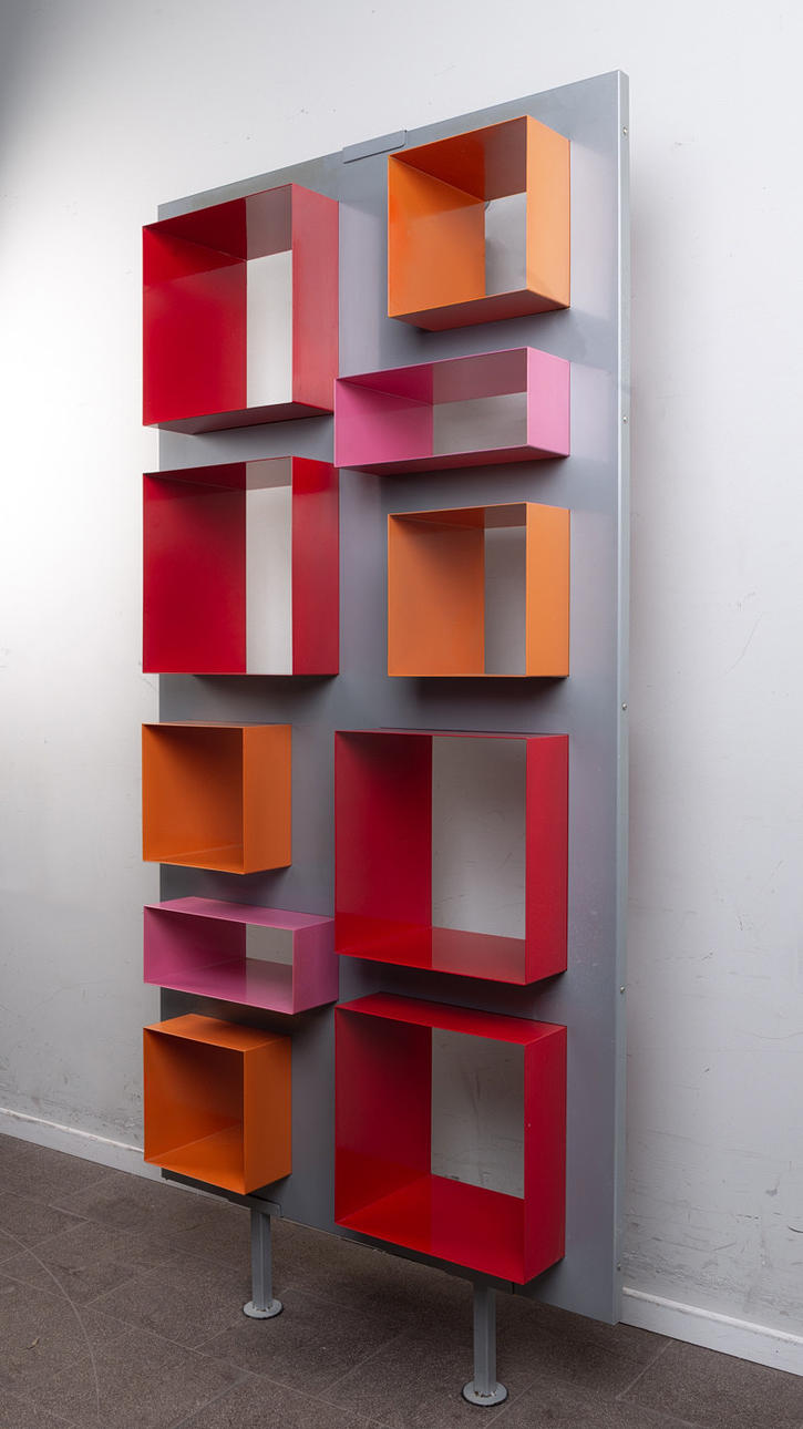Hylla/hyllvägg/bokhylla, stål. Målad stålhylla med skulpturella skiljeväggar och insatta, upphöjda ytelement i rosa, orange och rött, innesluten med tre monteringsarmar, H.184cm, W.90cm, D.30cm.