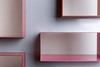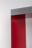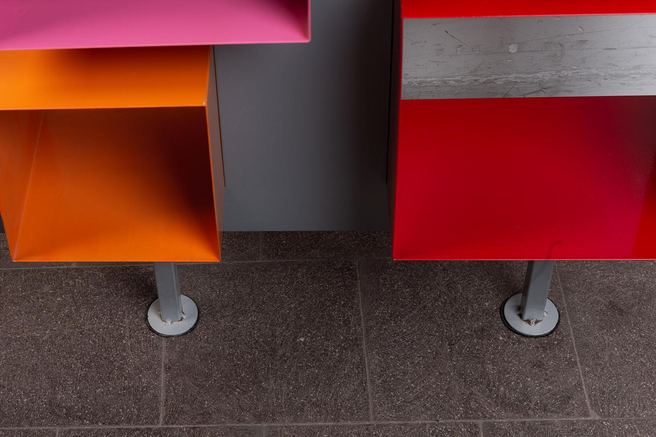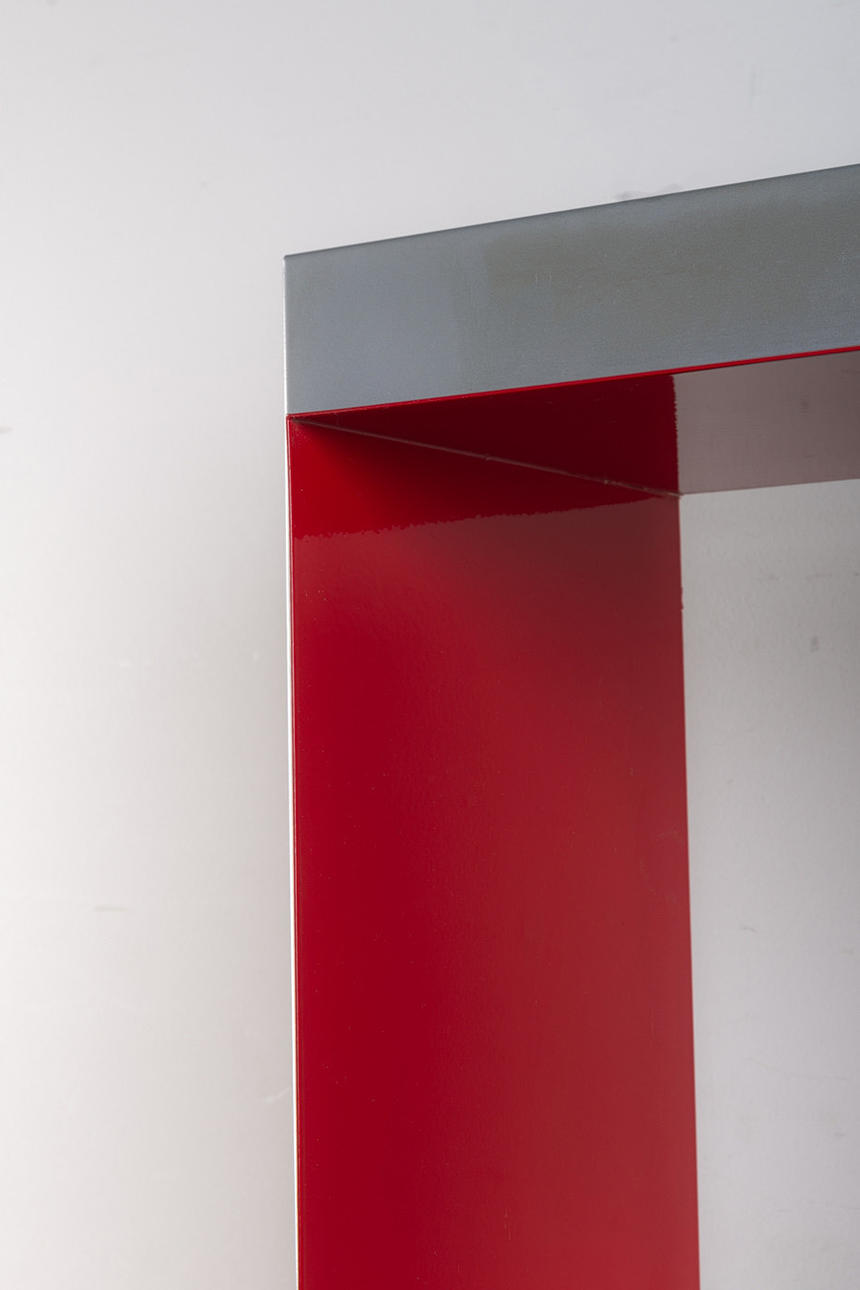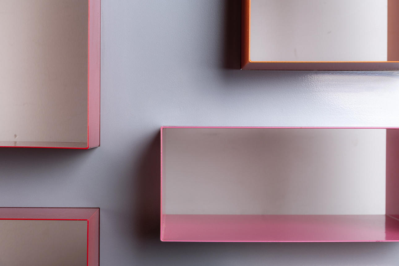 Hylla/hyllvägg/bokhylla, stål. Målad stålhylla med skulpturella skiljeväggar och insatta, upphöjda ytelement i rosa, orange och rött, innesluten med tre monteringsarmar, H.184cm, W.90cm, D.30cm.