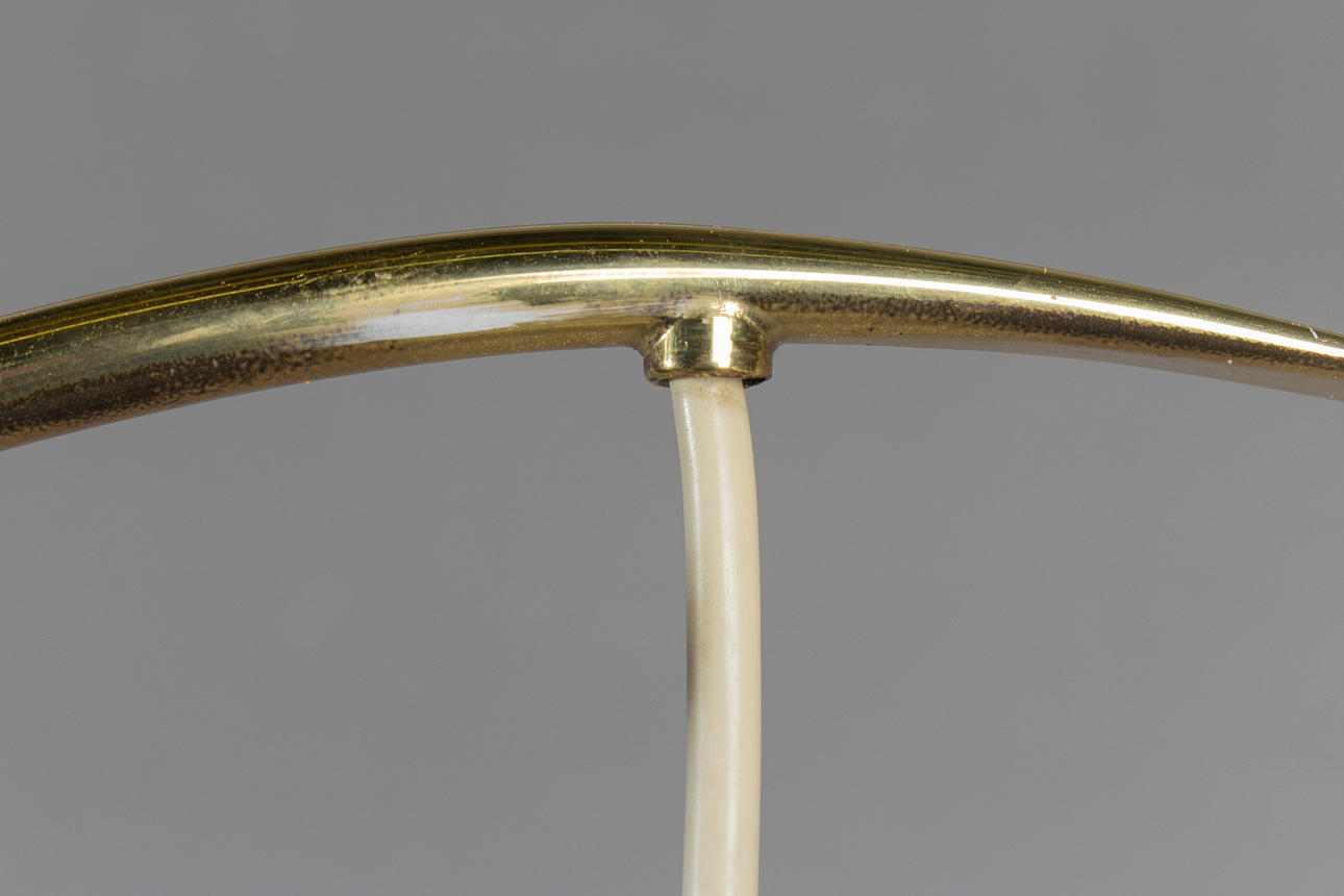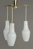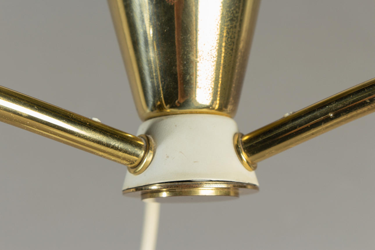 Upphängd konstruktion med tre opalglas fluorescerande nyanser, var och en med en belysningspunkt. Höjd 53 cm, diameter 35 cm.