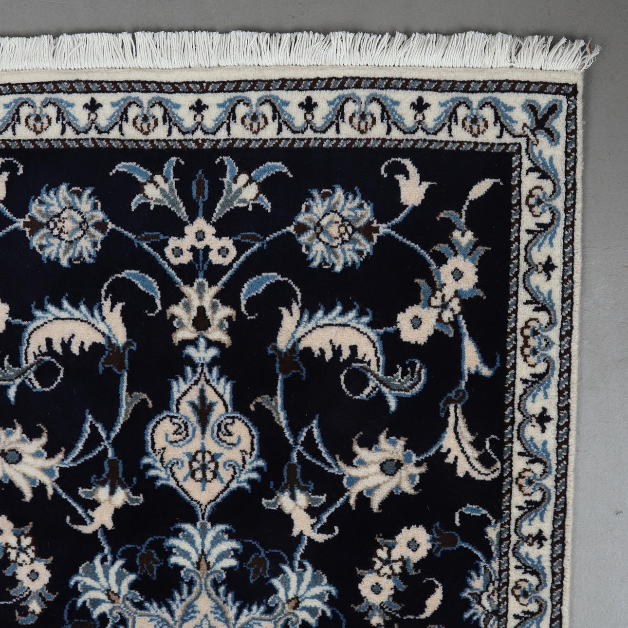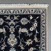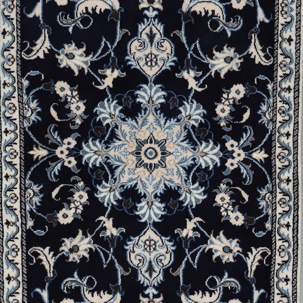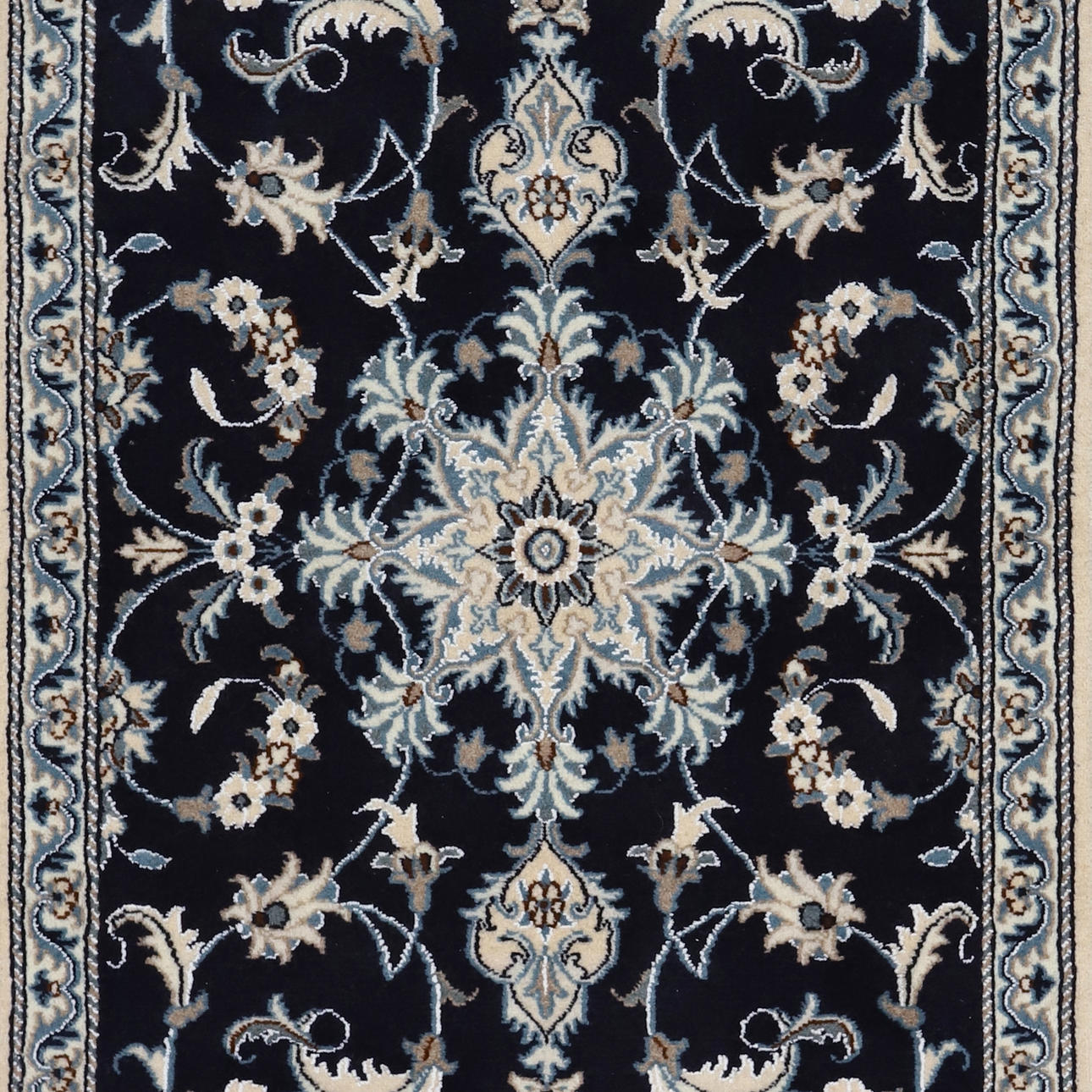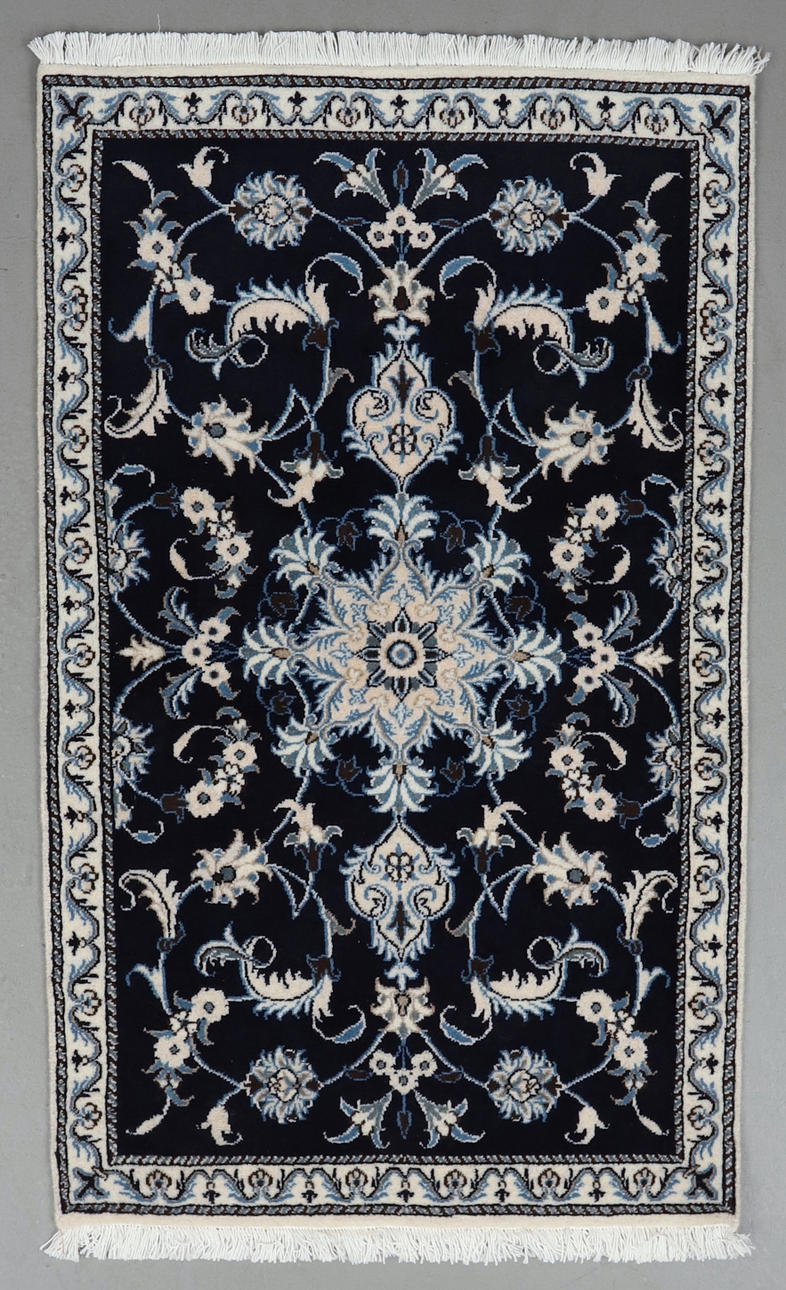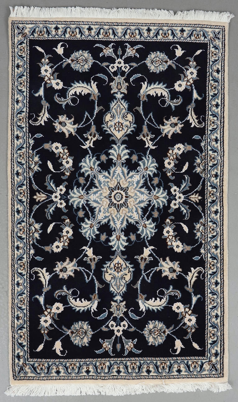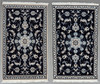 Paret handknutna mattor i ull på bomullsvarp, Nain. Stjärnformad medaljong på övermönstrad mörkblå botten.