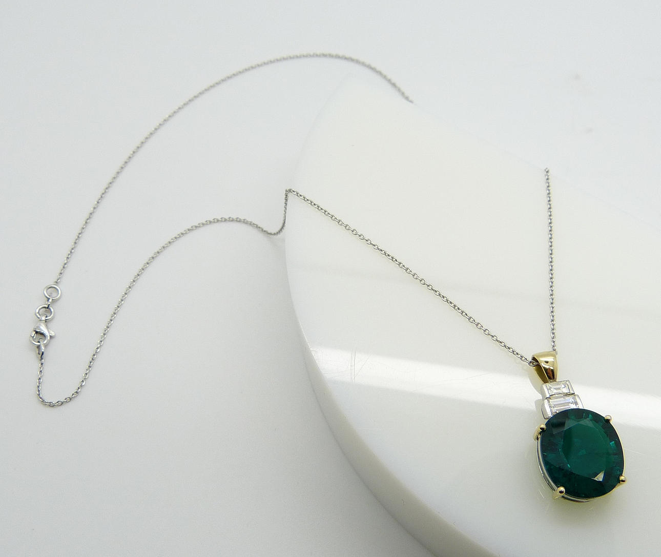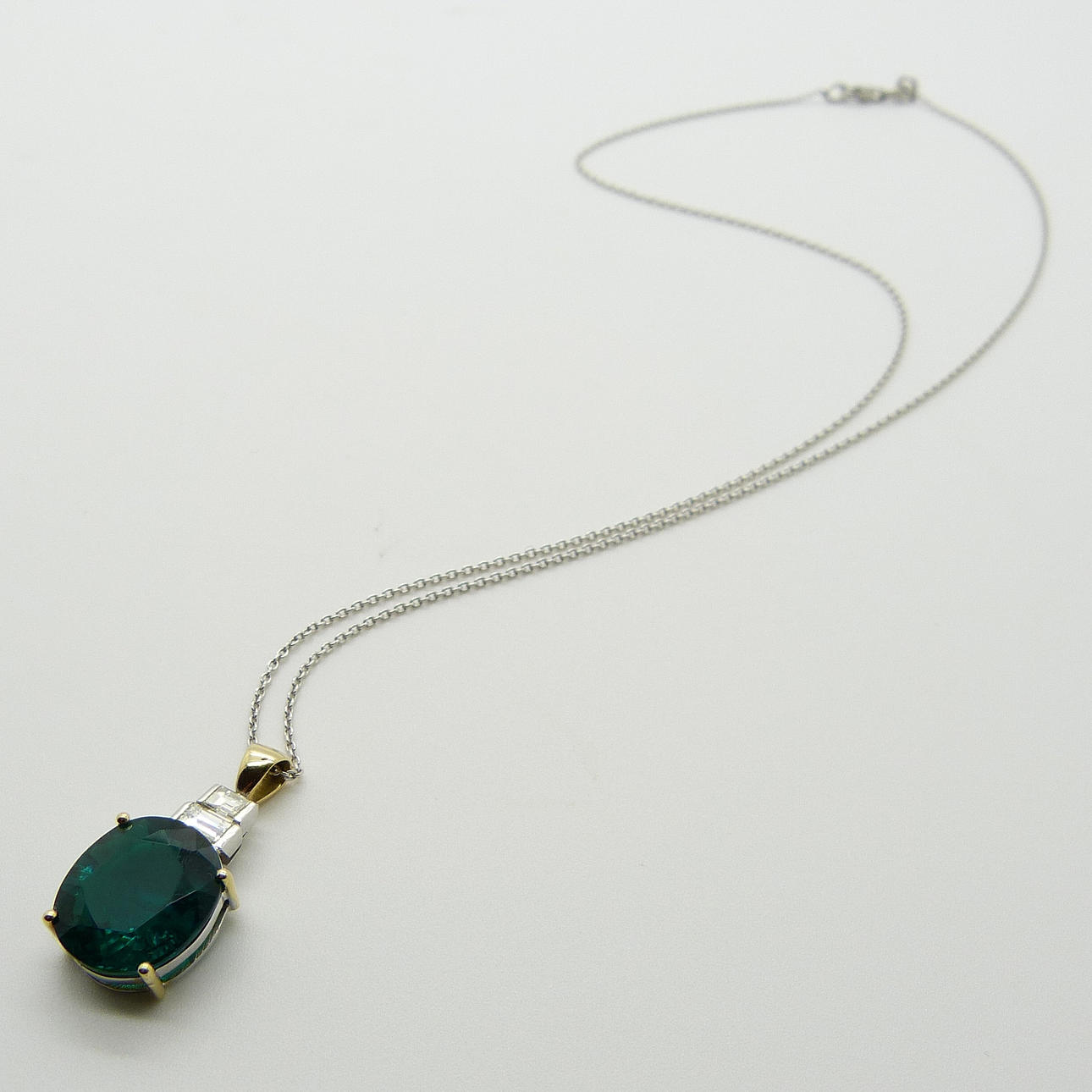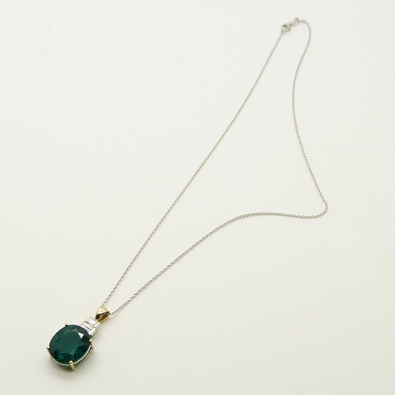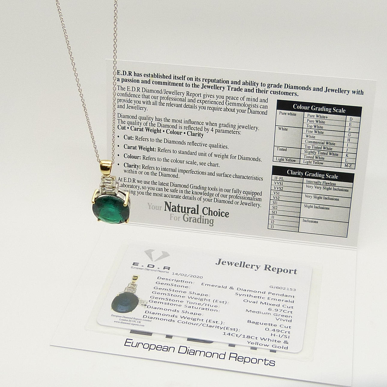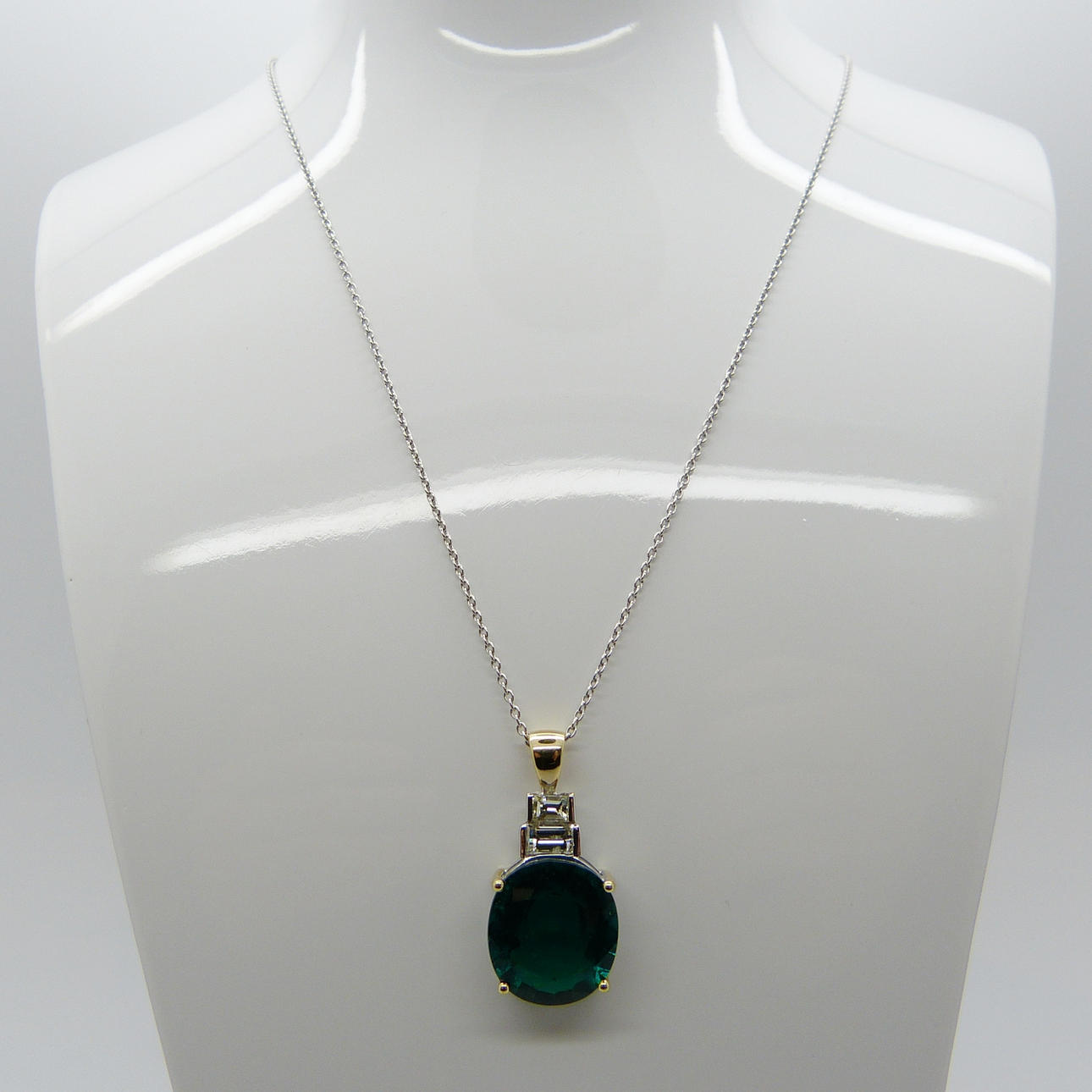 Hänge 18ct gult & vitt guld med en syntetisk grön smaragd och diamanter med en 14k vitguld kedja, certifierade.