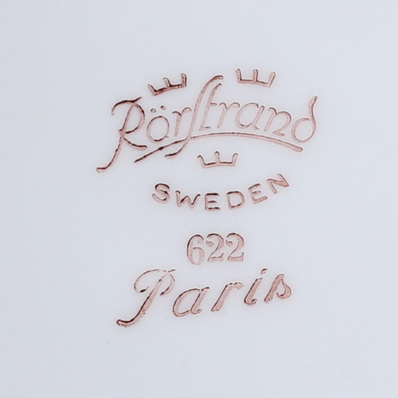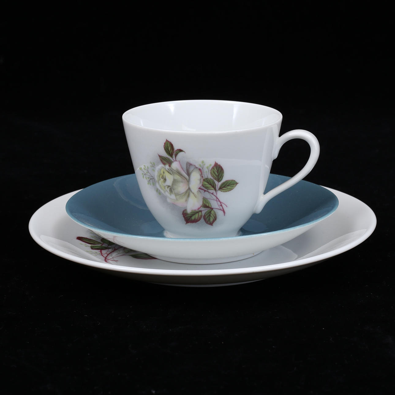 12 assietter, diameter 17 cm. 12 kaffefat, 13,5 cm. 11 kaffekoppar, höjd 6 cm.