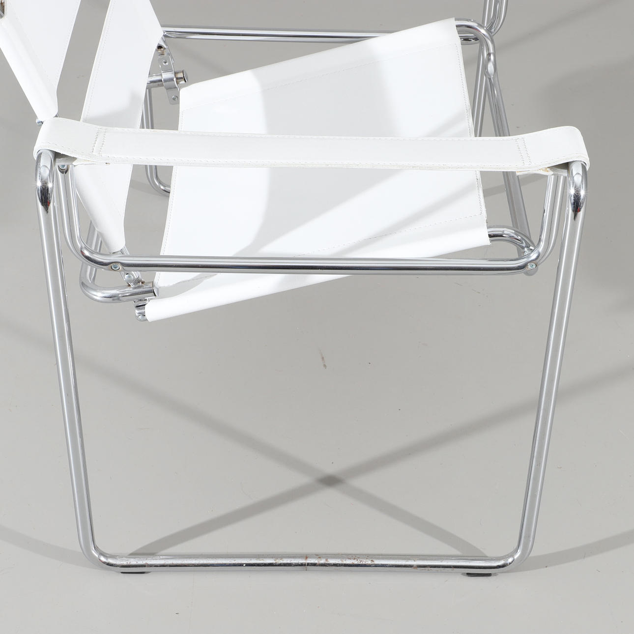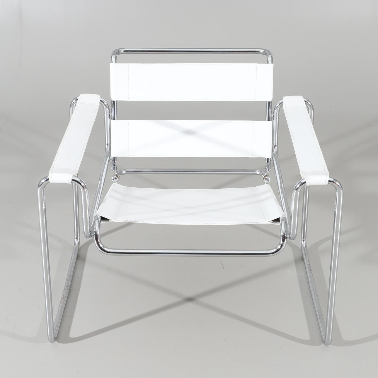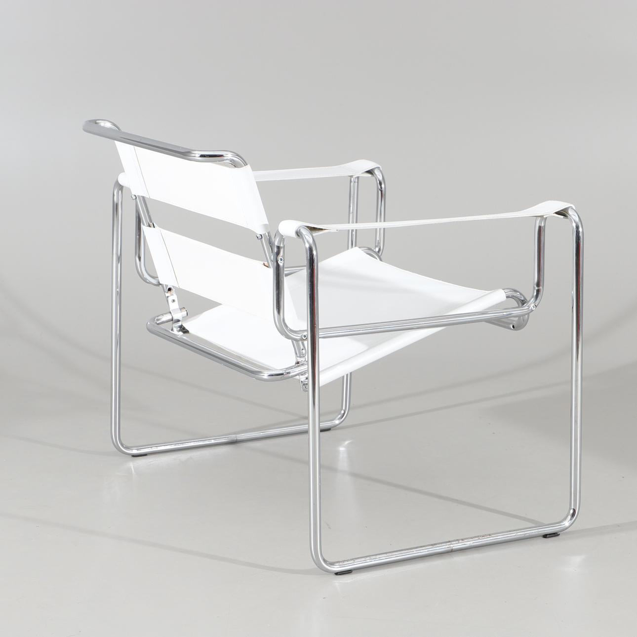 Skinn med kromad metallstomme. Sitthöjd 30 cm, rygghöjd 72 cm.