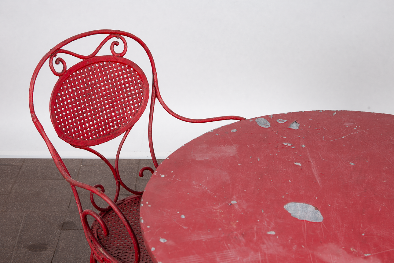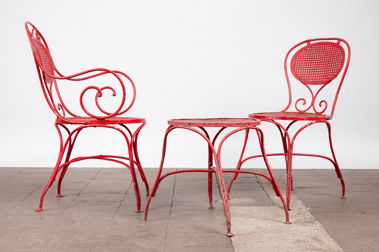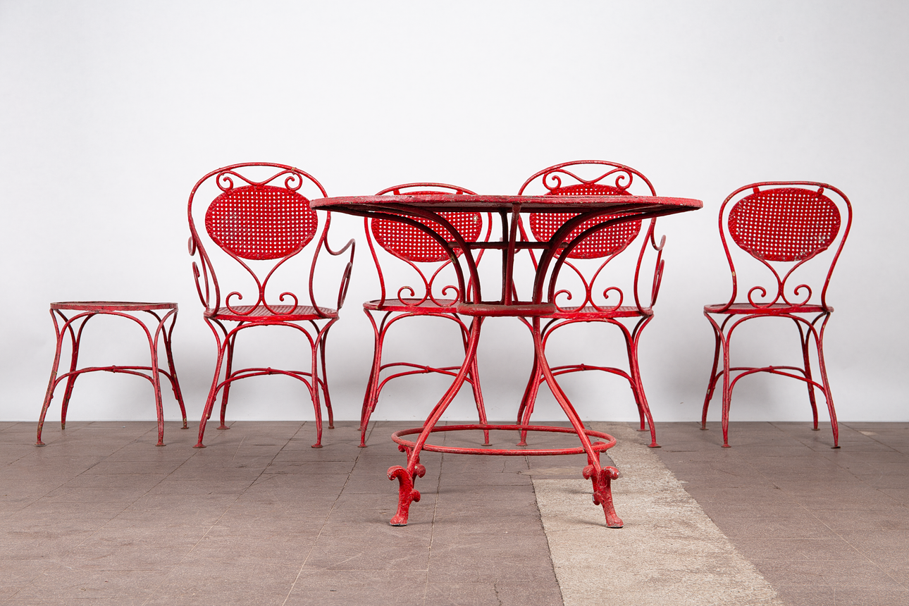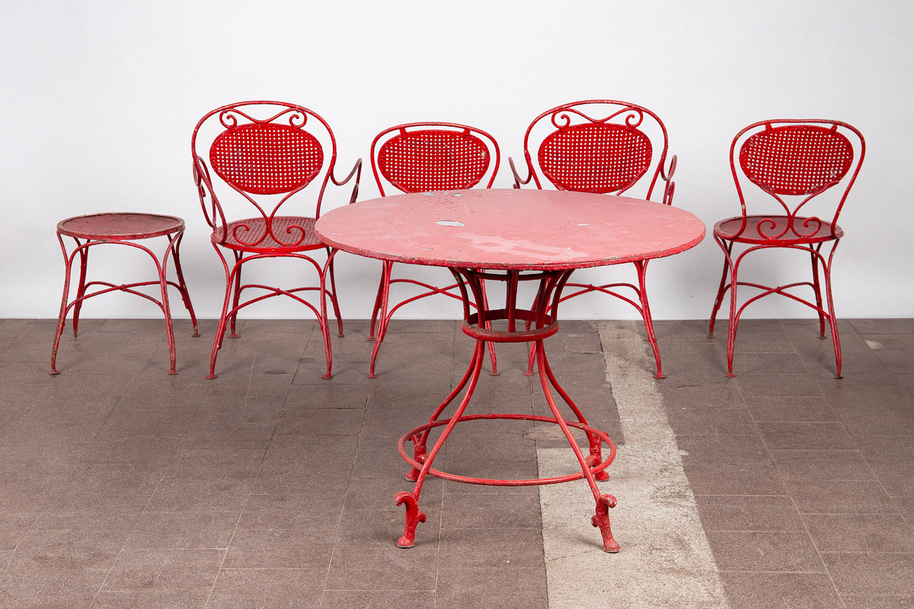Matplats/trädgårdsmöbler, metall, omkring 1900. Set bestående av fyra stolar med böjda armstöd och runda, perforerade säten, H.90cm, sitthöjd: 41cm, W.55cm, D.52cm, samt ett bord med en rund bordsskiva, H.75cm, D.95cm och en pall med en rund, perforerad sits, H.44cm, D.40cm, var och en gjord av rödmålad metall med volutformade dekorationer. (6).