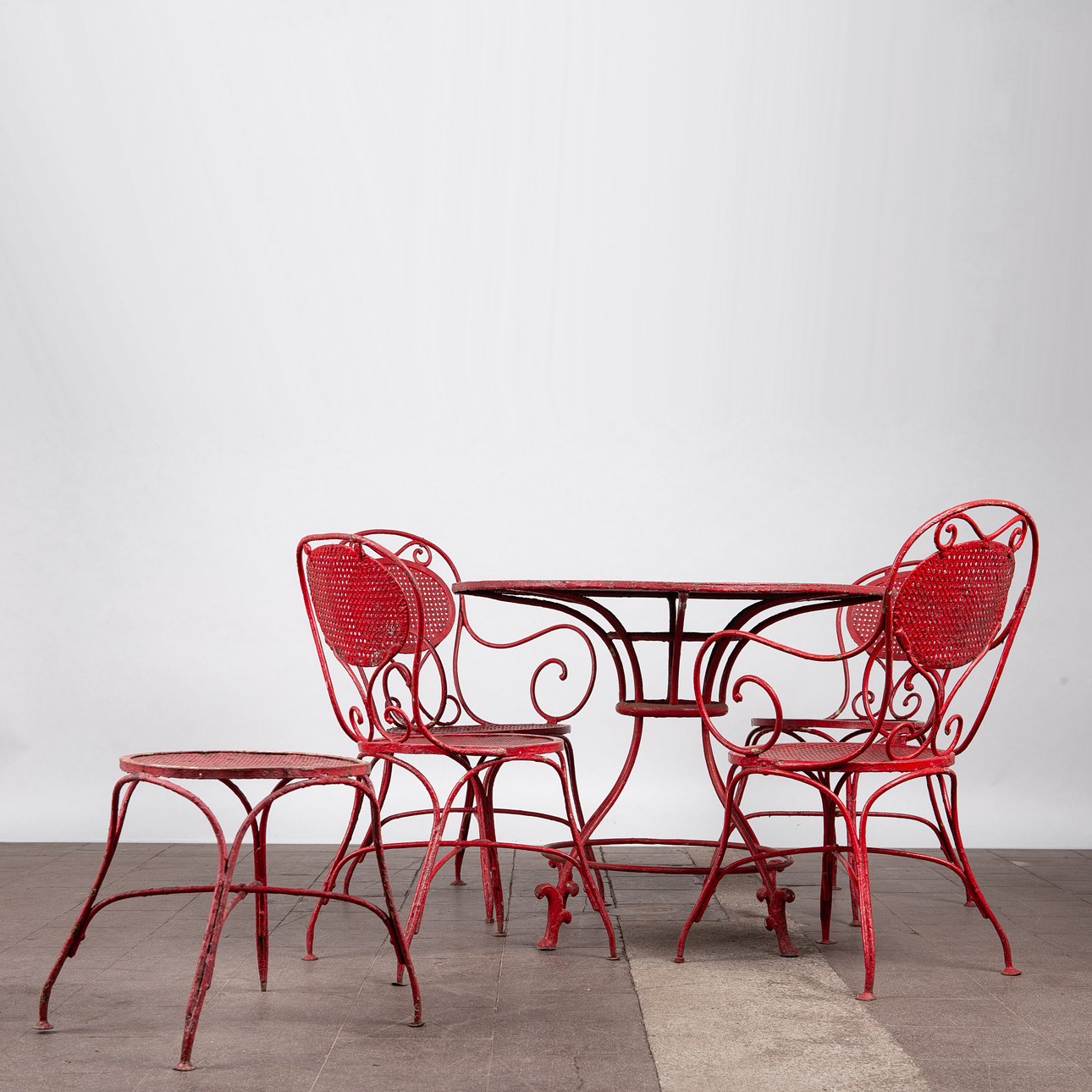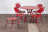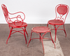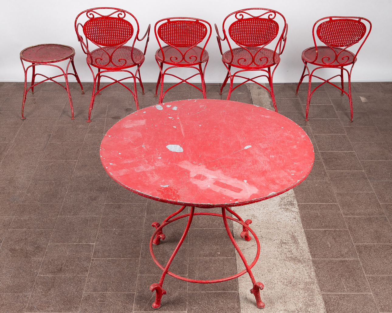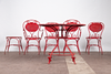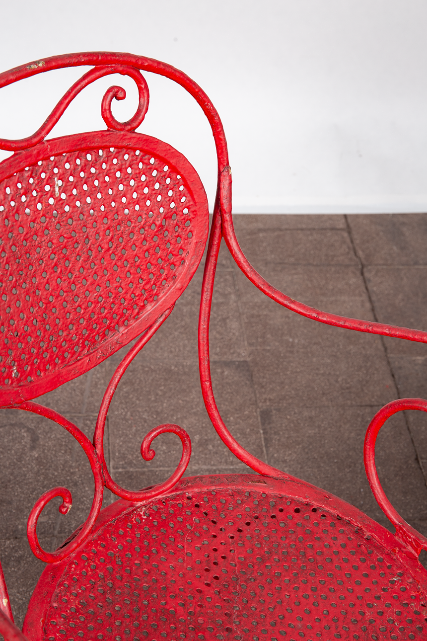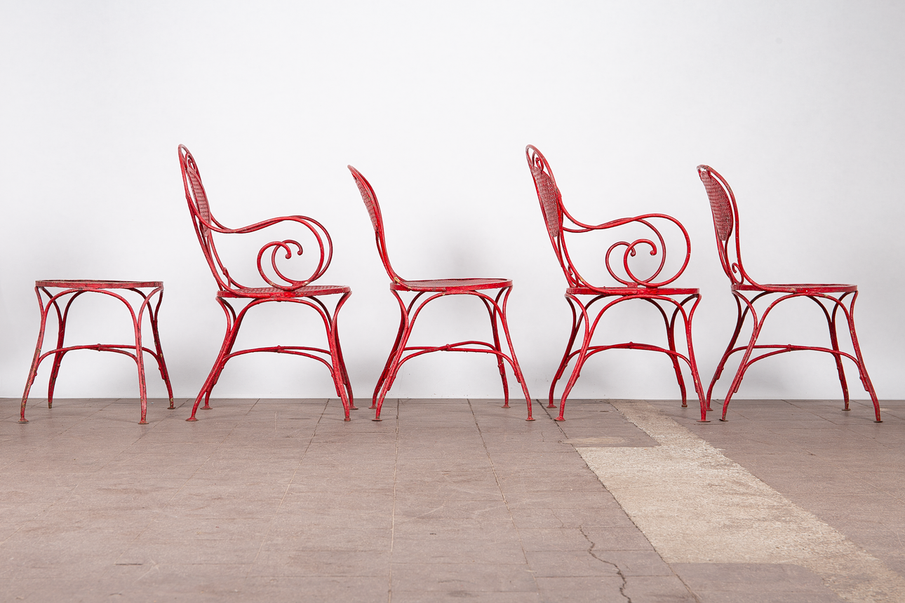 Matplats/trädgårdsmöbler, metall, omkring 1900. Set bestående av fyra stolar med böjda armstöd och runda, perforerade säten, H.90cm, sitthöjd: 41cm, W.55cm, D.52cm, samt ett bord med en rund bordsskiva, H.75cm, D.95cm och en pall med en rund, perforerad sits, H.44cm, D.40cm, var och en gjord av rödmålad metall med volutformade dekorationer. (6).