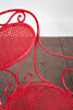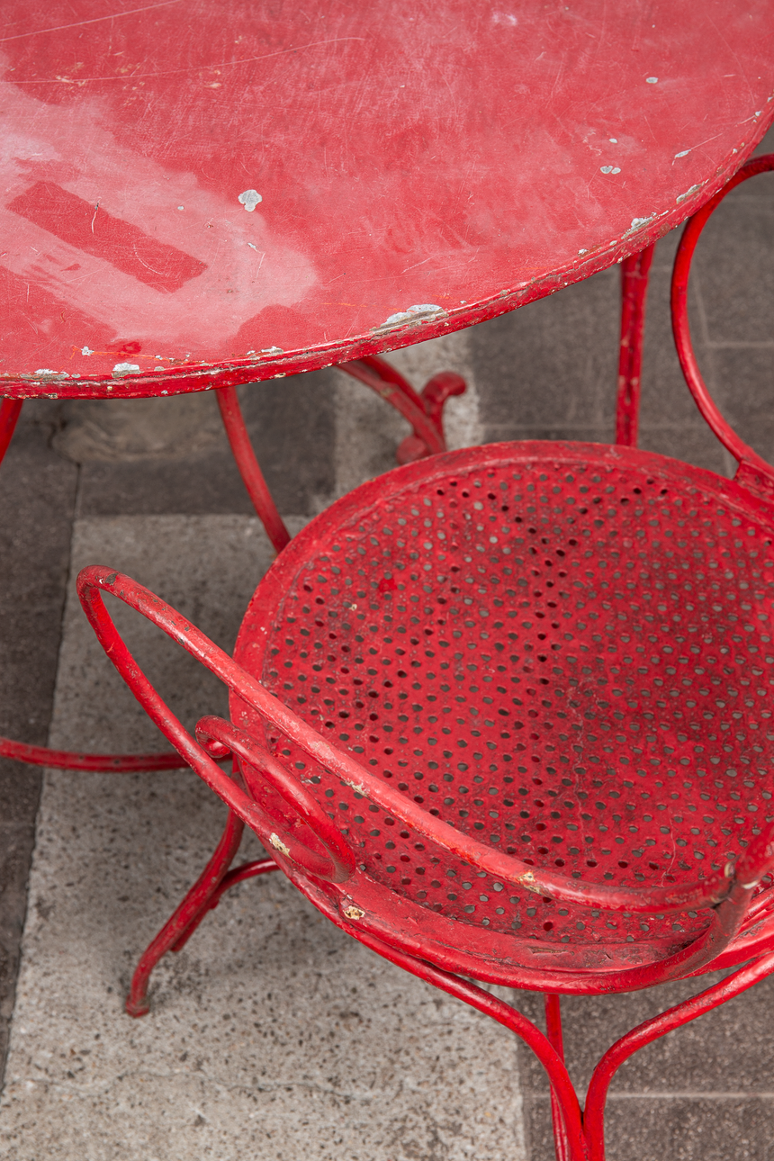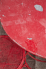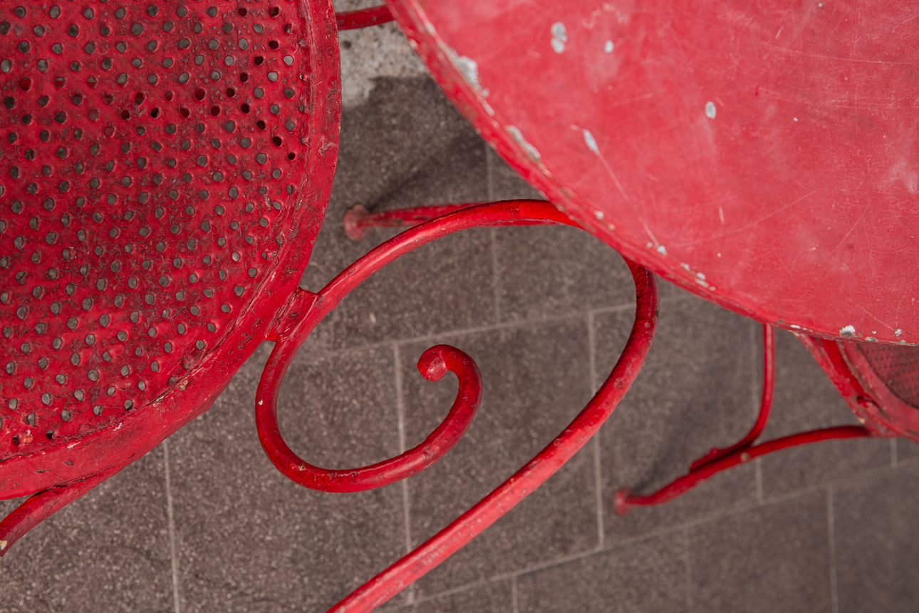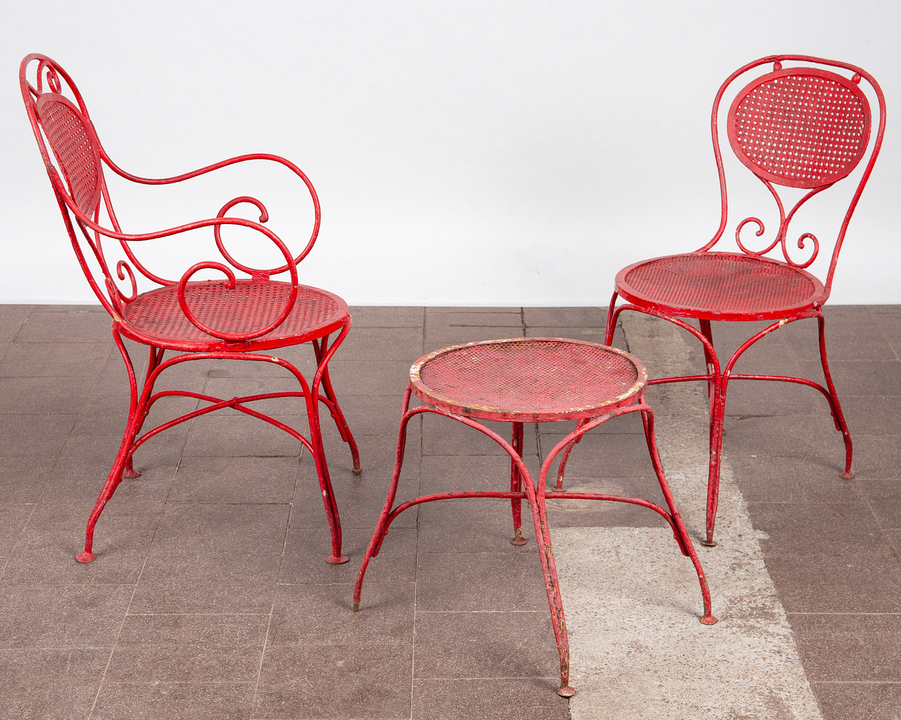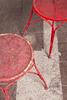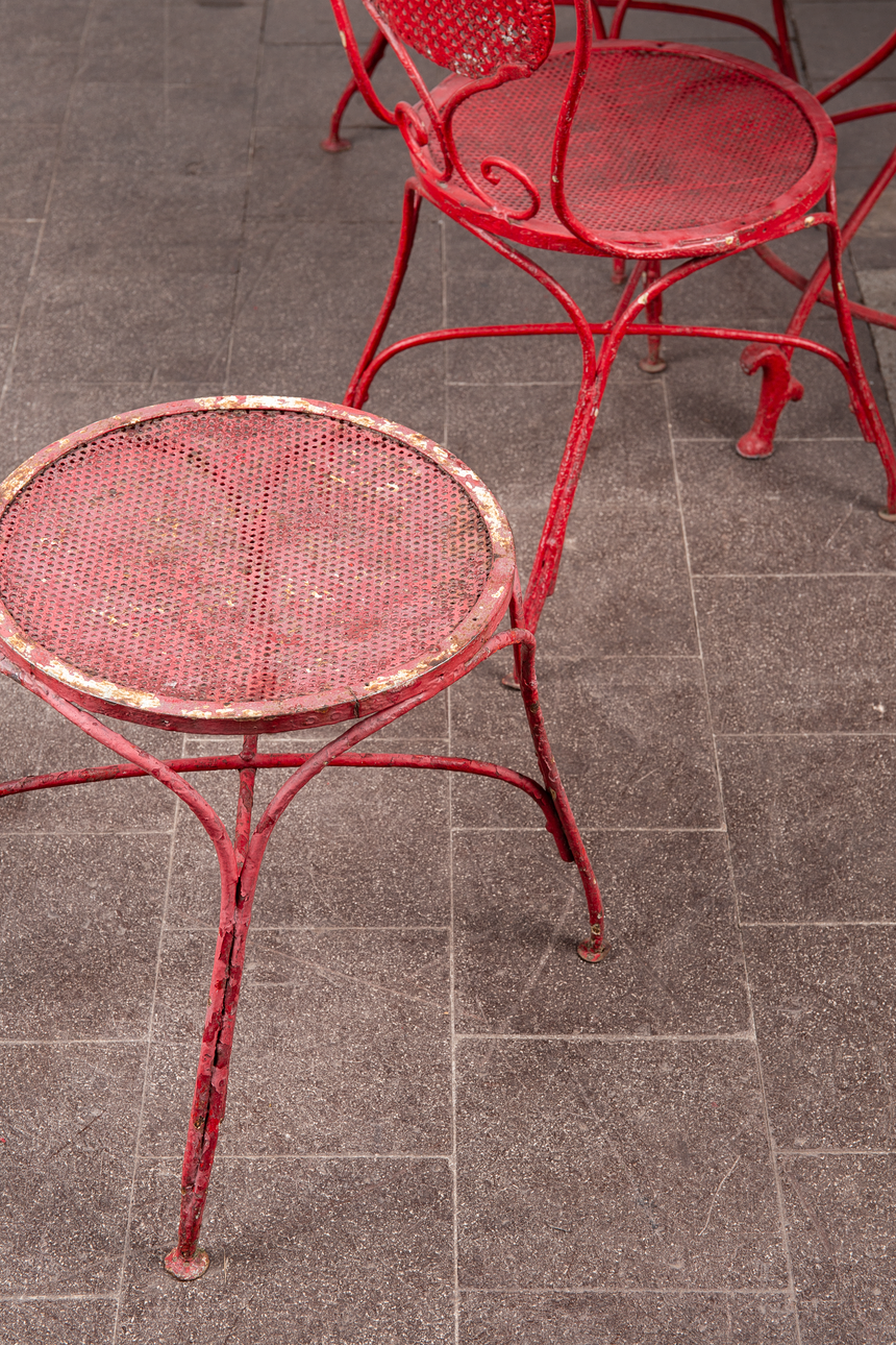 Matplats/trädgårdsmöbler, metall, omkring 1900. Set bestående av fyra stolar med böjda armstöd och runda, perforerade säten, H.90cm, sitthöjd: 41cm, W.55cm, D.52cm, samt ett bord med en rund bordsskiva, H.75cm, D.95cm och en pall med en rund, perforerad sits, H.44cm, D.40cm, var och en gjord av rödmålad metall med volutformade dekorationer. (6).