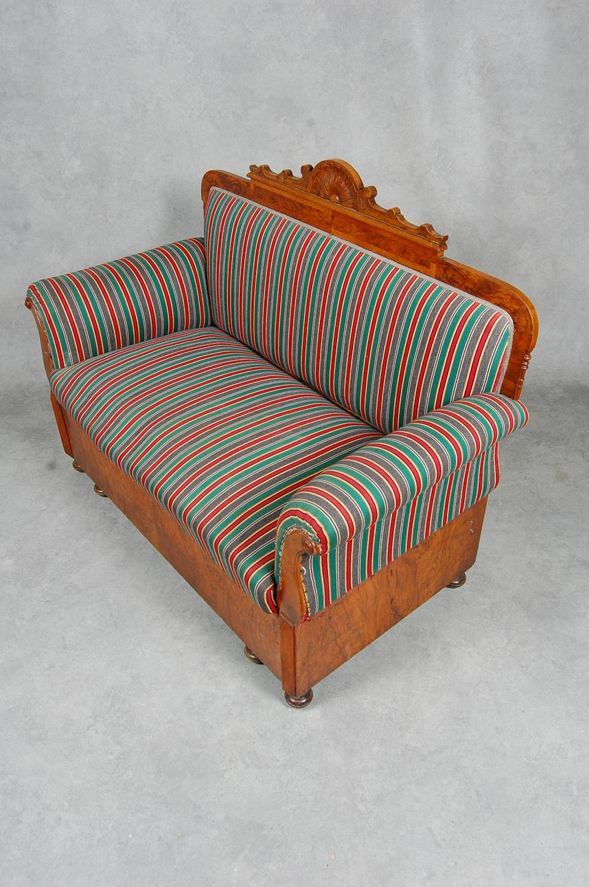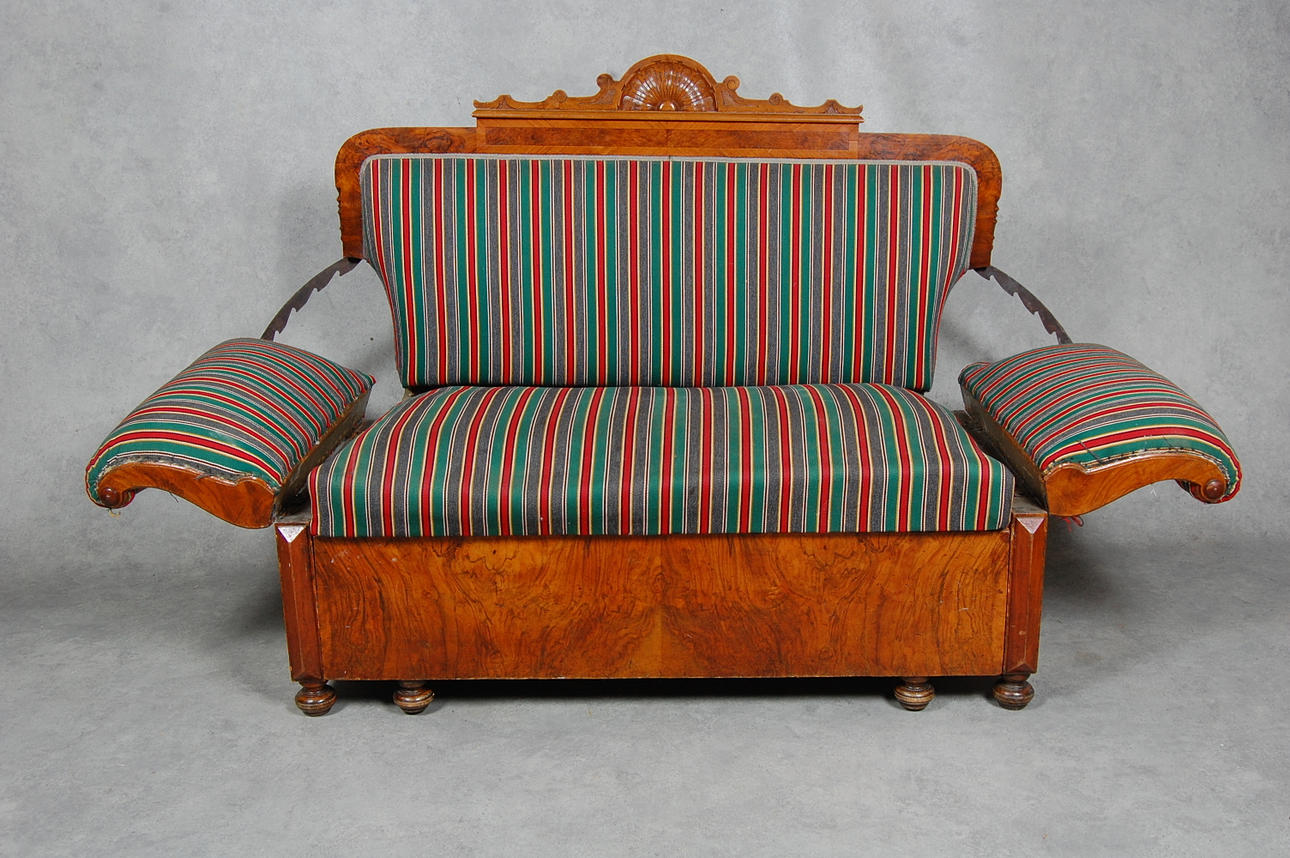Soffa Karl-Johan, 1800-tal med fällbara armstöd, bäddbar
