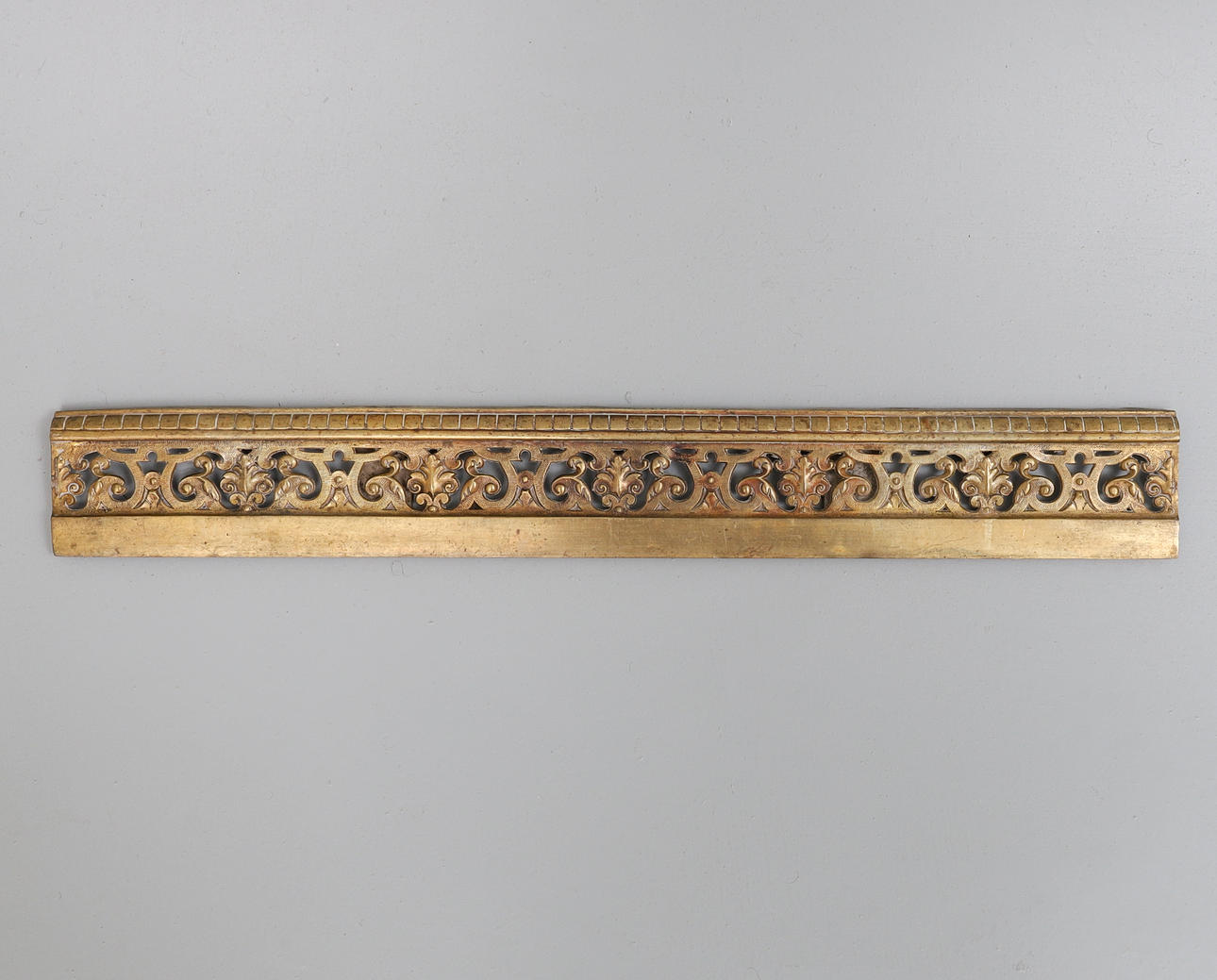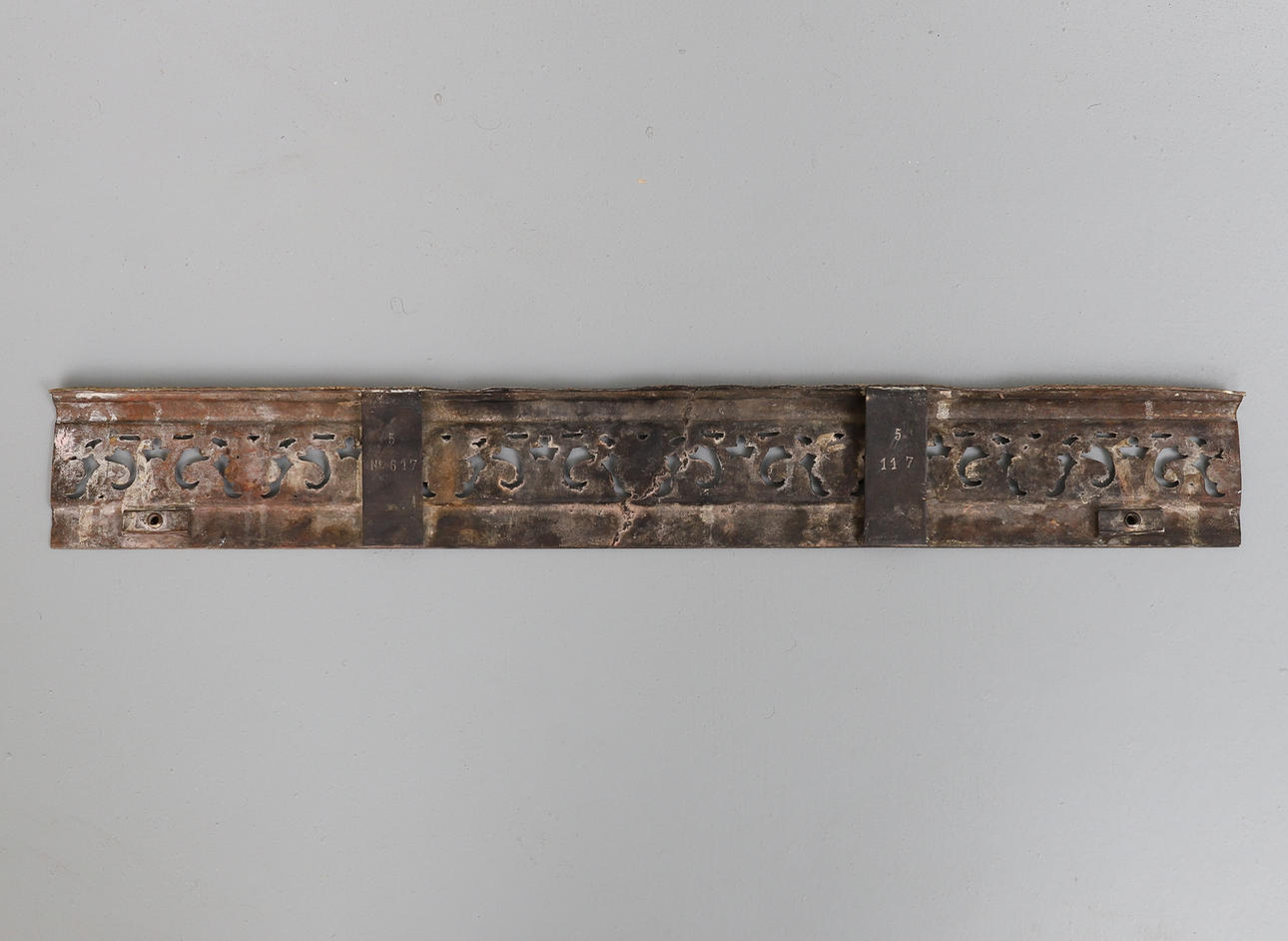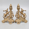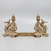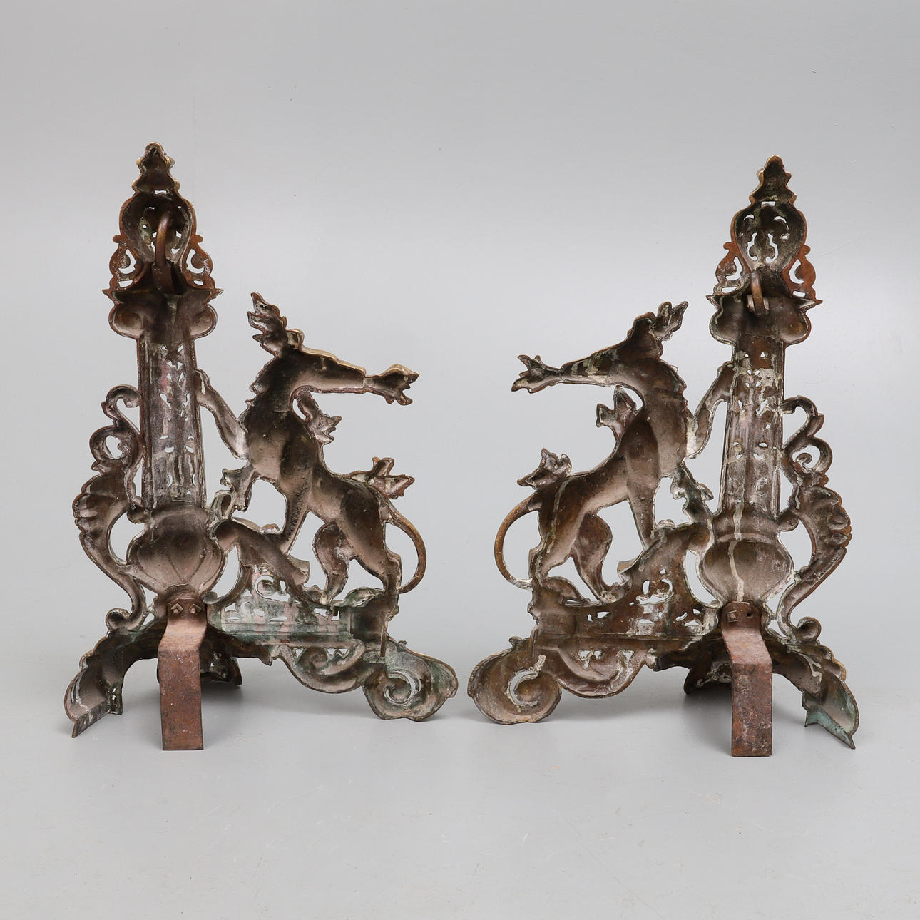 i 1600-talsstil, 19århundradet, varje gjuten med ett mytologiskt djur som andas eld och står bredvid en foliate- och rullgjuten och genomborrad kolonn med lediga sköldkartonger, flankerad av masker och bladrullar, på rullnings- och bladfötter centrerade av masker, länkad av en fender, bladgjuten och genomborrad och stämplad 5/Nej. 617 & 5/117, 128cm bred x 53cm hög.