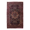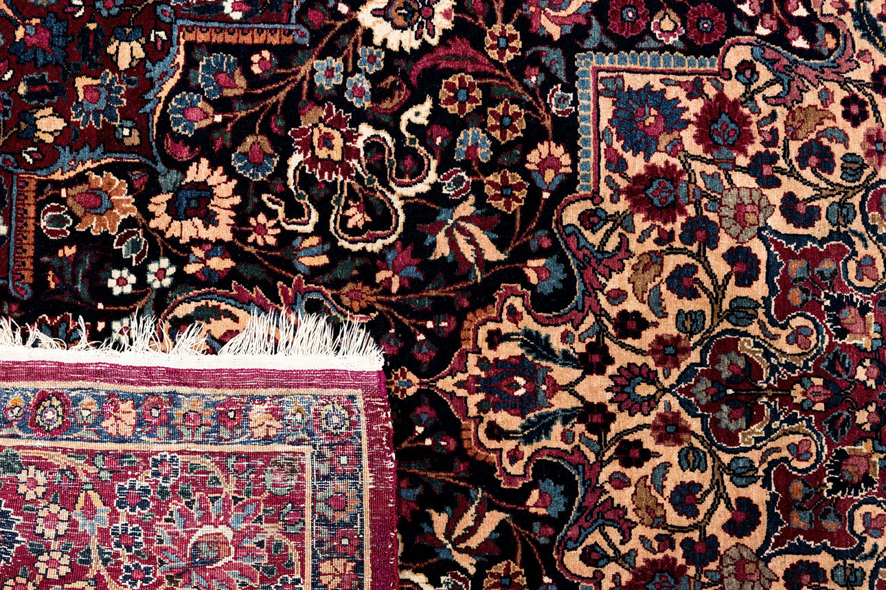 Mittmedaljong på blå botten. Röd bård. Mått 223x139 cm.