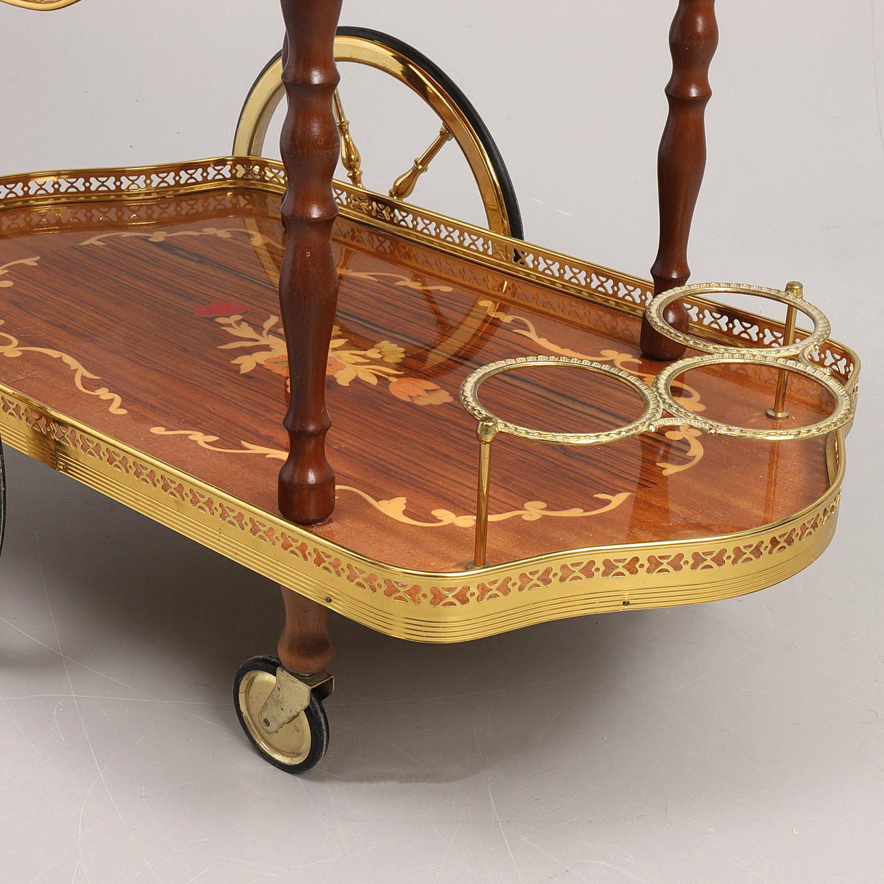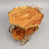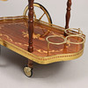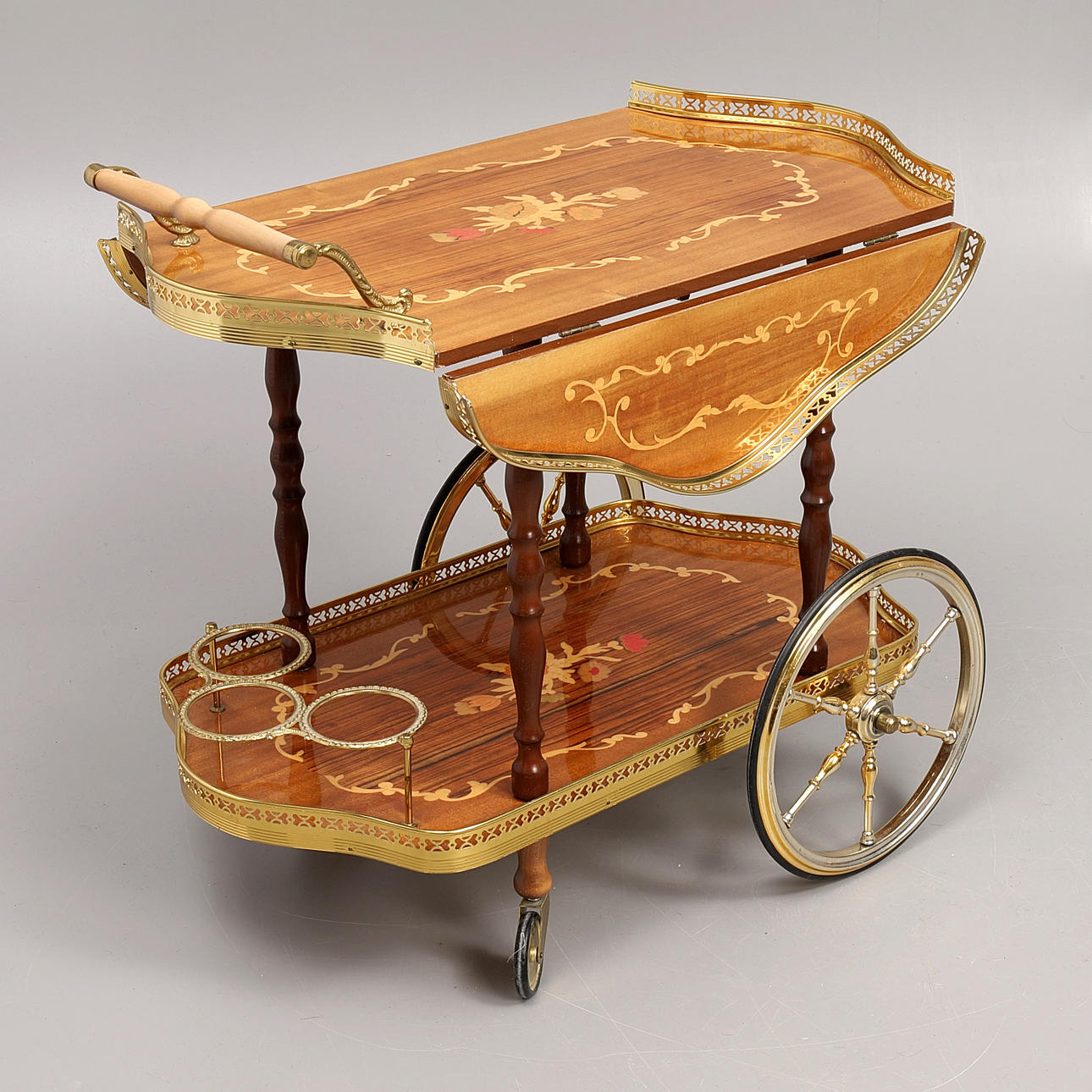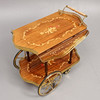 skivor med dekor av intarsia, mässingsdetaljer, ställ för tre flaskor, brickhöjd 63, bricka 77x42 alt 77x75 cm i utfälld form.