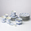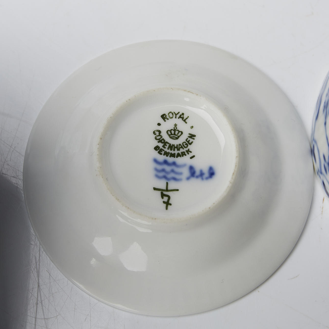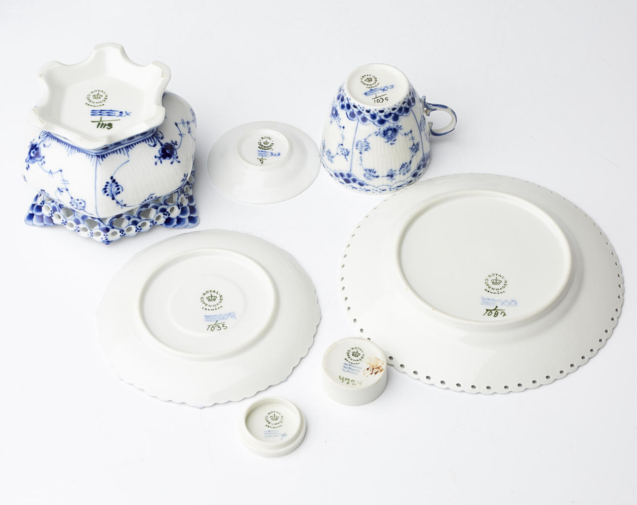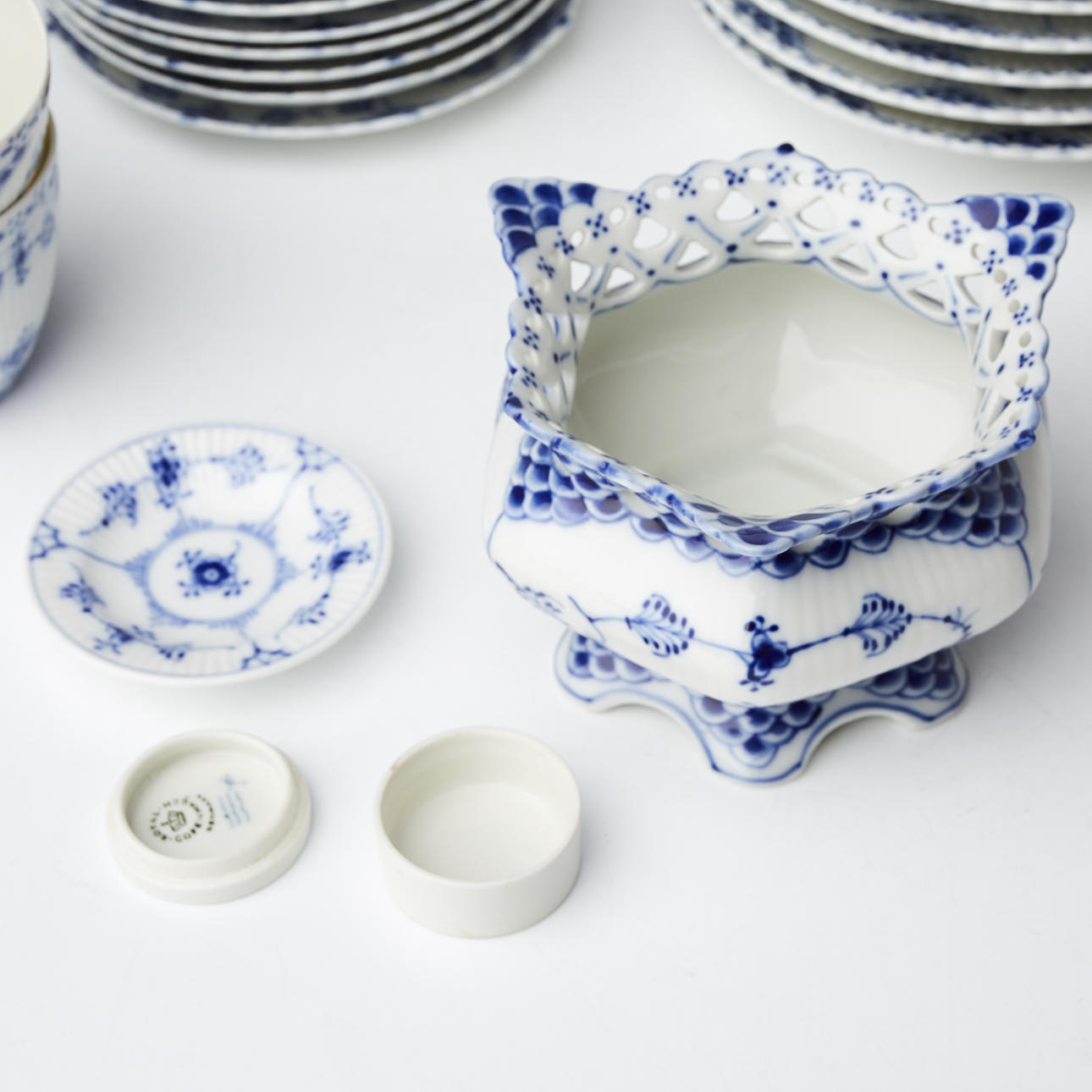 18 dlr, bestående av: 8 kaffekoppar med fat, halvblond (1/1035), 8 assietter, helblond, (1/1082), 1 sockerskål, helblond, (1/1113), 1 litet tillbehörsfat, (1/7), 1 liten burk med lock, Royal Copenhagen (4724).