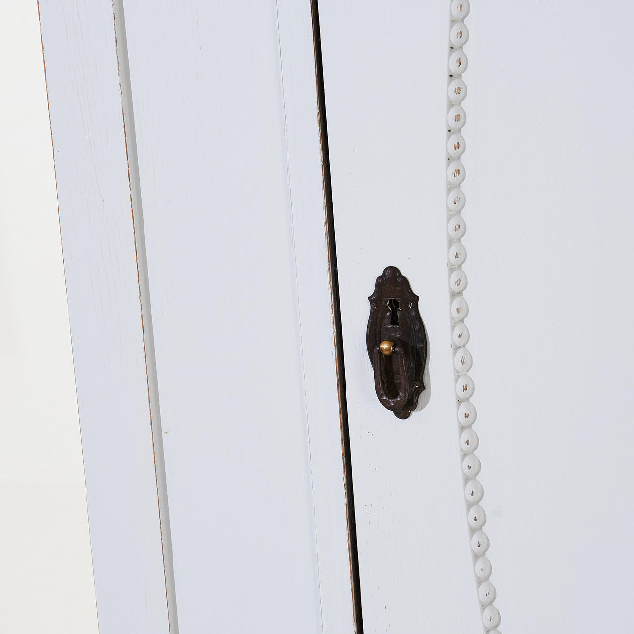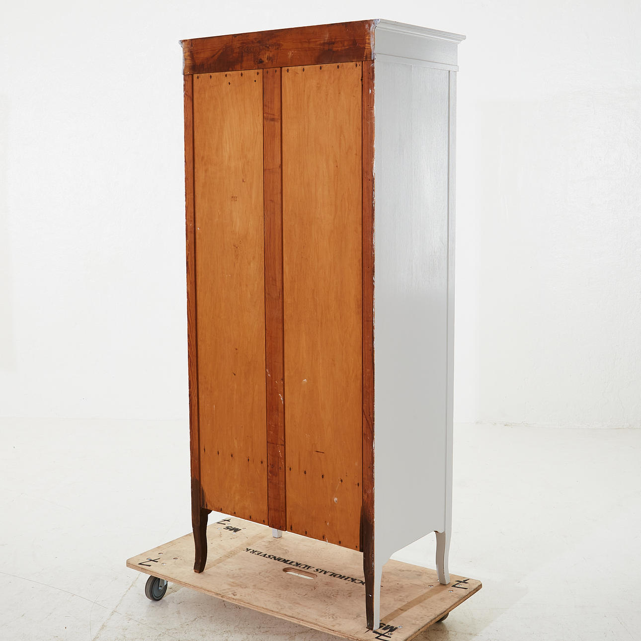 LINNESKÅP, tidigt 1900-tal, jugend, dörrlucka med infälld oval dekor, vitmålat, inredning med lösa hyllplan, höjd ca 194,5, 85,5x49 cm, nyckel medföljer.