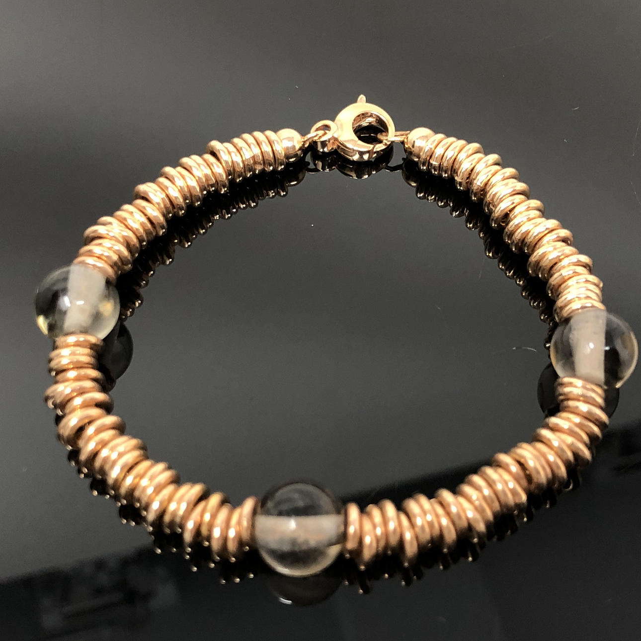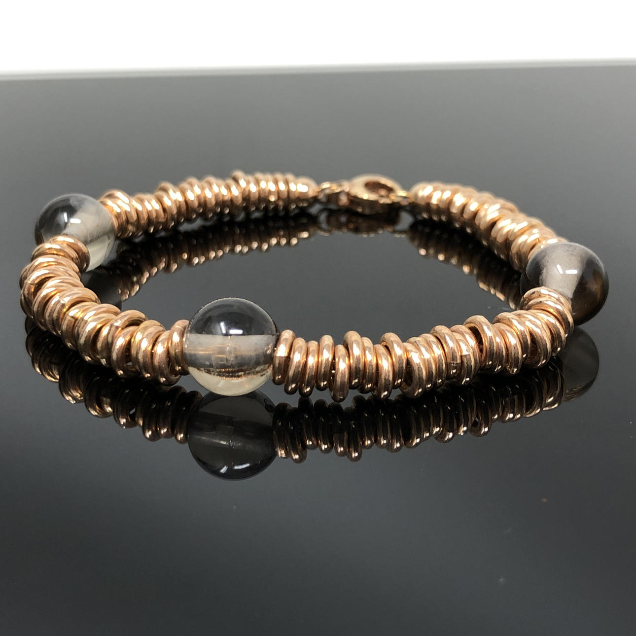 14kt armband. Roséguld/vitguld (stämplad). Set med 3 rökkvartsbollar, var och en med en diameter på ca..: 11mm cca: 21,00 ct.