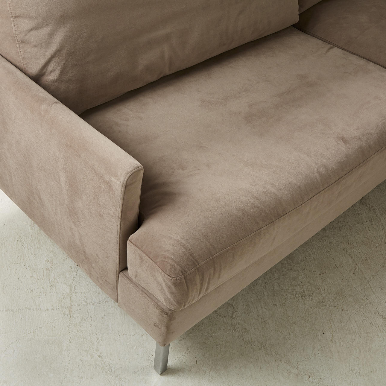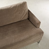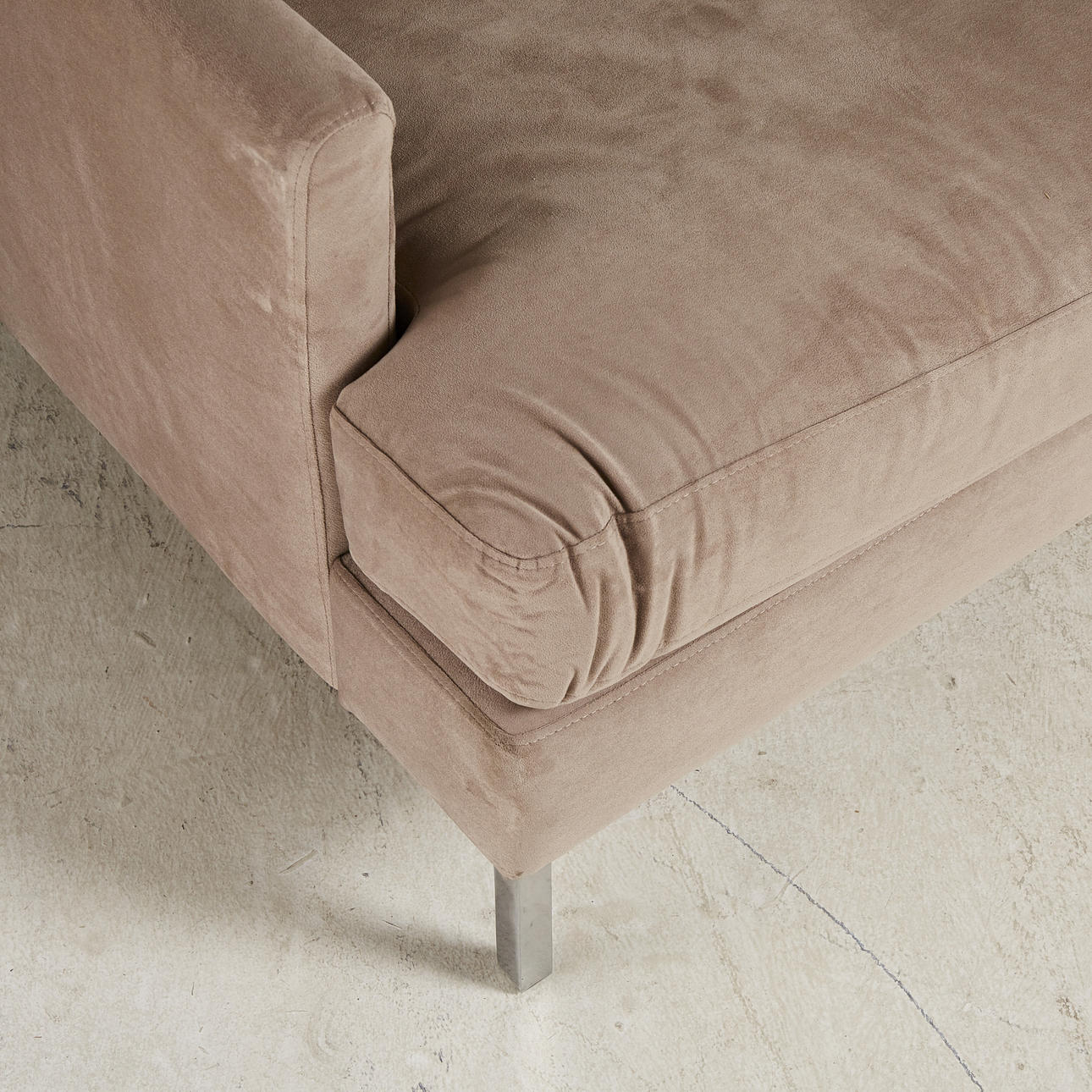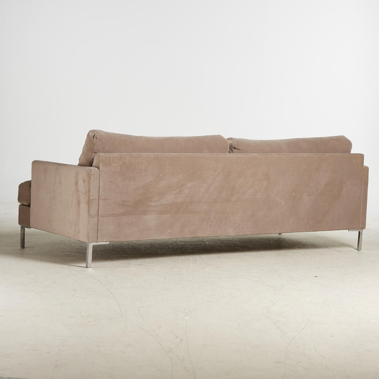Sammetssoffa, 2000-tal, Sverige, klädsel i grått sammet, lösa plymåer, hjultrissor i mässing, sitthöjd ca 38 cm, bredd ca 95 cm.