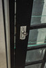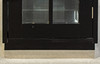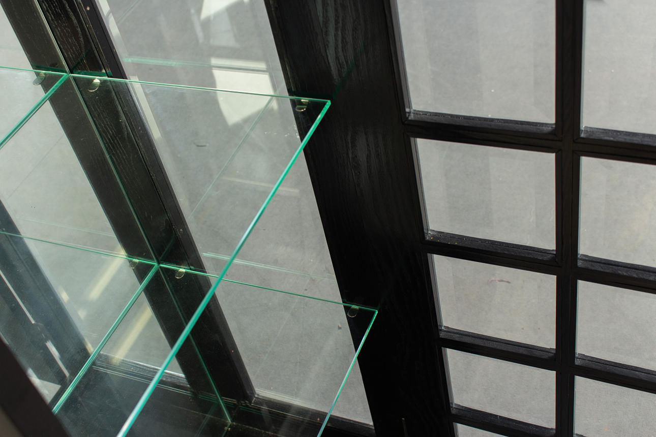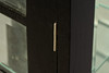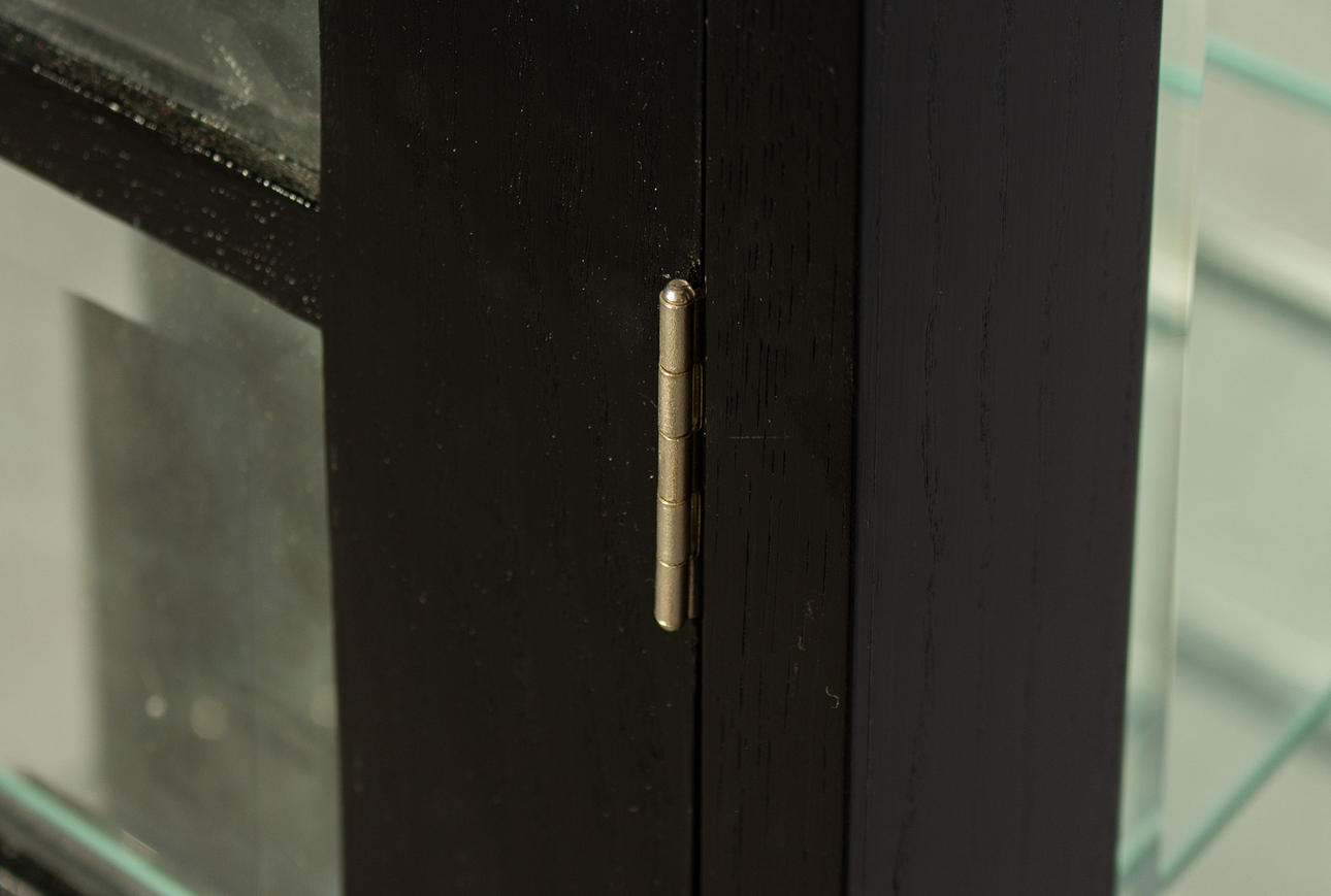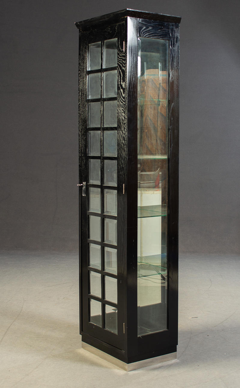 Schwaz glaserad kropp på något infälld metallremsa, glaserad på tre sidor. Rektangulära gallerstänger på dörren Kantskurna skivor Inuti, framför en speglad rygg, fyra glashyllor. HxBxD: 186,7 x 50 x 37 cm.