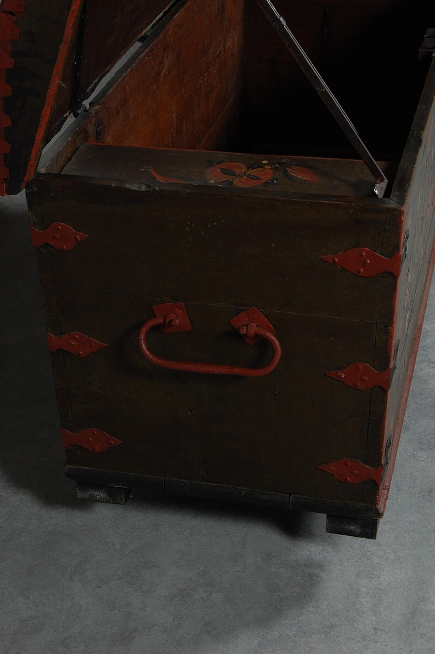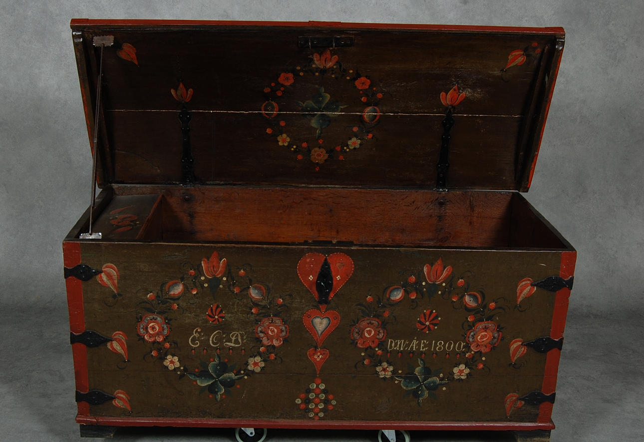 Ek, märkt E C D 1800, Längd 148, bredd 60, höjd 70 cm. Lås, nyckel finns.