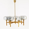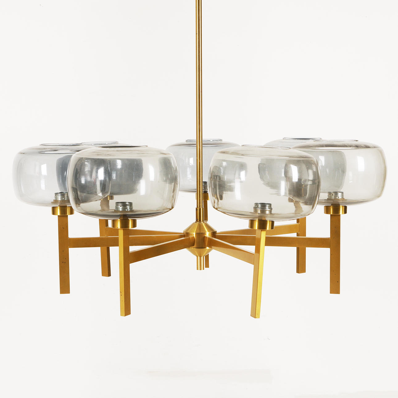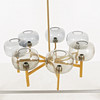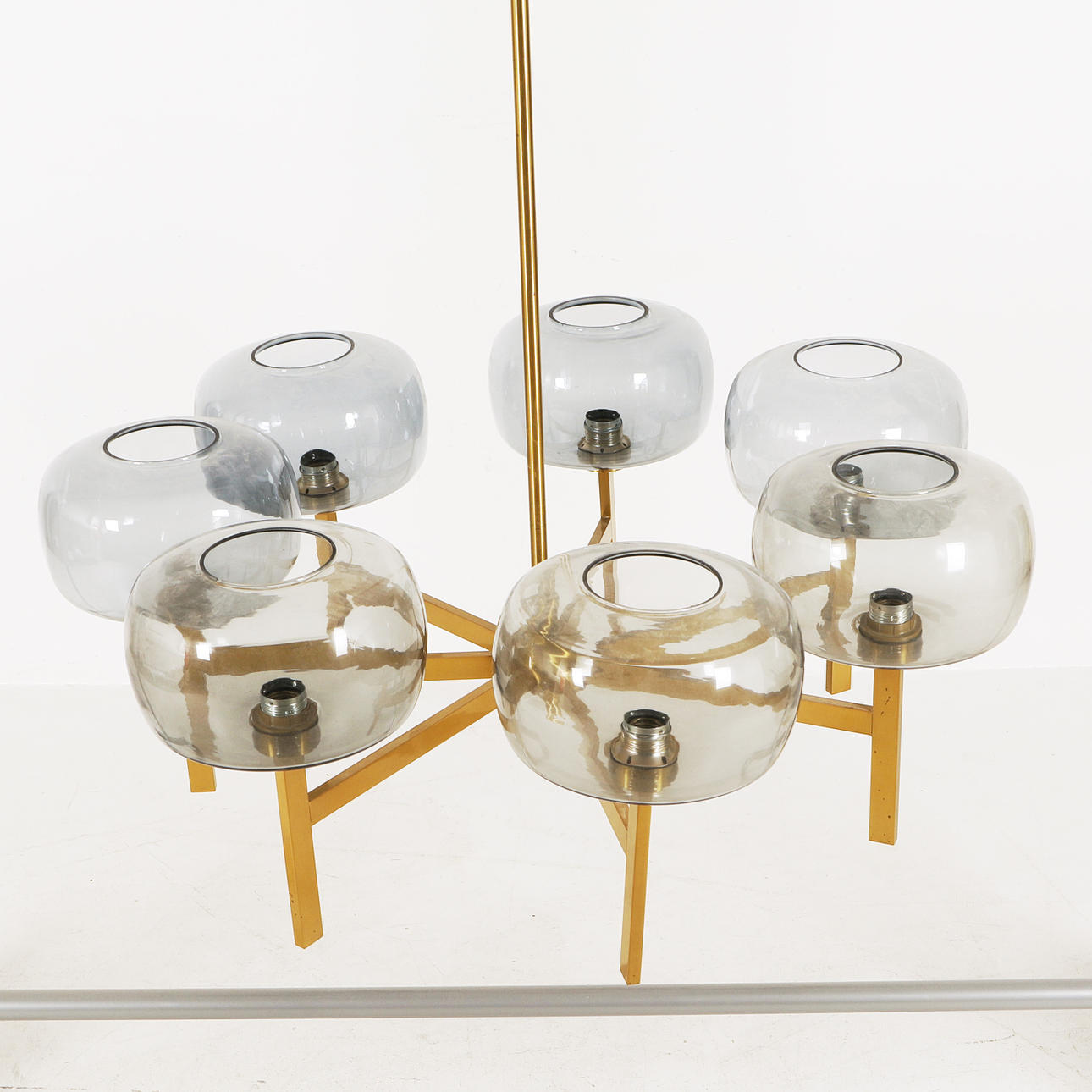 Stomme i mässing, rökfärgade kupor i glas, 7 ljuspunkter, höjd ca 94, diameter ca 94 cm.