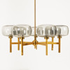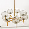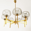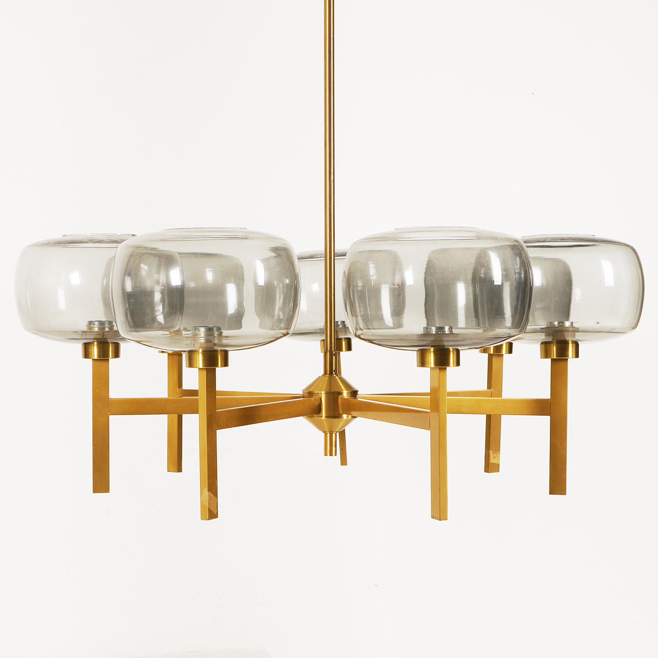Stomme i mässing, rökfärgade kupor i glas, 7 ljuspunkter, höjd ca 94, diameter ca 94 cm.