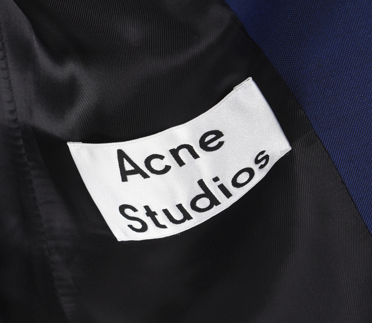 Acne klänning i ultramarin siden, storl L, längd ca 95 cm, Acne Studios kavaj i mörkblå ull och mohair, storl 38, rygglängd ca 67 cm, ärmlängd ca 62 cm.
