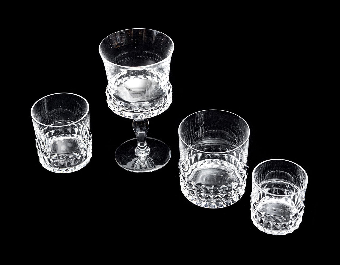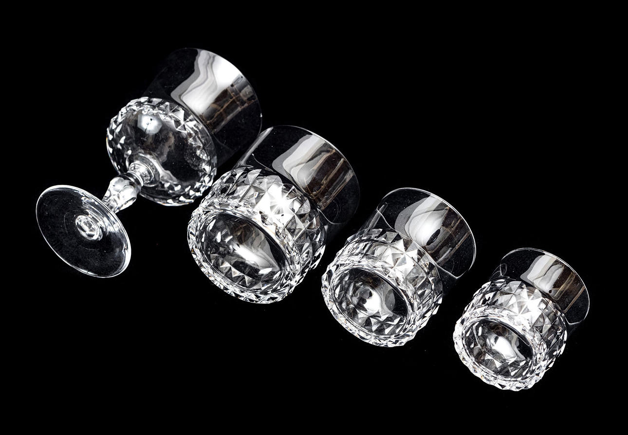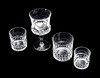 10 rödvinsglas höjd 14,5 cm, 11 whiskeyglas höjd 8 cm, 5 seltersglas höjd 7 cm samt 9 likörglas höjd 5,5 cm.
