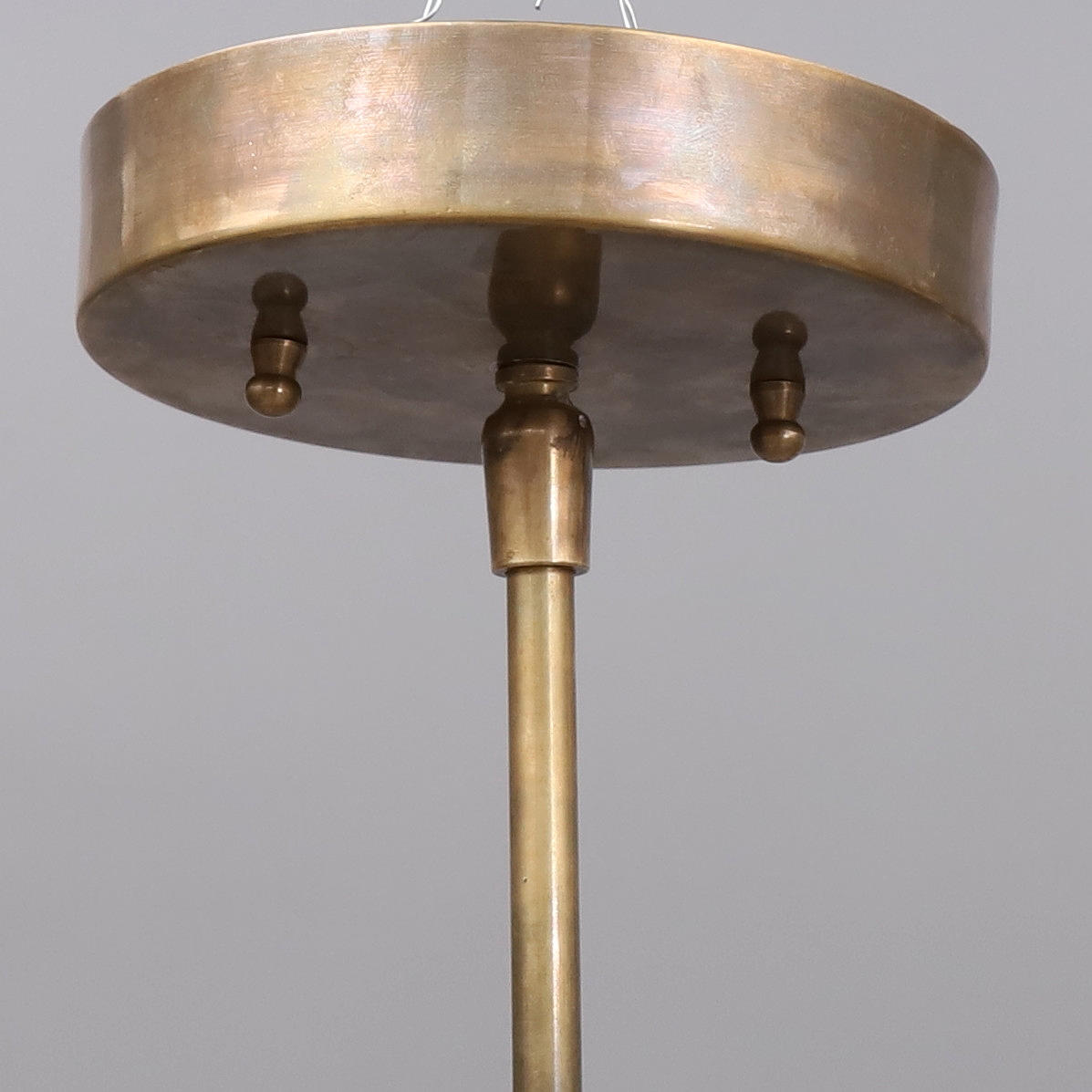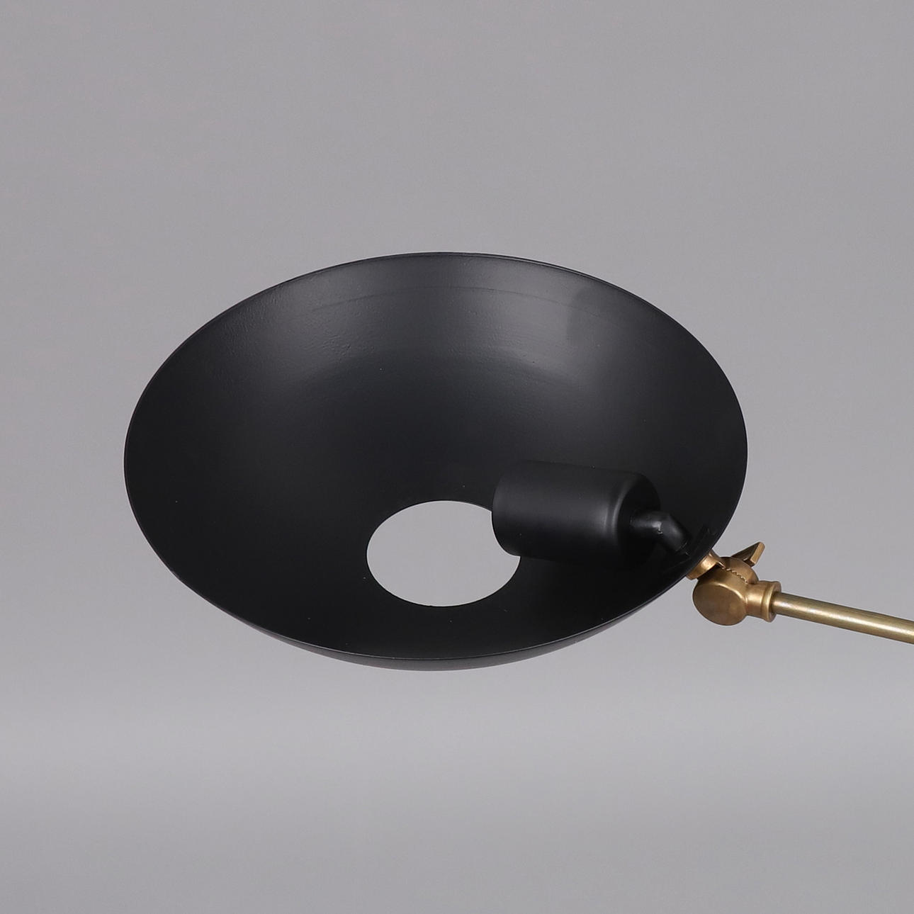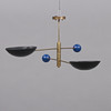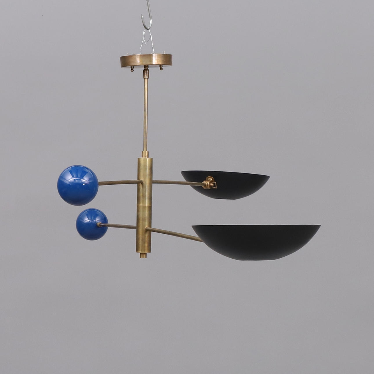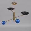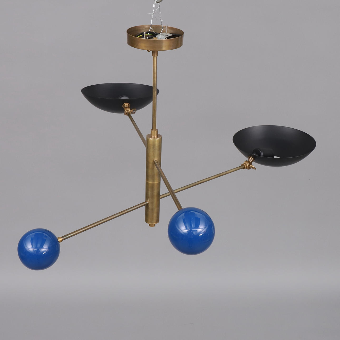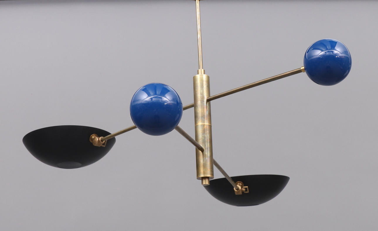 Stömme i mässing, svart skärm i metall, balanskulor i blåemaljerad mässing, två ljuspunkter, E27
